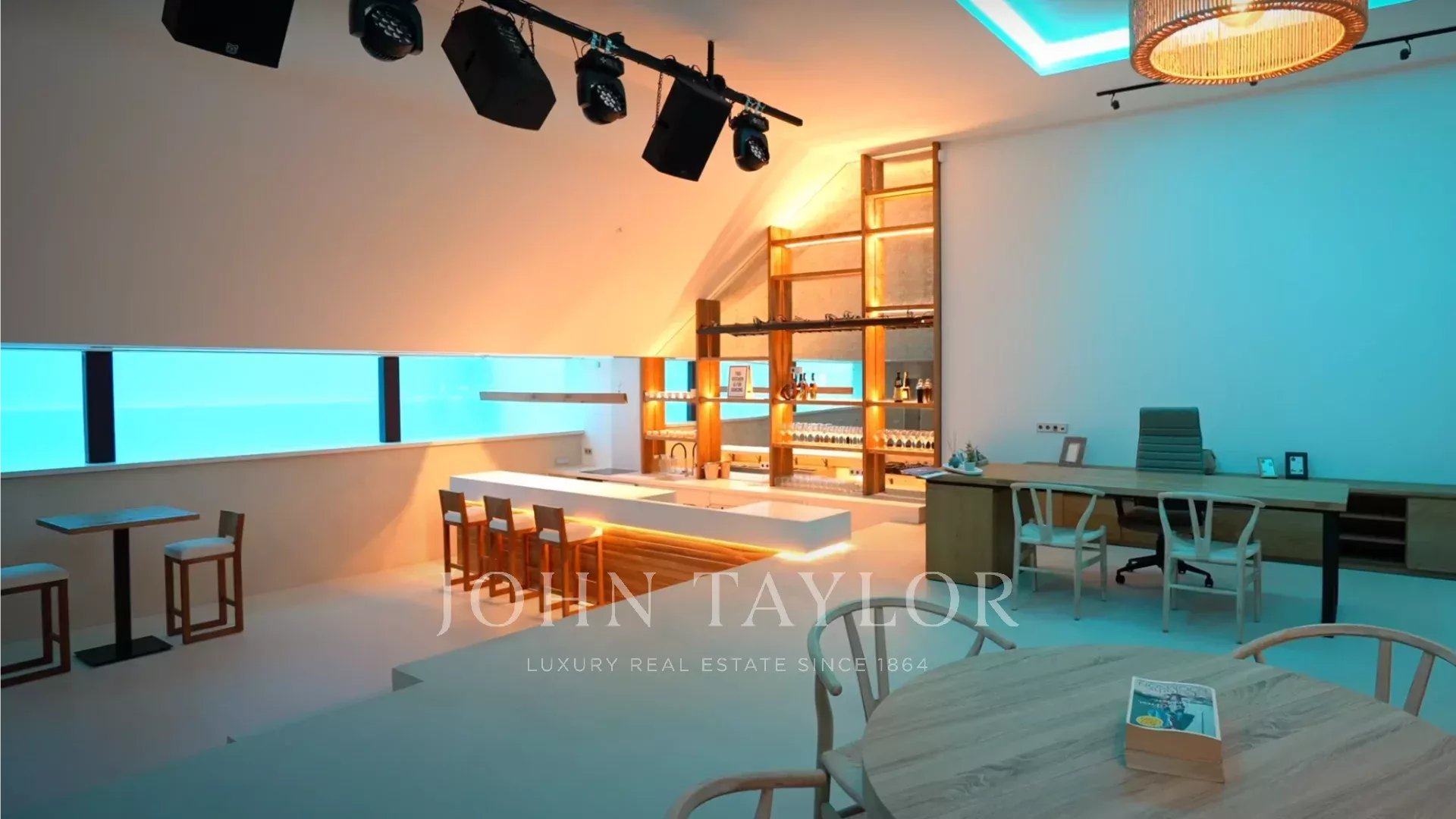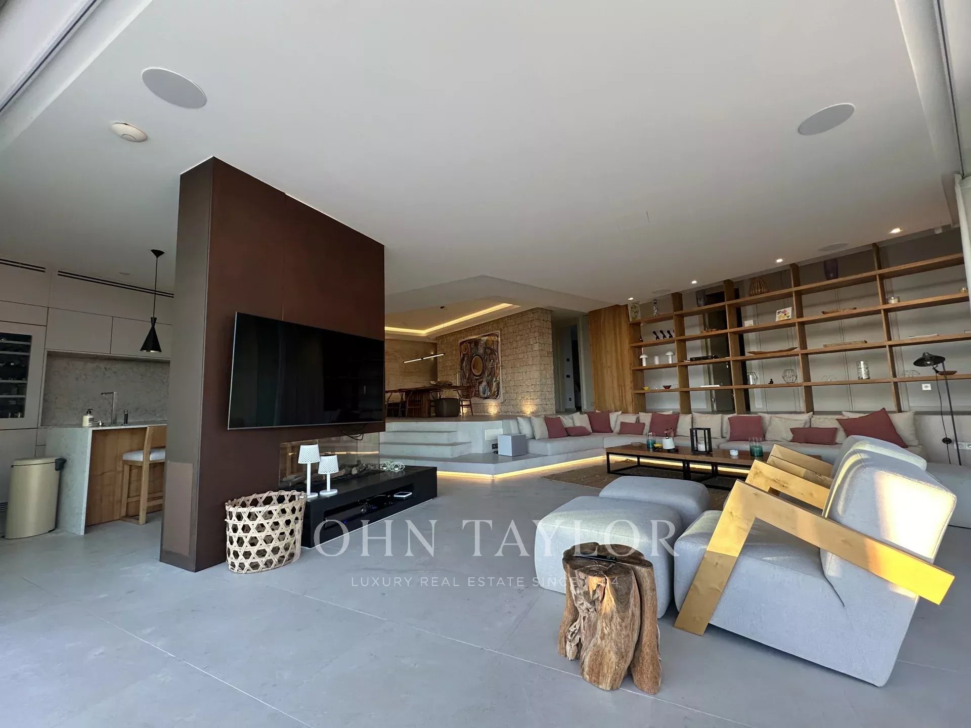 El espacio de concepto abierto combina un comedor, un acogedor salón con chimenea y una cocina de alta gama equipada con electrodomésticos Gaggenau. Ventanales del suelo al techo integran sin esfuerzo el interior con el exterior, que da paso a una terraza con piscina, tumbonas y un bar al aire libre.
