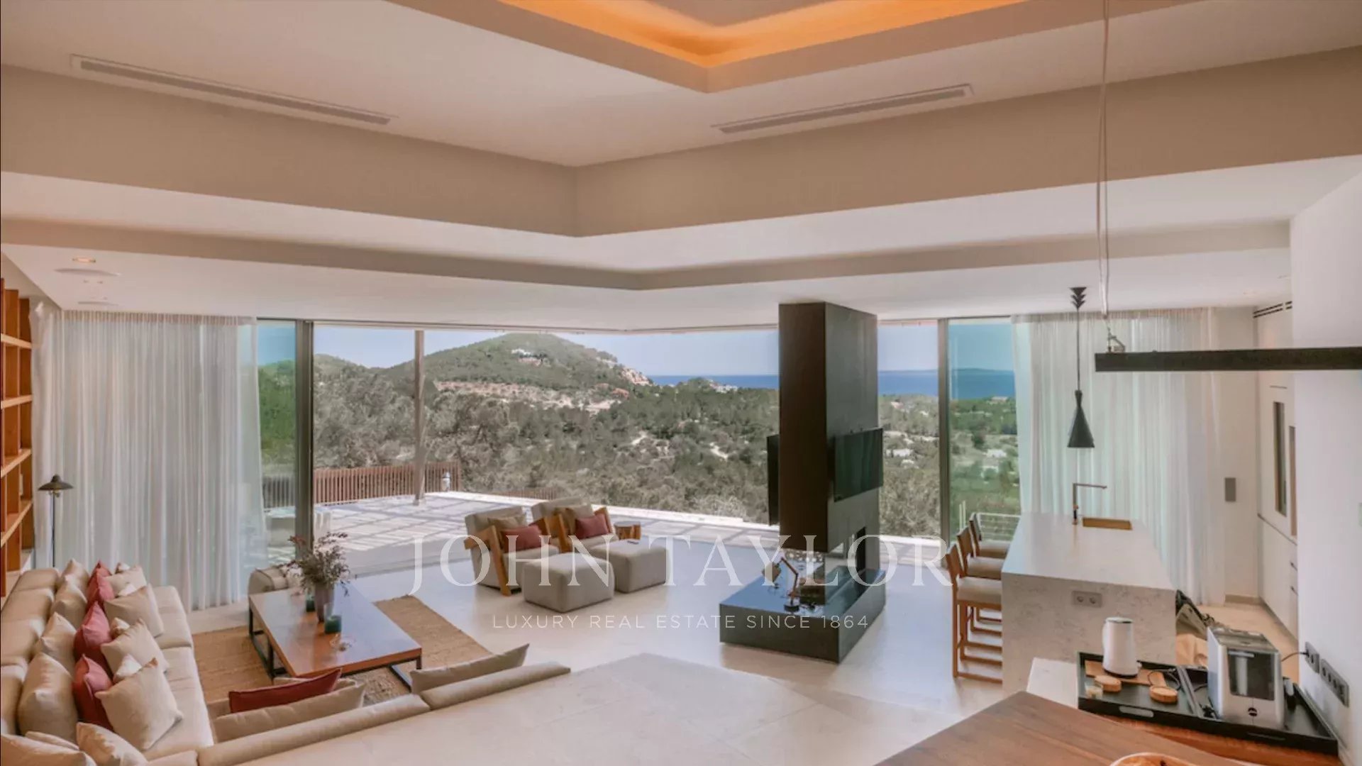 Con paredes de piedra natural y cálidos detalles en madera, la villa emana una atmósfera acogedora y sofisticada. Ofrece vistas panorámicas impresionantes al azul del mar Mediterráneo, el casco histórico de Dalt Vila y la idílica isla de Formentera desde casi todos los rincones de la casa.