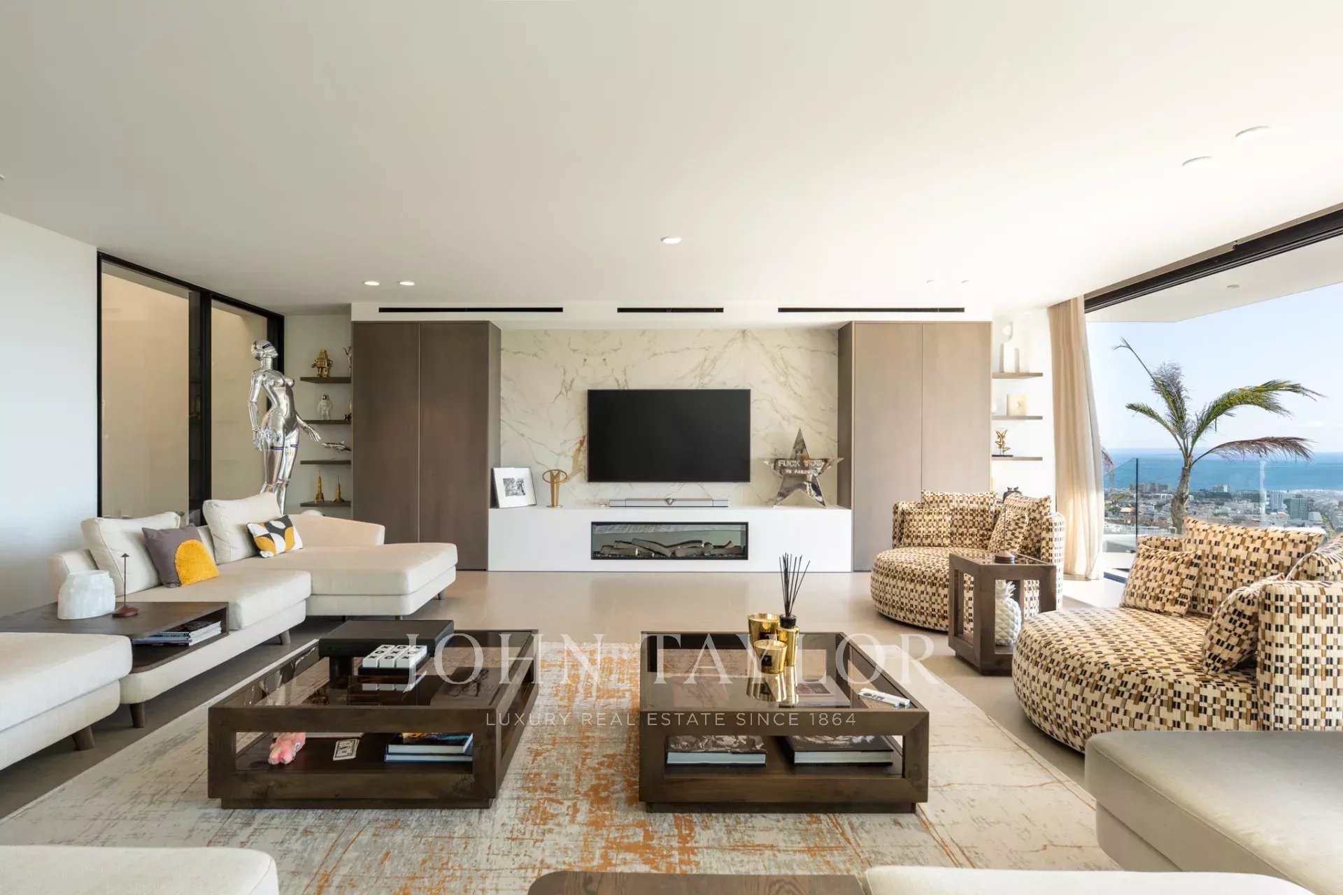 Entre sus equipamientos destacan una puerta corredera panorámica motorizada, persianas y cortinas eléctricas, un toldo de 15 × 4,5 m para la terraza principal y un garaje para cinco vehículos. Además, la villa cuenta con ascensor, combinando lujo y comodidad en cada detalle.