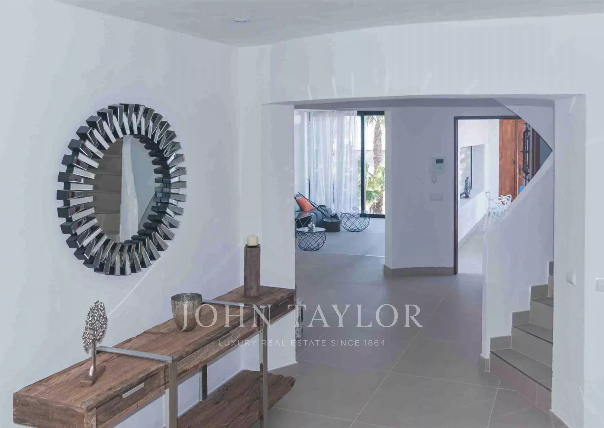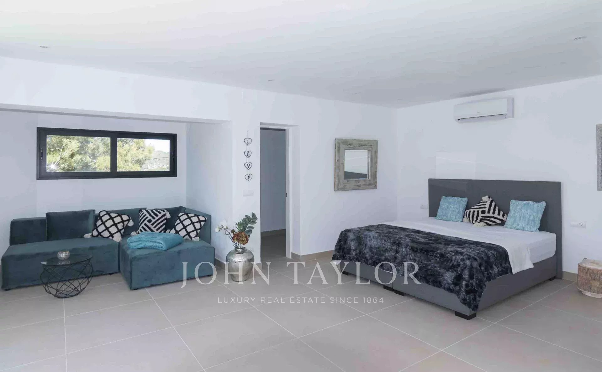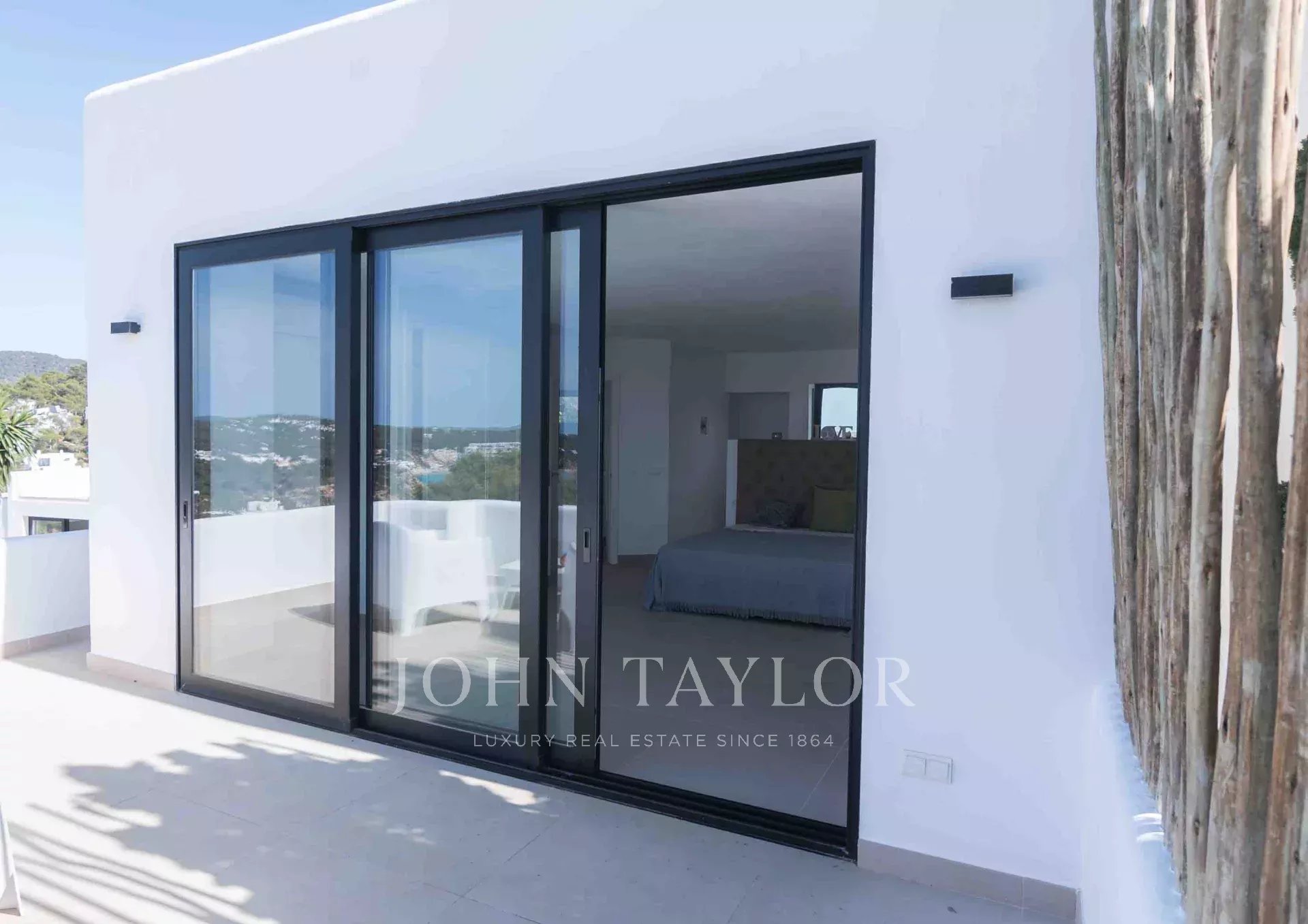 La zona exterior comprende varias terrazas que cubren 640 m2 de superficies embaldosadas. El grupo central de árboles centenarios encierra una ducha exterior de agua caliente, impartiendo una sensación de libertad. Desde la piscina infinita elevada, se puede disfrutar de unas vistas espectaculares de Cala Tarida, rodeada de acogedores espacios al aire libre para tomar el sol, sentarse y relajarse.
