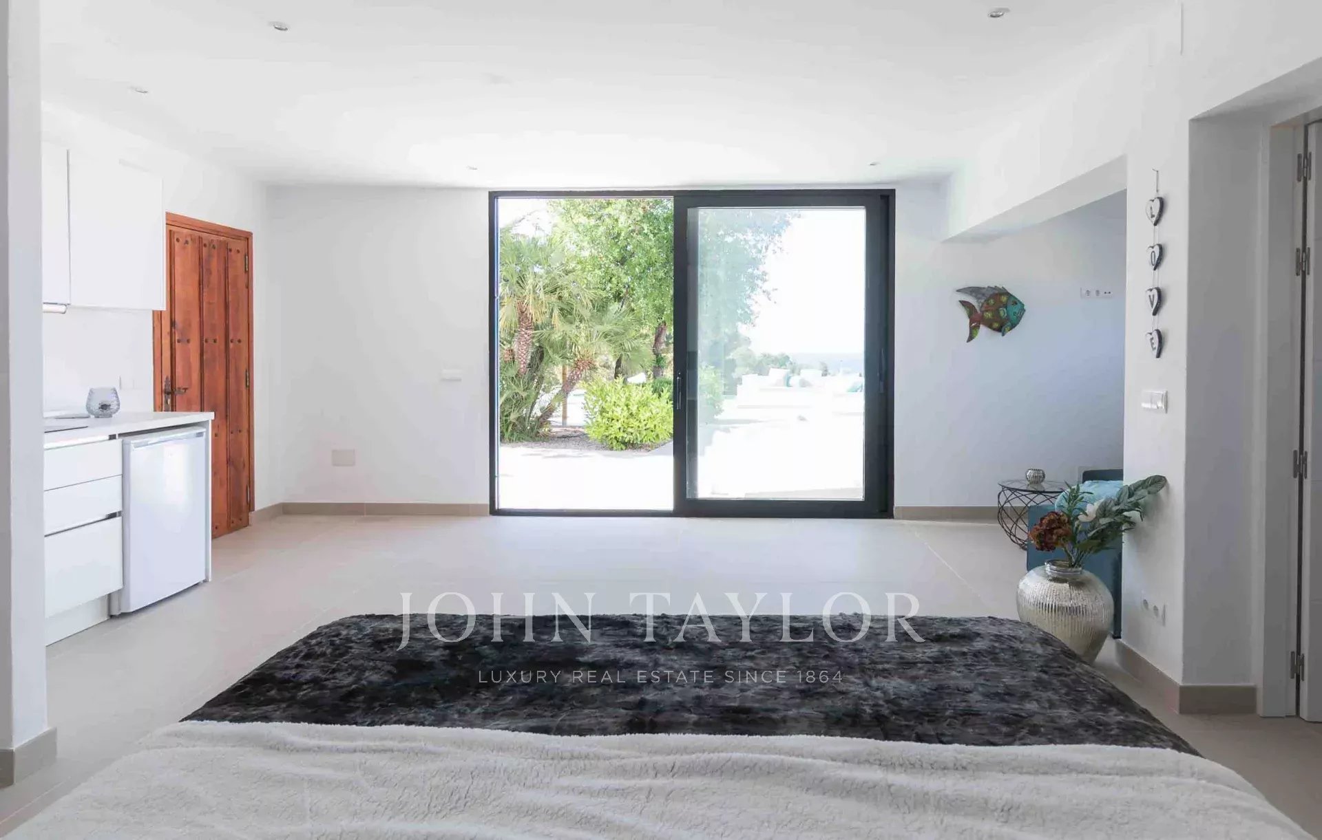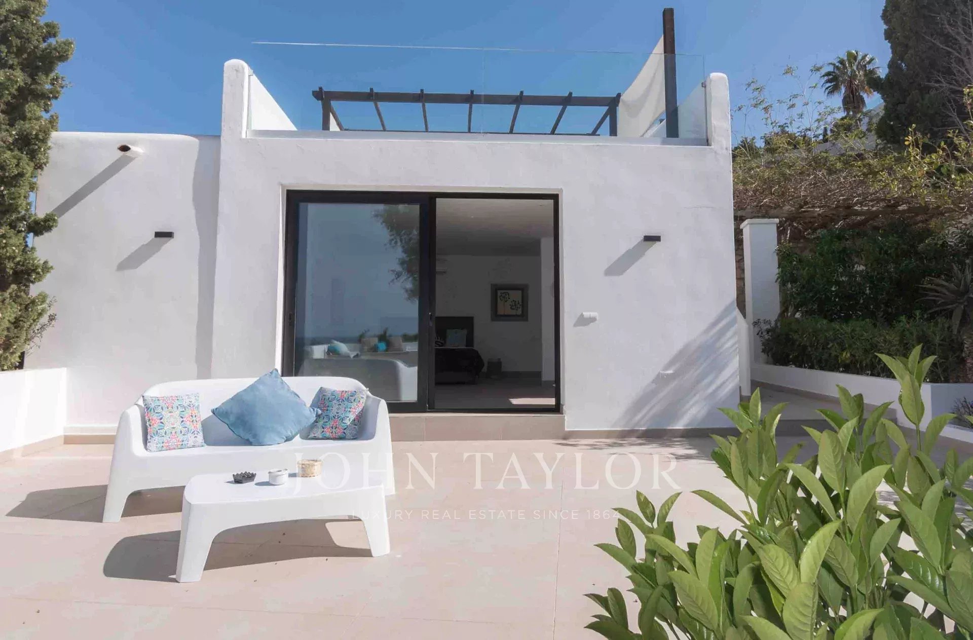 El amplio jardín bajo las terrazas, adornado con pinos centenarios, confiere a la propiedad el "toque ibicenco" por excelencia. Detrás de la casa principal se encuentra el idílico antiguo "jardín del granjero", que crea un ambiente sereno bajo la copa de los árboles.