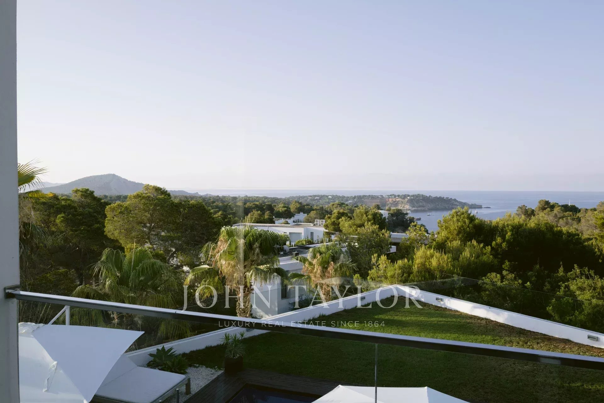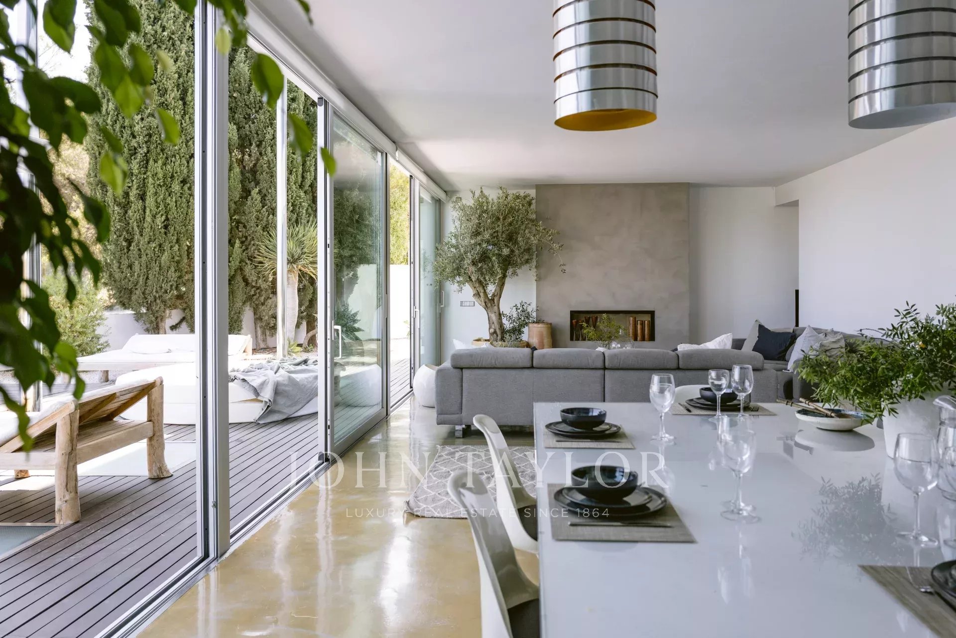Construida recientemente con materiales de alta calidad y un diseño moderno, la villa cuenta con una superficie construida de 765 m² sobre una parcela de 1.168 m². Su arquitectura limpia y elegante ha sido pensada para maximizar la luz natural y las vistas, integrándose armoniosamente con el entorno ibicenco.