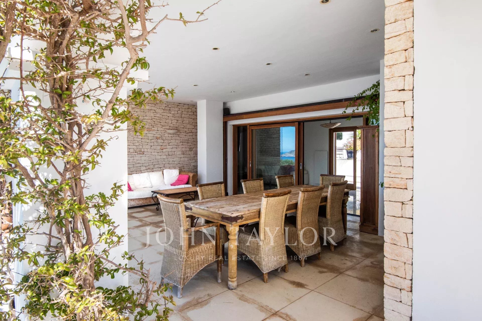 No hay otra propiedad en Ibiza con vistas comparables. Desde 10 terrazas, un hermoso jardín y desde todas las habitaciones se ven 360 grados del Océano Mediterráneo con todos los barcos que pasan. Usted ve incluso Mallorca, también toda la isla de Ibiza. La propiedad tiene una fantástica piscina infinita, un lugar de Yoga y una pista deportiva.