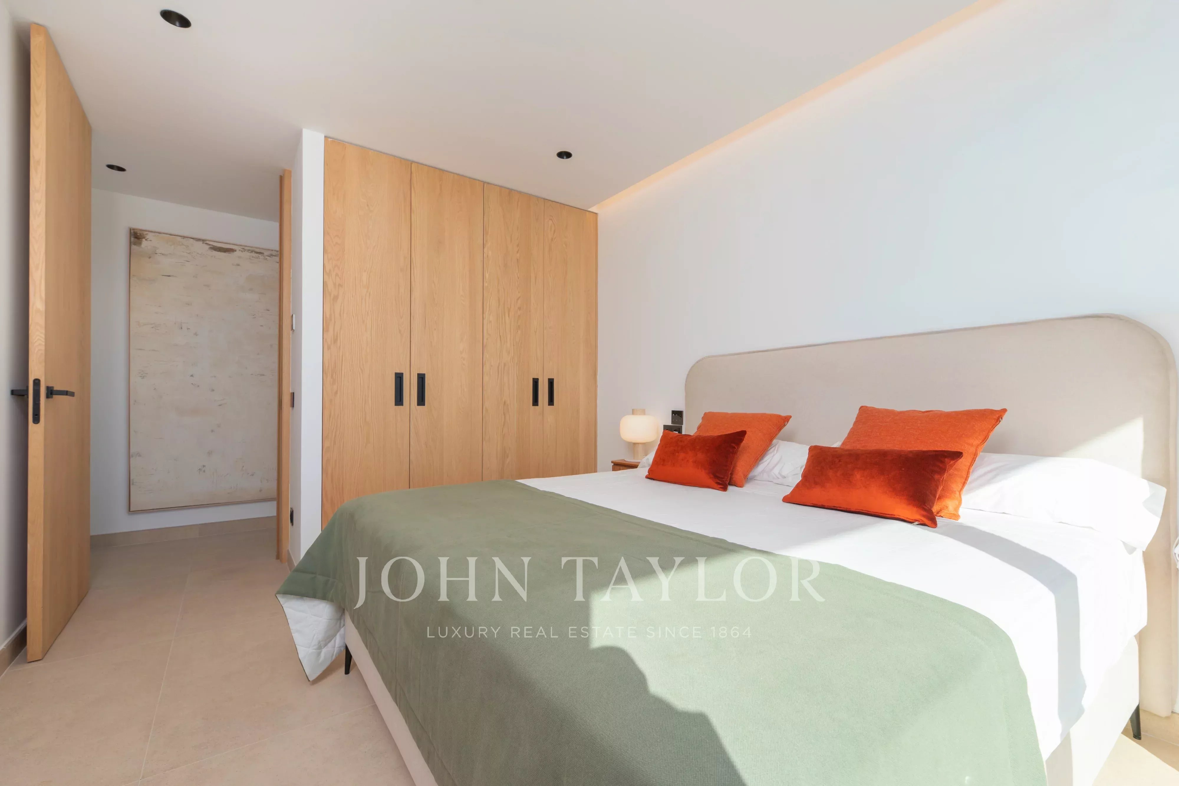 La planta superior alberga tres dormitorios, todos con baño en suite, garantizando privacidad y confort. El dormitorio principal dispone además de vestidor. Los tres dormitorios tienen acceso directo a una amplia terraza con vistas abiertas al campo, a la piscina y con un ligero toque de vistas al mar.