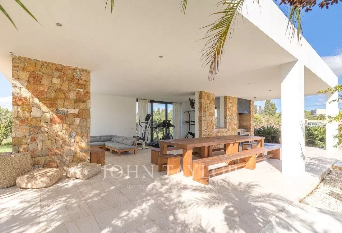 En la zona exterior de la villa hay una piscina con acceso tipo playa, ducha exterior, tumbonas, un baño completo con ducha, zona de barbacoa y mesa con capacidad para 20 personas, un salón exterior con TV y una zona de deportes.