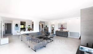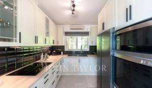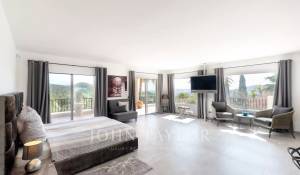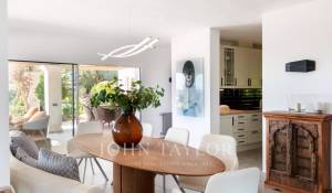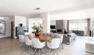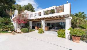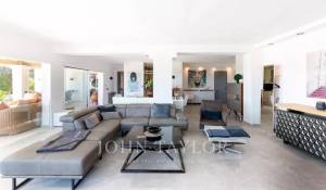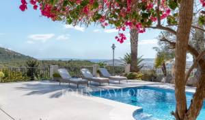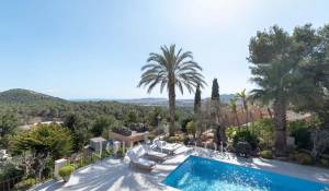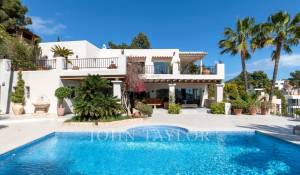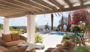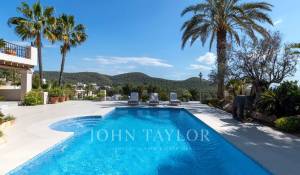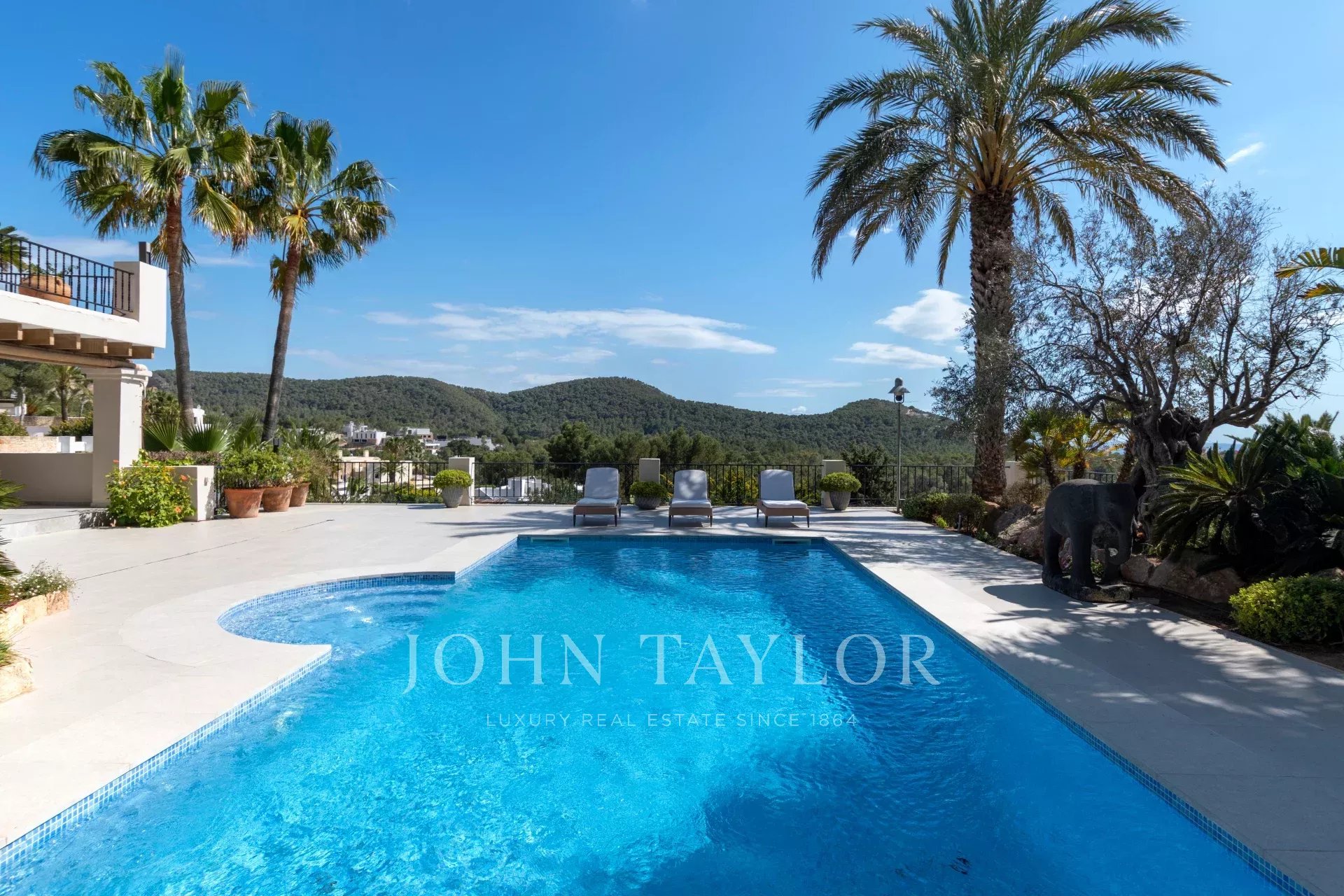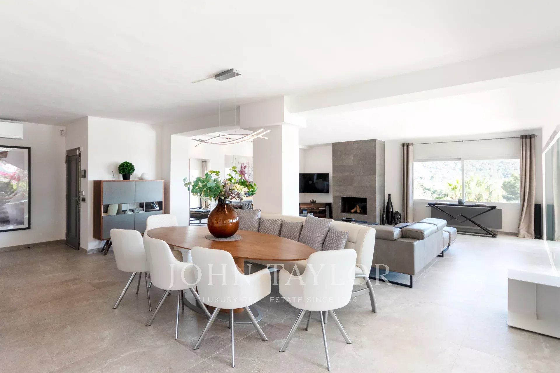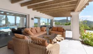 El espacioso salón-comedor brinda acceso a una amplia terraza con piscina, así como impresionantes vistas a las montañas y a Ibiza. La cocina, de diseño abierto pero discretamente ubicada, agrega un toque moderno y funcional al espacio.