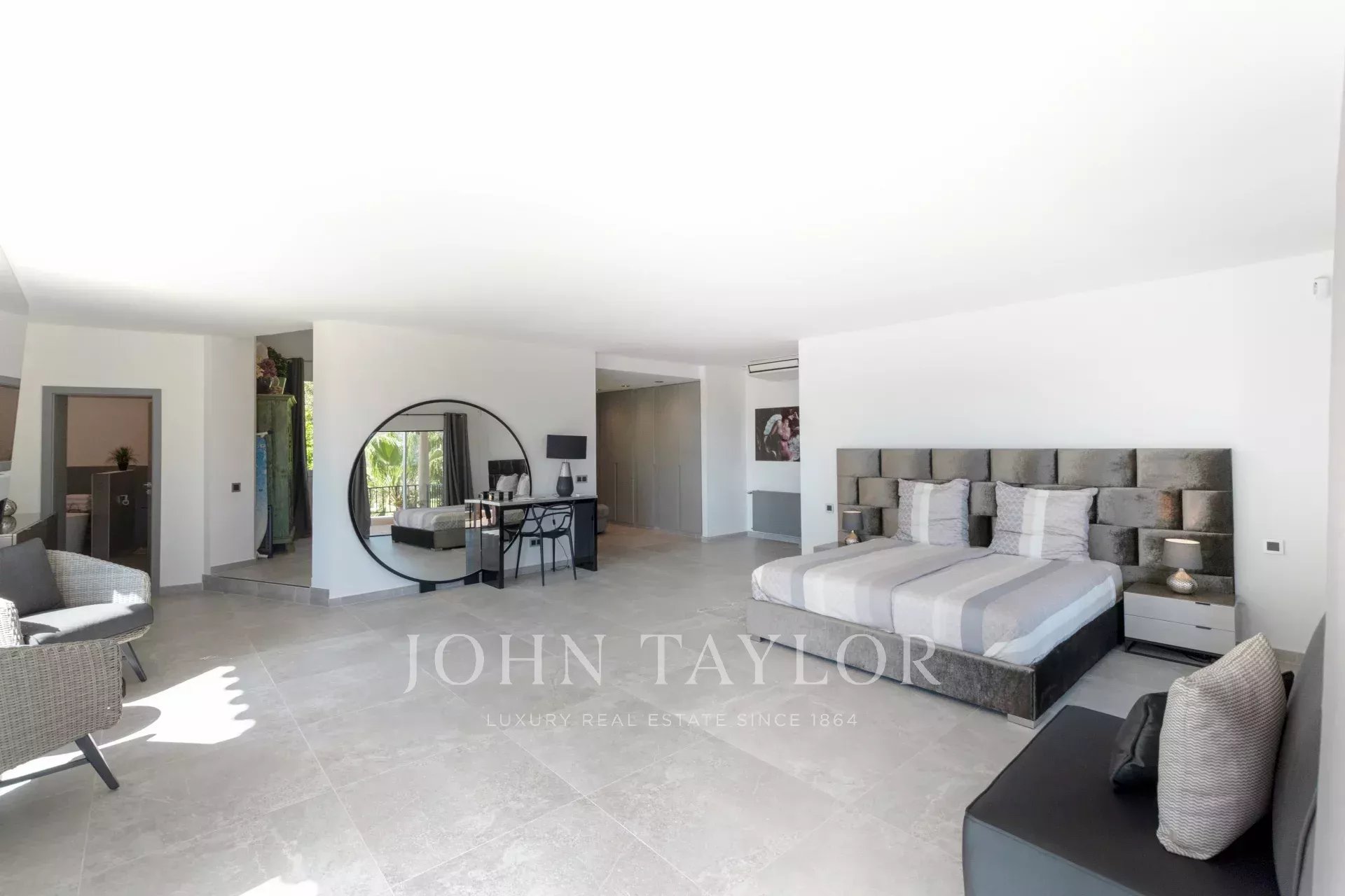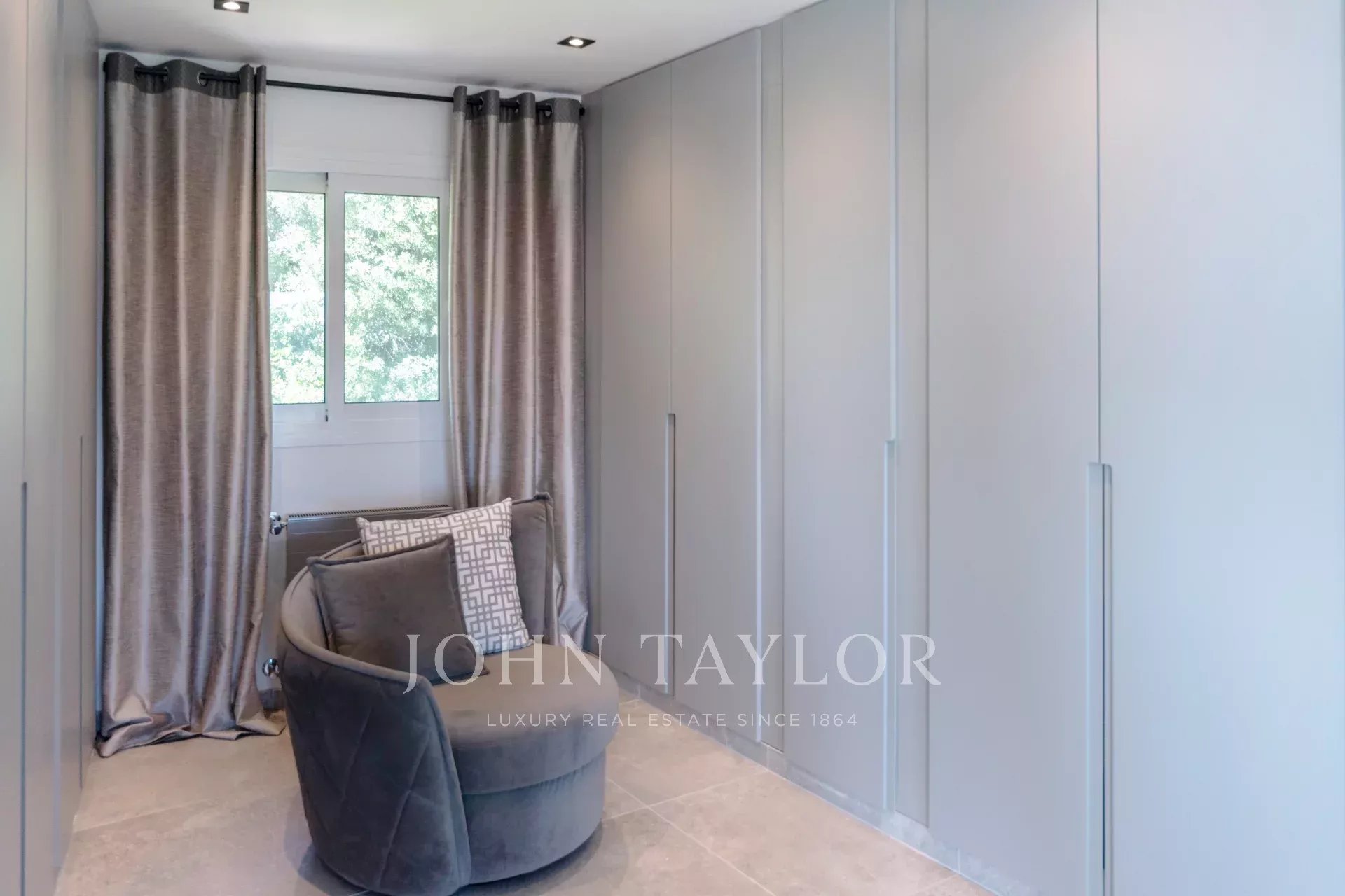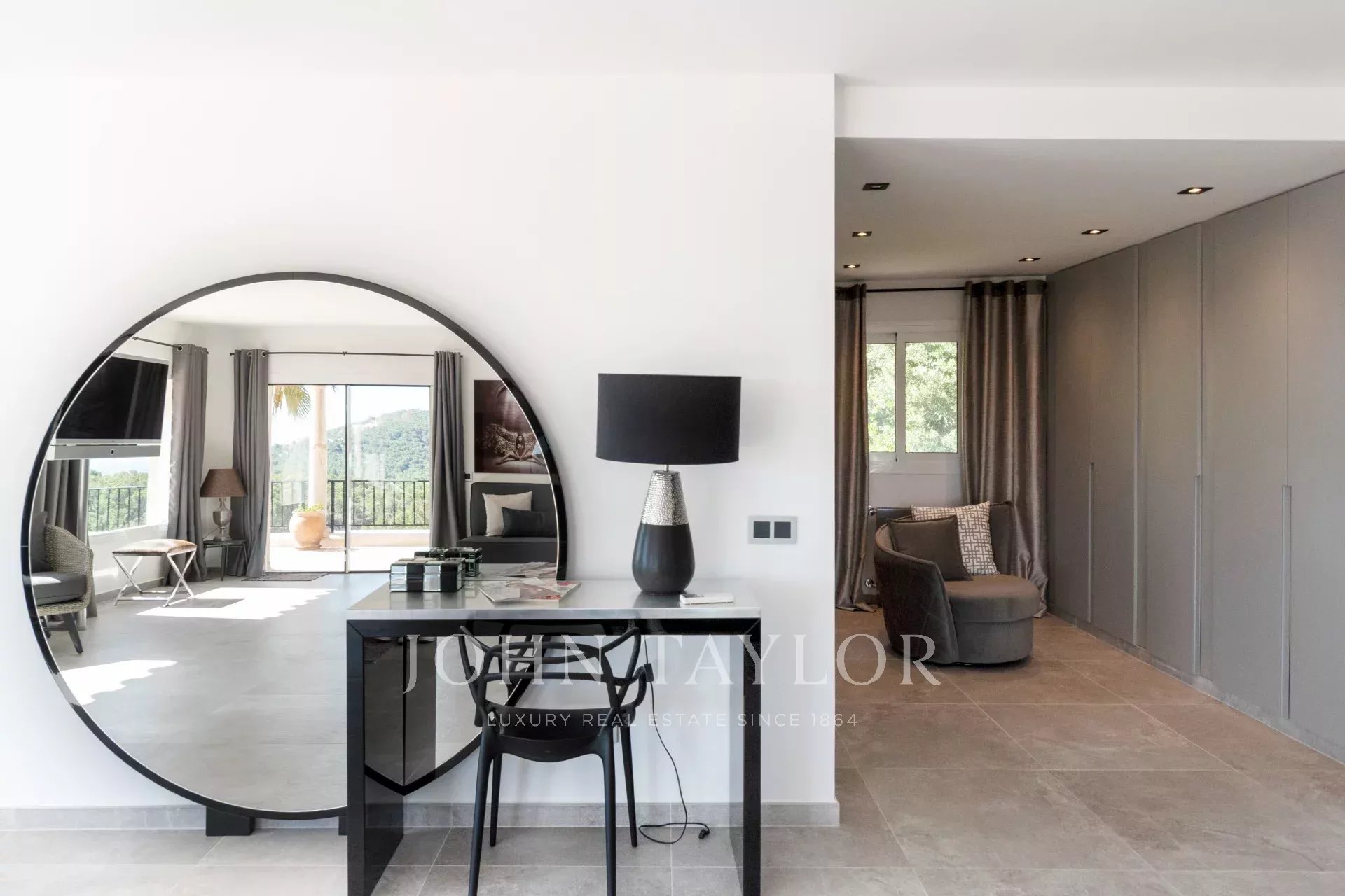 En la planta principal, una habitación doble permite el acceso directo a la piscina, mientras que en el nivel superior, se encuentra una suite principal de ensueño con una terraza que ofrece vistas panorámicas de toda la urbanización de Can Furnet, la cual cuenta con seguridad las 24 horas.