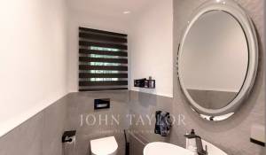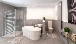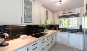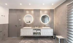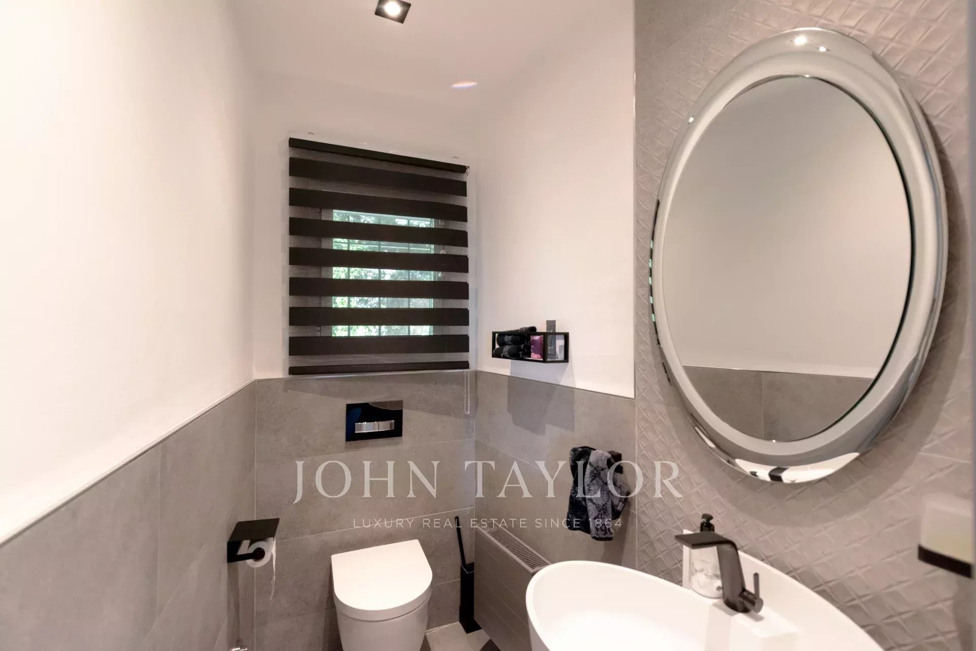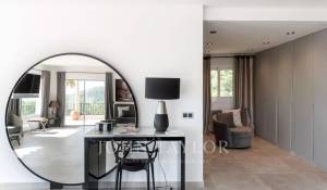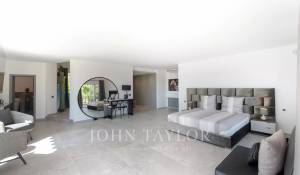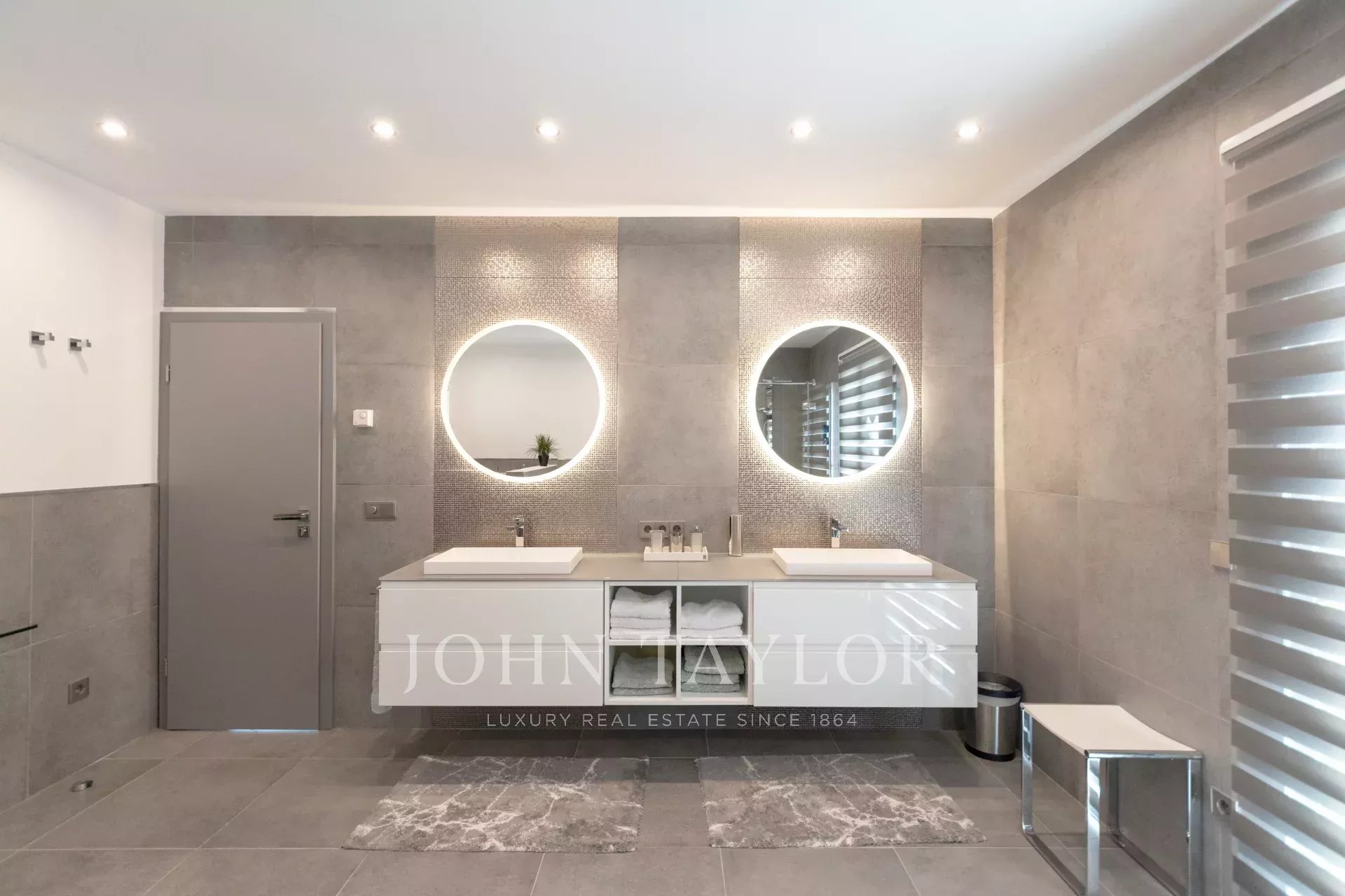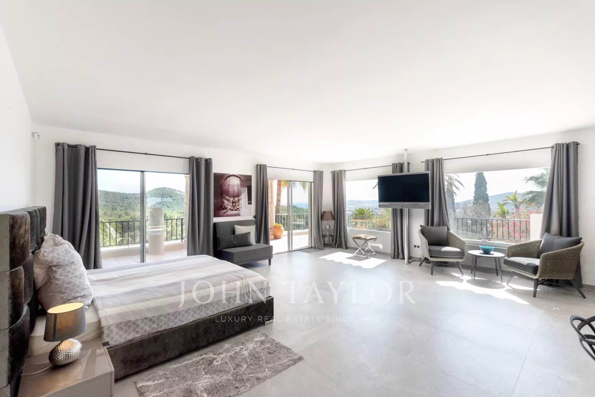 En la planta principal, una habitación doble permite el acceso directo a la piscina, mientras que en el nivel superior, se encuentra una suite principal de ensueño con una terraza que ofrece vistas panorámicas de toda la urbanización de Can Furnet, la cual cuenta con seguridad las 24 horas.