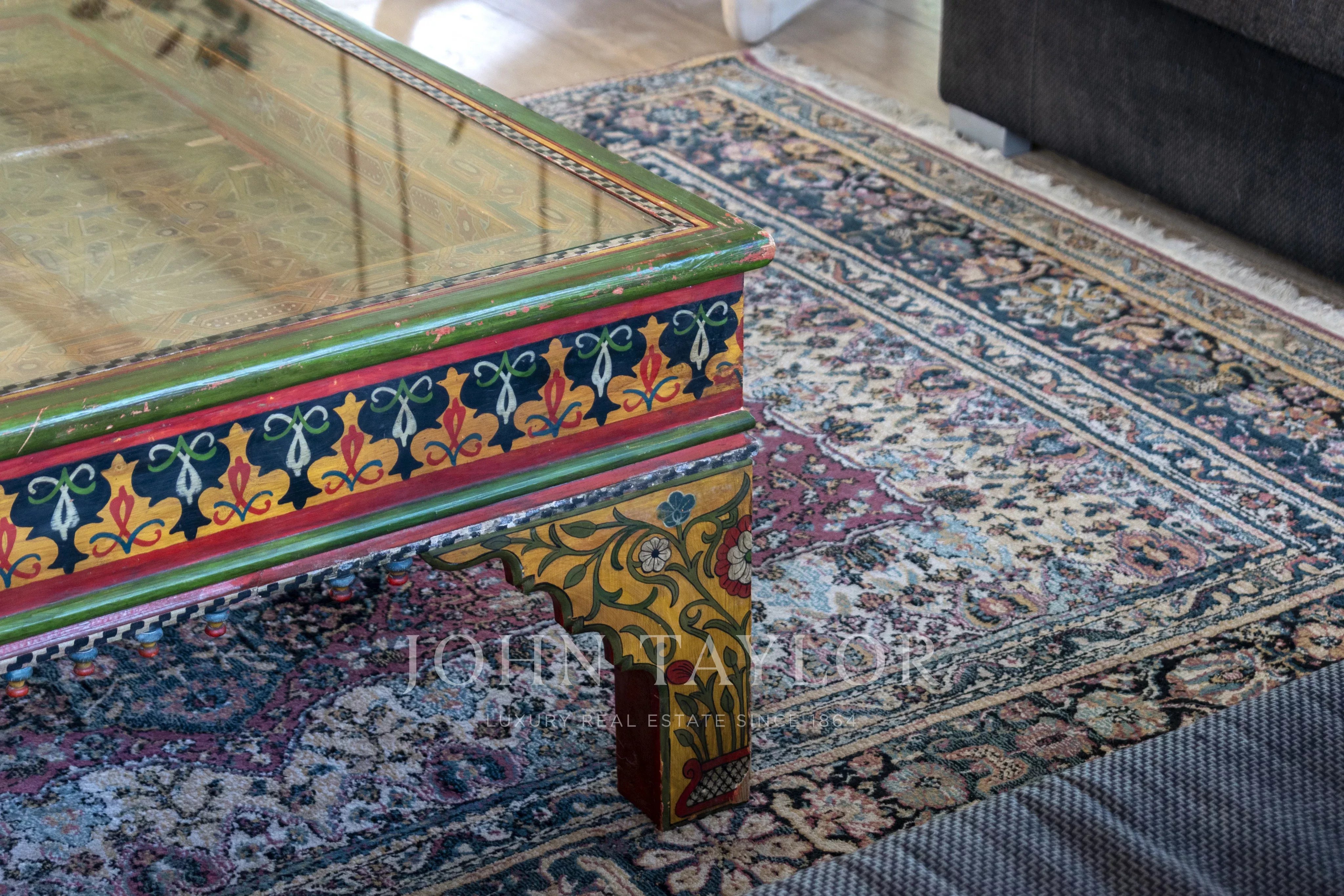 La casa principal se desarrolla en una sola planta con techos de 3,75 metros e incluye un amplio hall de entrada, 4 dormitorios, 3 baños completos y un aseo de invitados. El salón-comedor, con techos de vigas y ventanales de 6 metros, ofrece vistas panorámicas sobre el extenso terreno y las montañas de Ibiza. La cocina, abierta al comedor, conecta con la terraza, el jardín y la piscina privada, creando un espacio perfecto para el día a día y para recibir a invitados.