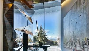 En su interior, dada la riqueza espacial de la vivienda y la yuxtaposición de los espacios entre sí, el uso de materiales en paredes, suelos y techos es diverso (piedra natural, metal, vidrios de diferentes características, madera de ébano,