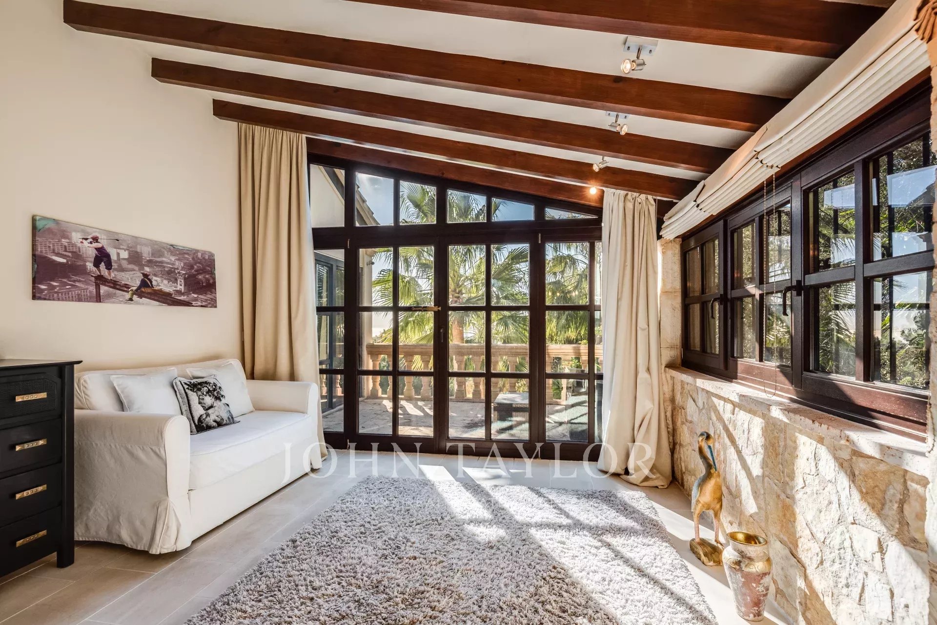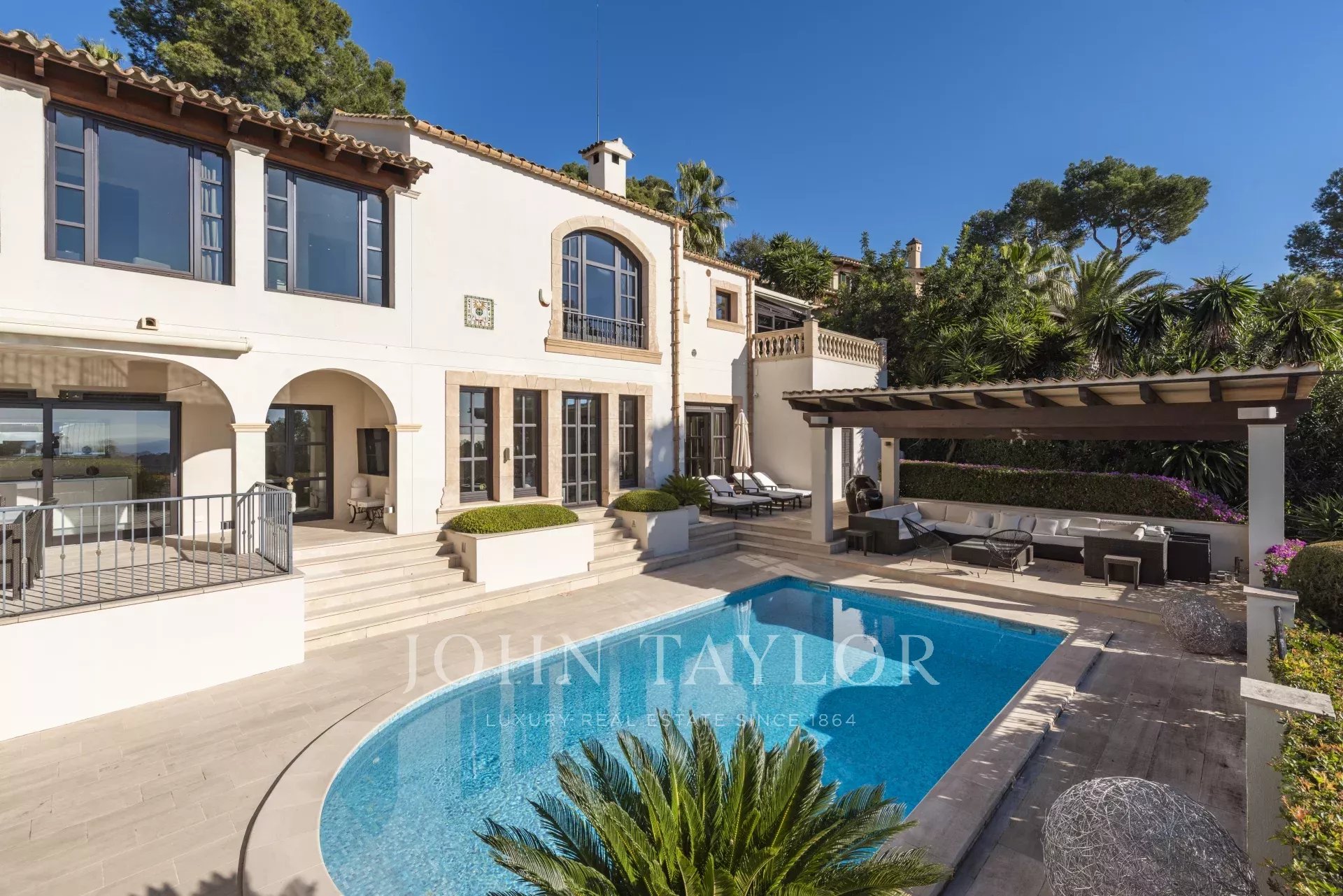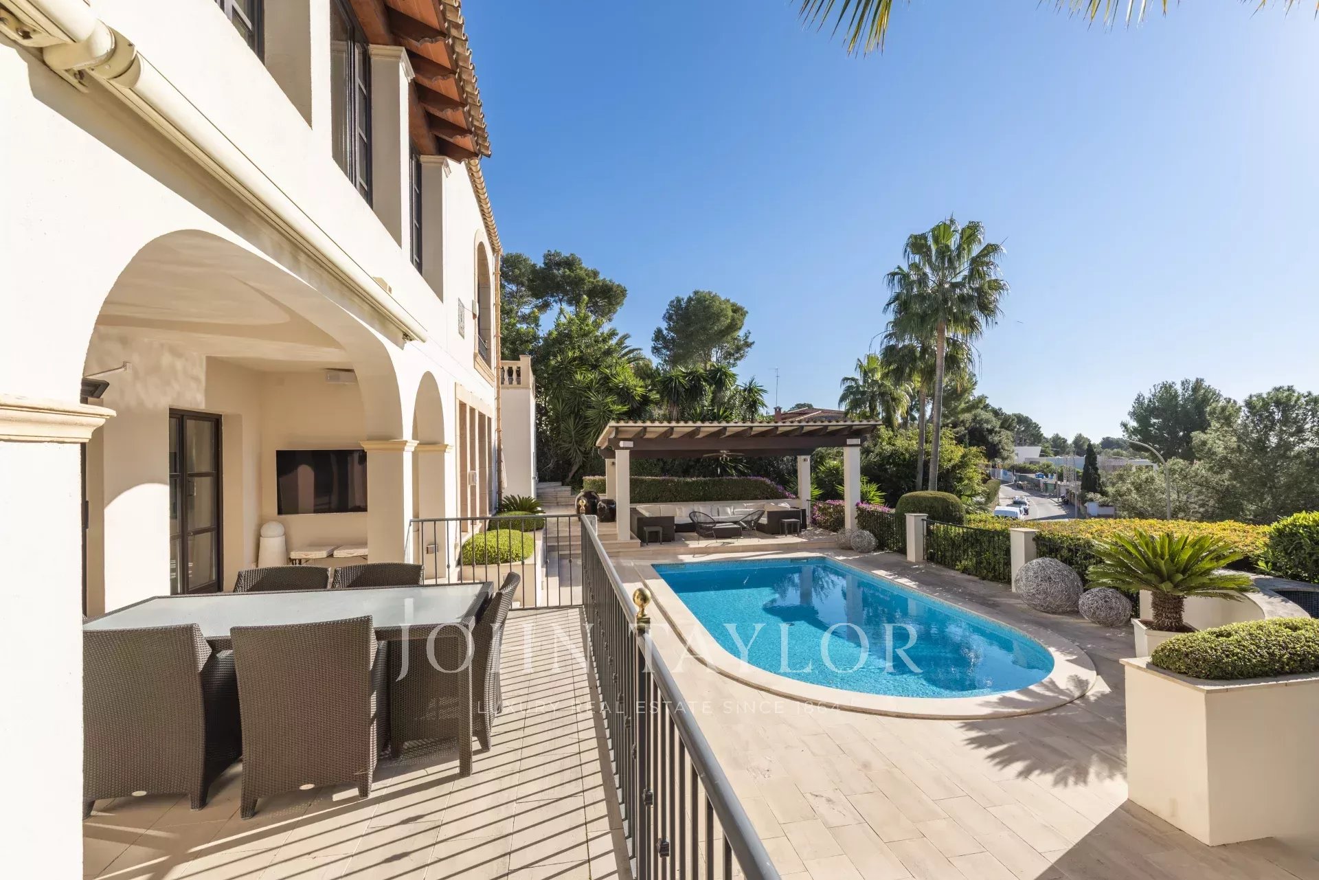 Le ofrecemos esta impresionante villa mediterránea que se encuentra muy cerca del campo de golf de Bendinat. Dispone de 350 m² de superficie habitable que se distribuyen en 2 niveles. En la planta alta se encuentra la cocina principal con comedor, la sala de estar con chimenea, dos dormitorios dobles, dos cuartos de baño y un vestidor. Y en la planta baja una segunda sala de estar más espaciosa, otra cocina totalmente equipada y dos dormitorios más con dos cuartos de baño. Desde aquí todas las estancias dan acceso directo a la preciosa zona exterior de la piscina donde podrá relajarse y disfrutar tomando el sol en el amplio espacio con tumbonas y sofás. Esta propiedad de estilo mediterráneo es ideal para el que busca privacidad, tranquilidad, buenas vistas al mar y vivir en una zona muy codiciada cerca de los hermosos puertos y todos los servicios. No pierda la oportunidad de venir a ver la casa. Comuníquese con nosotros cuanto antes.