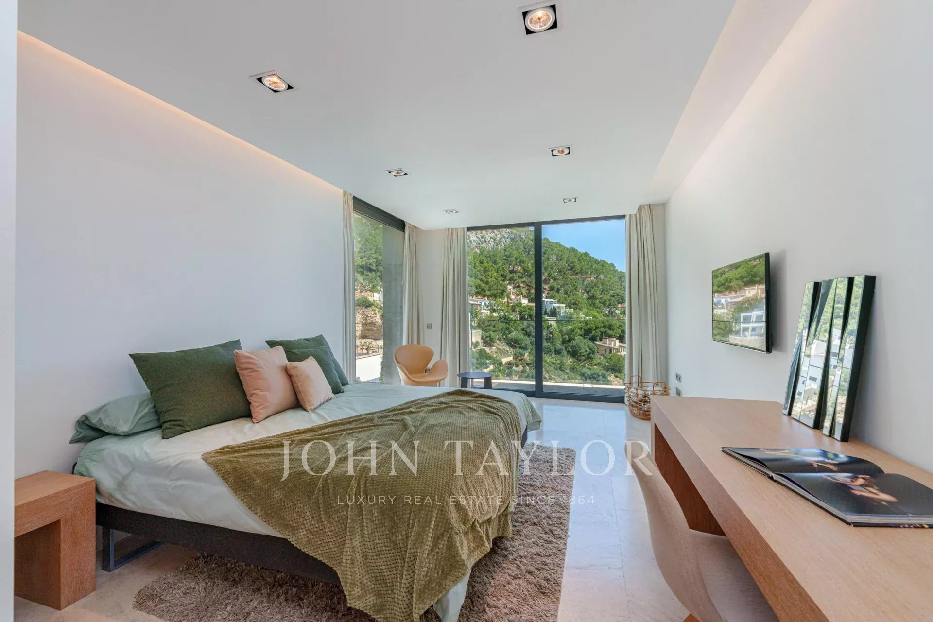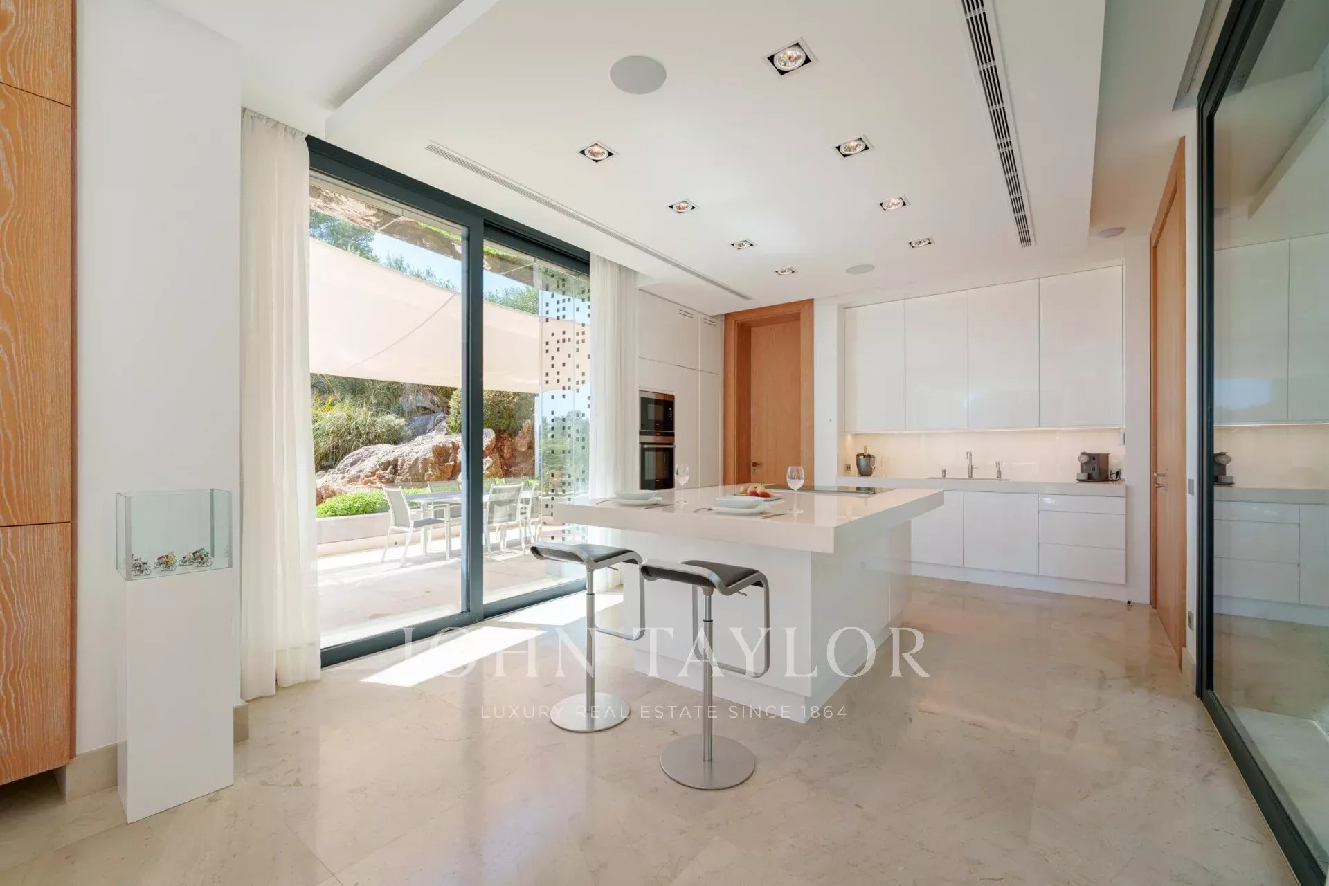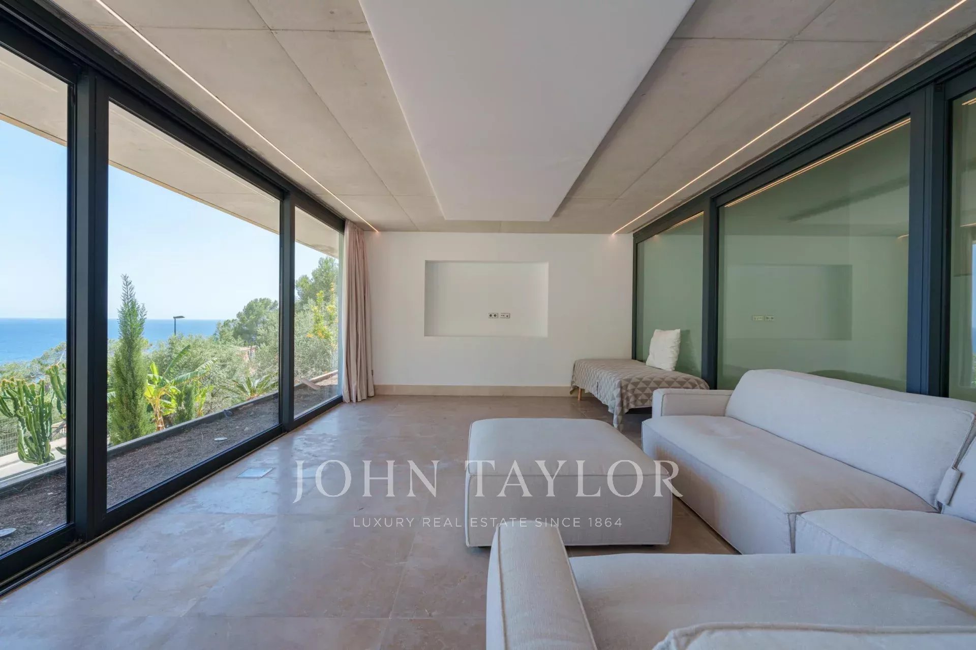 La propiedad destaca por su impresionante diseño arquitectónico y su fachada acristalada frente al mar, lo que garantiza la máxima luz natural y vistas al mar desde todas las habitaciones. Al entrar en el garaje privado, tiene acceso tanto por ascensor como por escalera a las plantas inferiores. El segundo nivel incluye tres dormitorios, cada uno con baño privado. El tercer nivel está dedicado por completo a la vida diaria. La cocina totalmente equipada y el comedor fluyen sin esfuerzo hacia la sala de estar, que tiene acceso directo al salón exterior con una acogedora chimenea, terraza y zona de piscina. El nivel inferior incluye una sala de cine y un gimnasio privado. Construida con materiales de la más alta calidad, la villa dispone de aire acondicionado central, calefacción por suelo radiante, sistema de ósmosis y domótica.