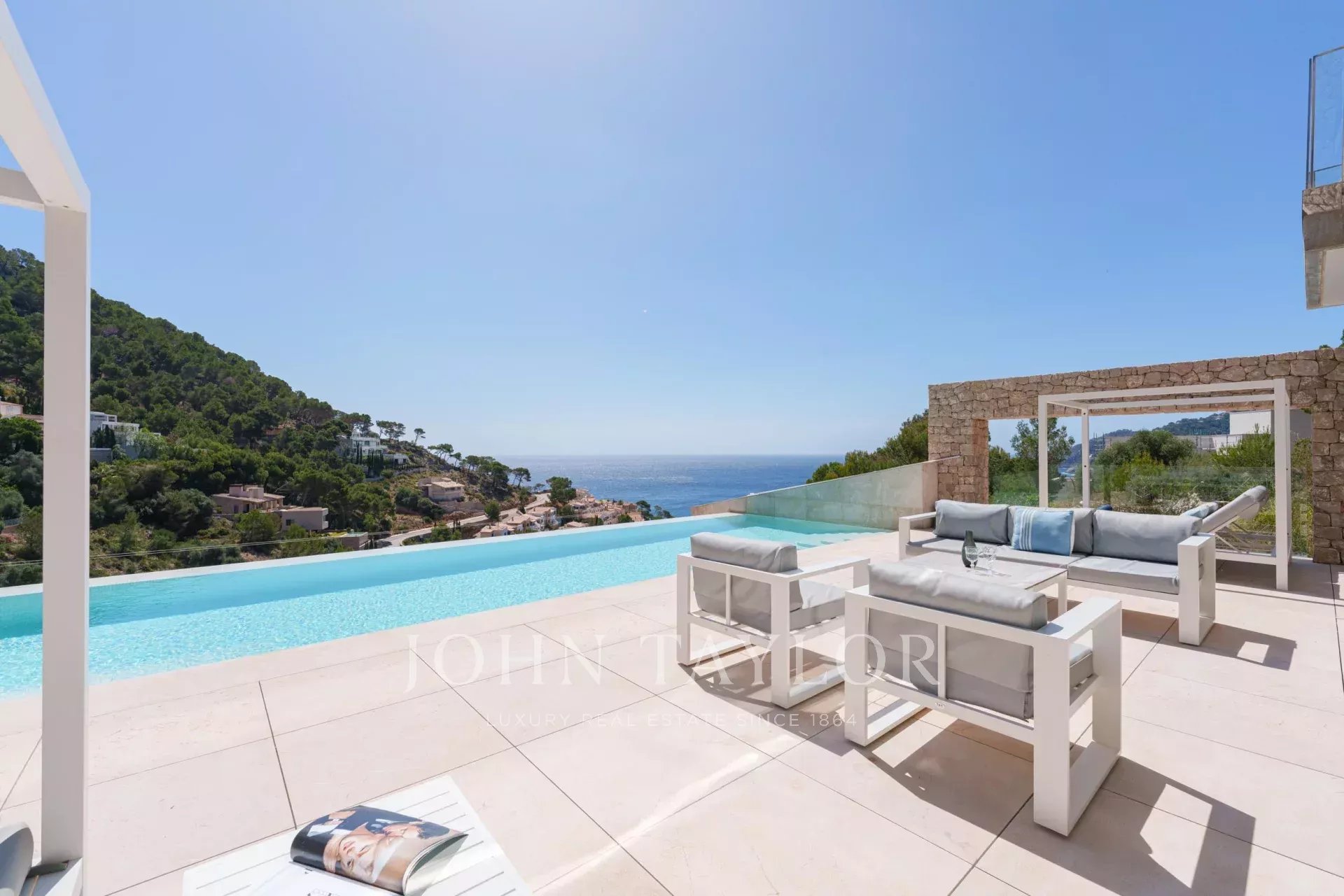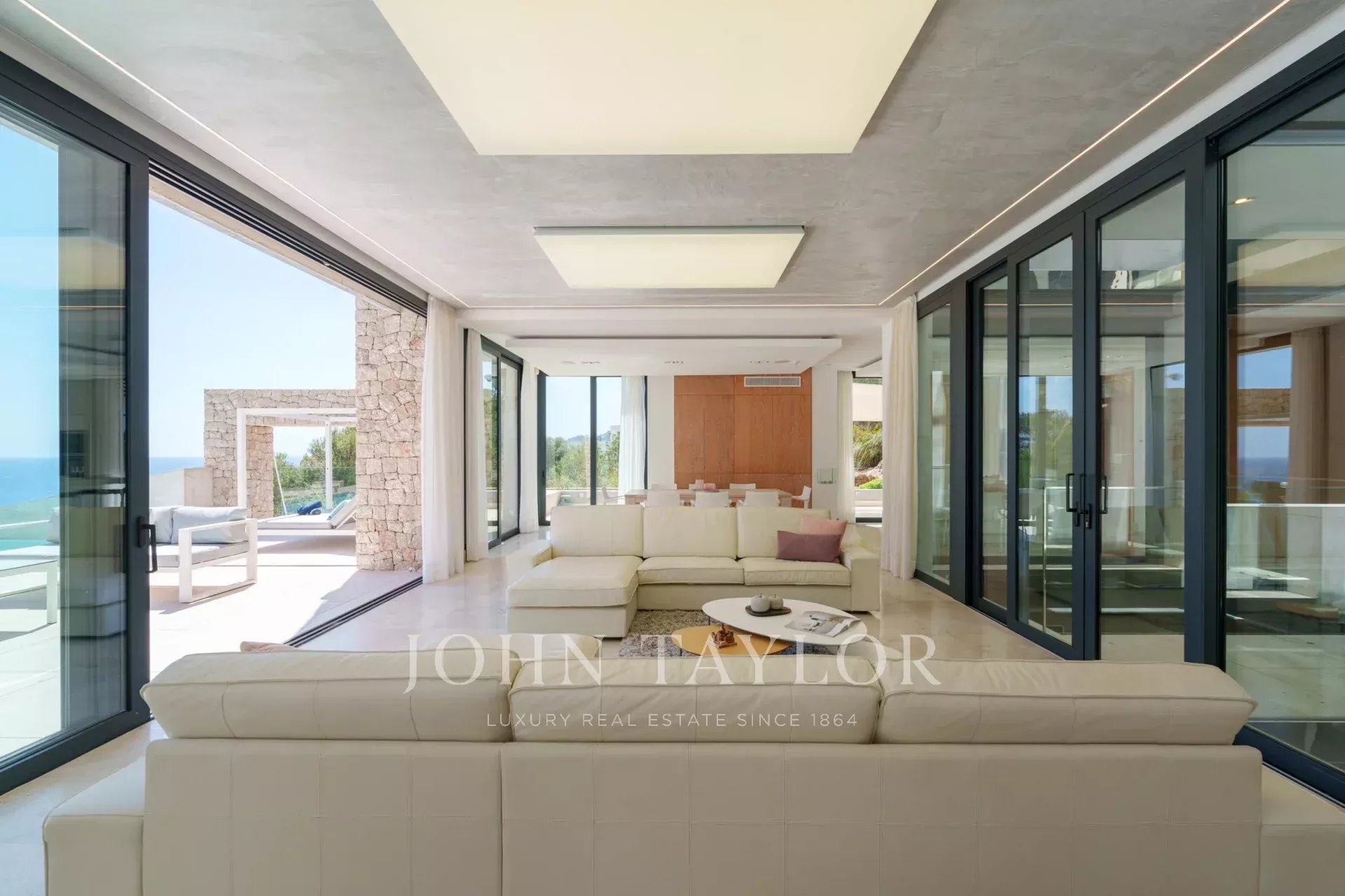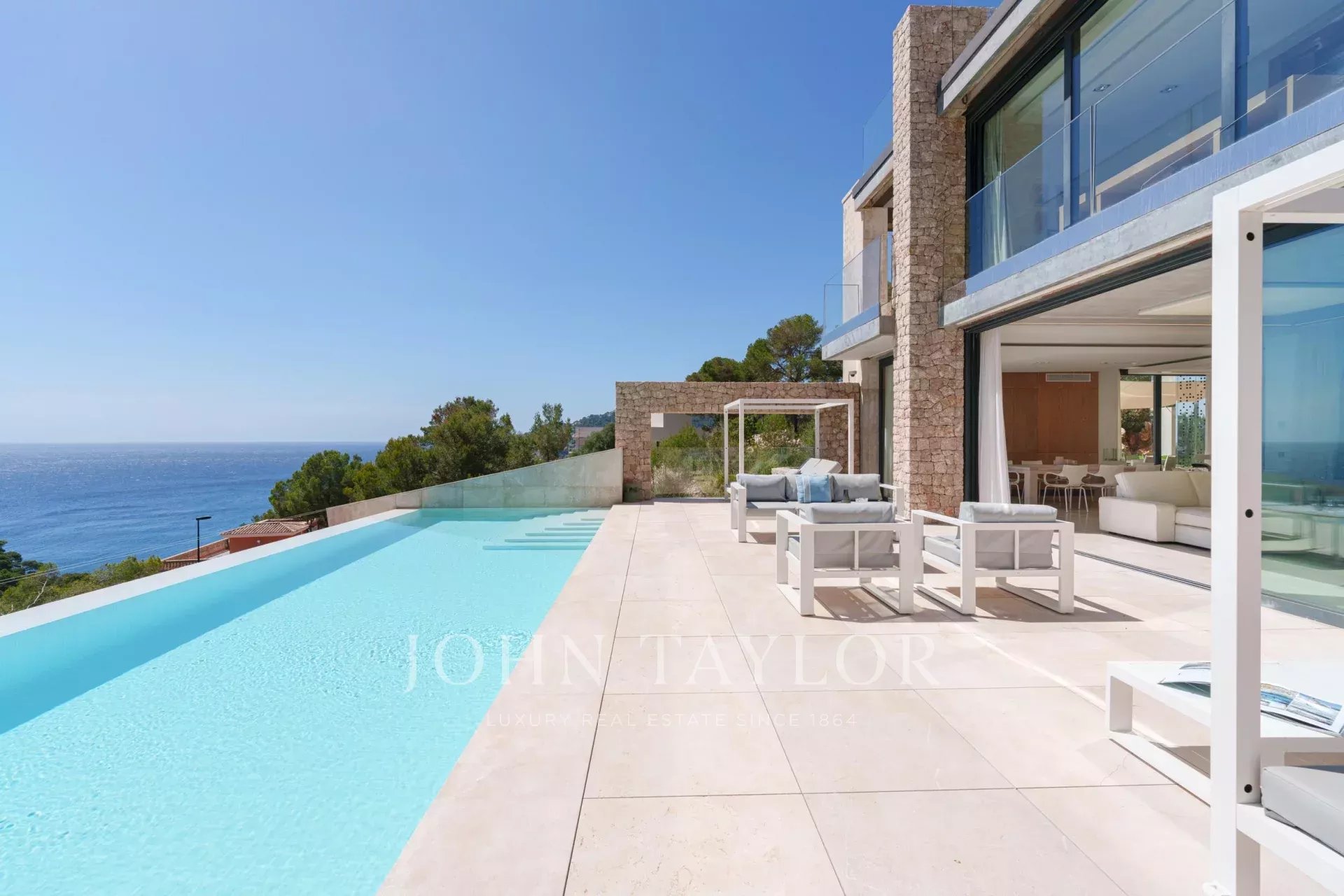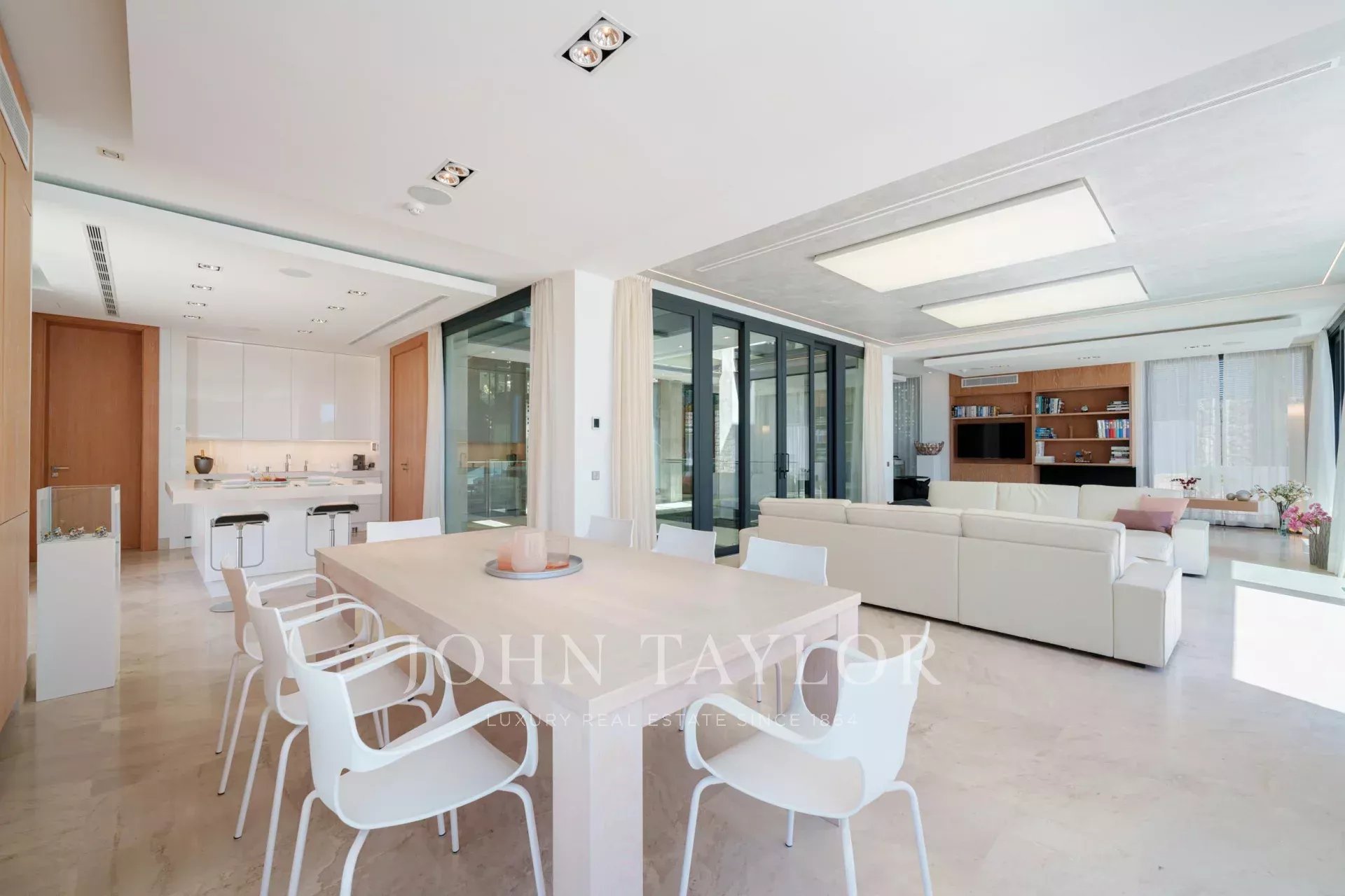 La propiedad destaca por su impresionante diseño arquitectónico y su fachada acristalada frente al mar, lo que garantiza la máxima luz natural y vistas al mar desde todas las habitaciones. Al entrar en el garaje privado, tiene acceso tanto por ascensor como por escalera a las plantas inferiores. El segundo nivel incluye tres dormitorios, cada uno con baño privado. El tercer nivel está dedicado por completo a la vida diaria. La cocina totalmente equipada y el comedor fluyen sin esfuerzo hacia la sala de estar, que tiene acceso directo al salón exterior con una acogedora chimenea, terraza y zona de piscina. El nivel inferior incluye una sala de cine y un gimnasio privado. Construida con materiales de la más alta calidad, la villa dispone de aire acondicionado central, calefacción por suelo radiante, sistema de ósmosis y domótica.