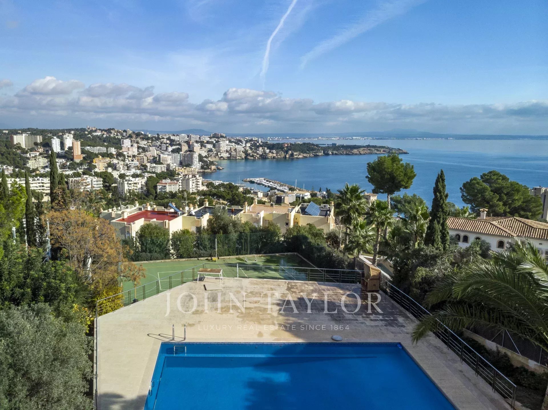 Esta villa espaciosa con maravillosas vistas al mar se encuentra en una parcela inusualmente grande para la codiciada zona de Cas Catalá y es un paraíso especialmente para los amantes de deportes y en general para una familia grande que disfruta de las actividades en el exterior. Aparte de amplias terrazas y una piscina climatizada de grandes dimensiones la propiedad se completa con una pista de tenis que también se puede utilizar para practicar otros deportes.