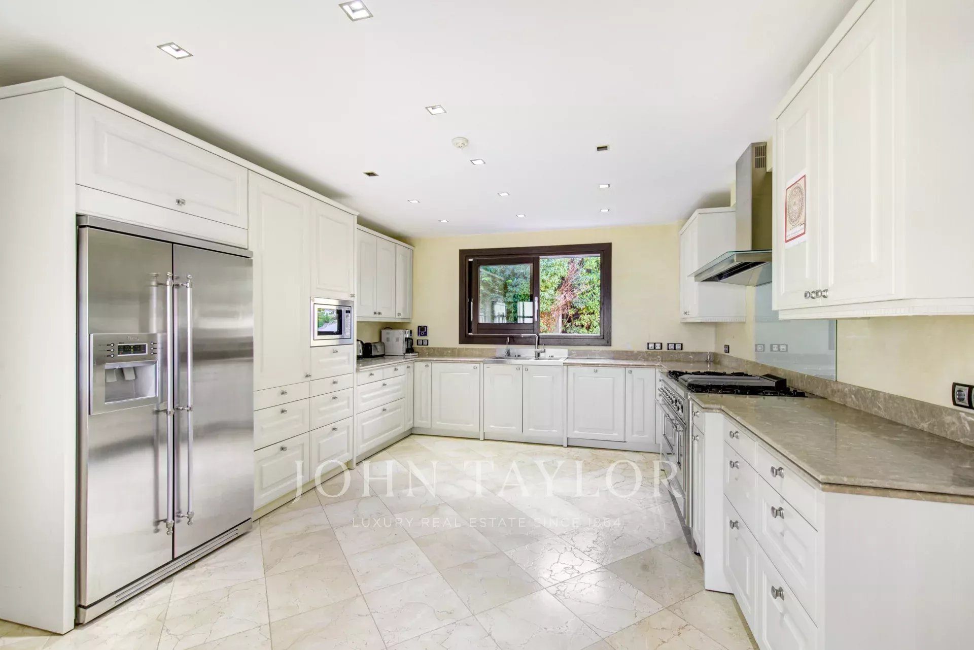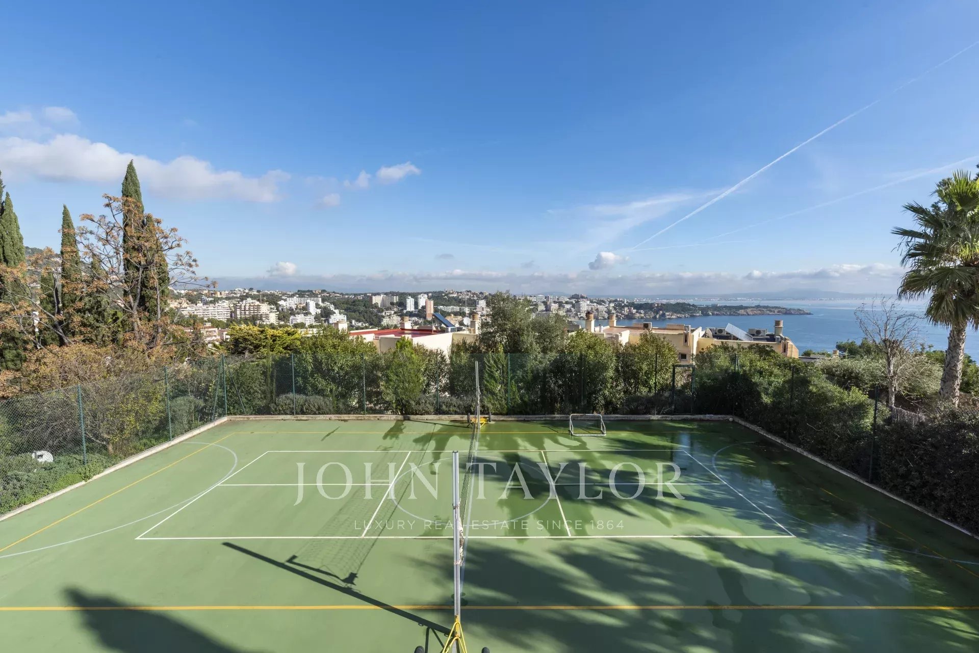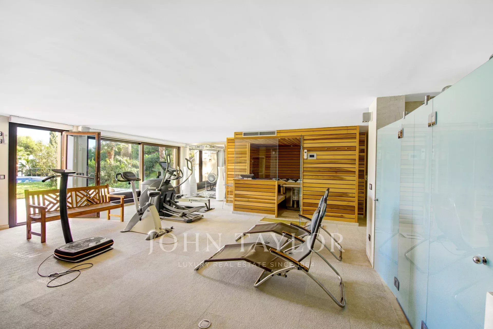 En el piso inferior hay otro salón, una pequeña cocina y 2 habitaciones con baño en suite. La zona de spa y fitness consiste en una sauna, un baño turco, un baño y el gimnasio con una variedad de máquinas. Esta zona conecta perfectamente con la terraza con jacuzzi y desde allí se accede al gran jardín con solarium, piscina y la pista multideportiva. Allí también hay un apartamento para el personal.