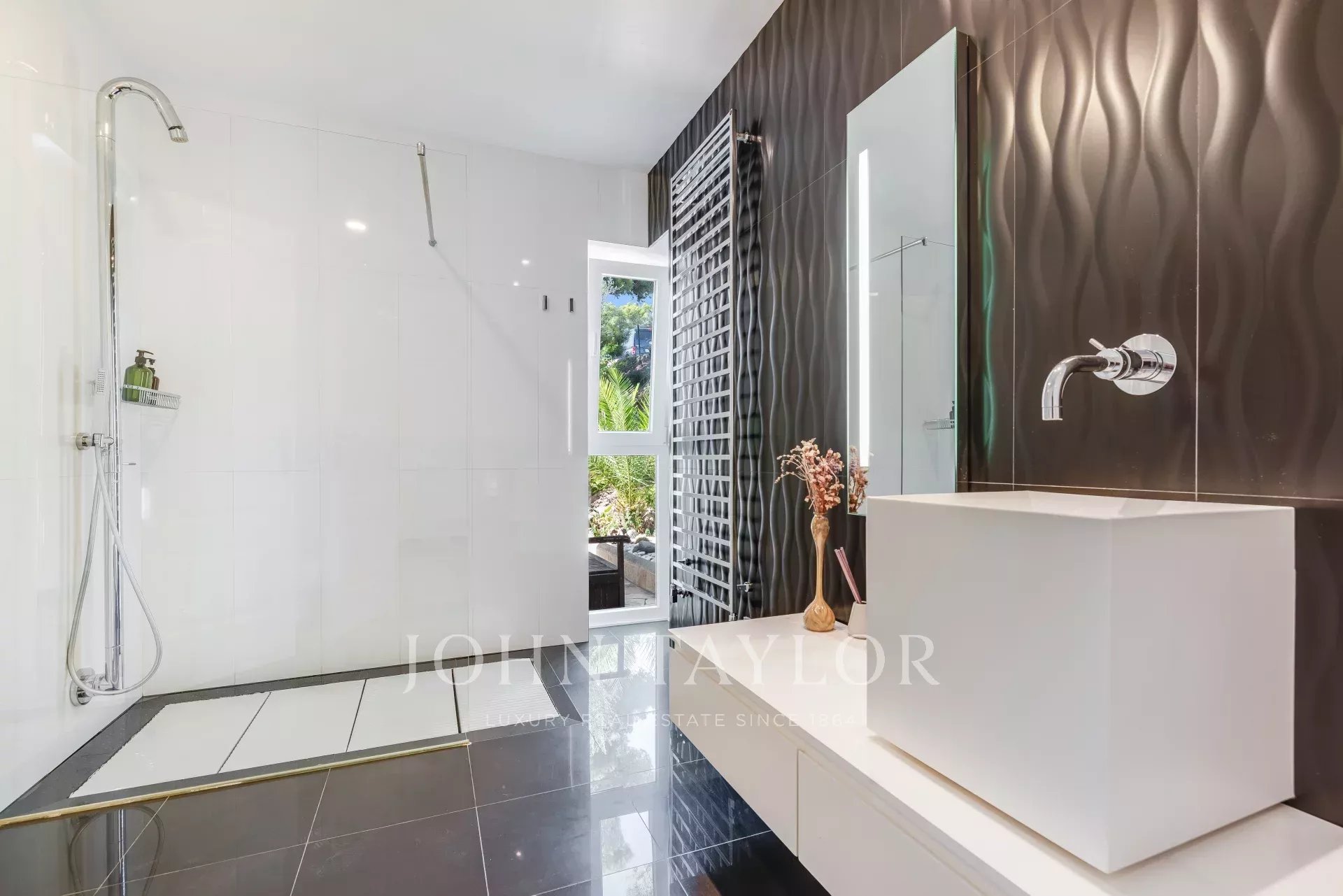 La villa orientada al sureste se divide en diferentes zonas. Hay una zona de día, donde se encuentra el salón, el comedor, la cocina y una oficina. En otra parte de la casa se encuentran los 5 dormitorios y 3 baños. Adicionalmente hay un apartamento de invitados independiente y una zona para el personal de servicio. En la planta baja al mismo nivel de la soleada terraza con piscina y jacuzzi se encuentra un segundo salón y un amplio espacio con doble altura que ofrece diferentes posibilidades de uso, como gimnasio, taller, sala de juegos, etc.