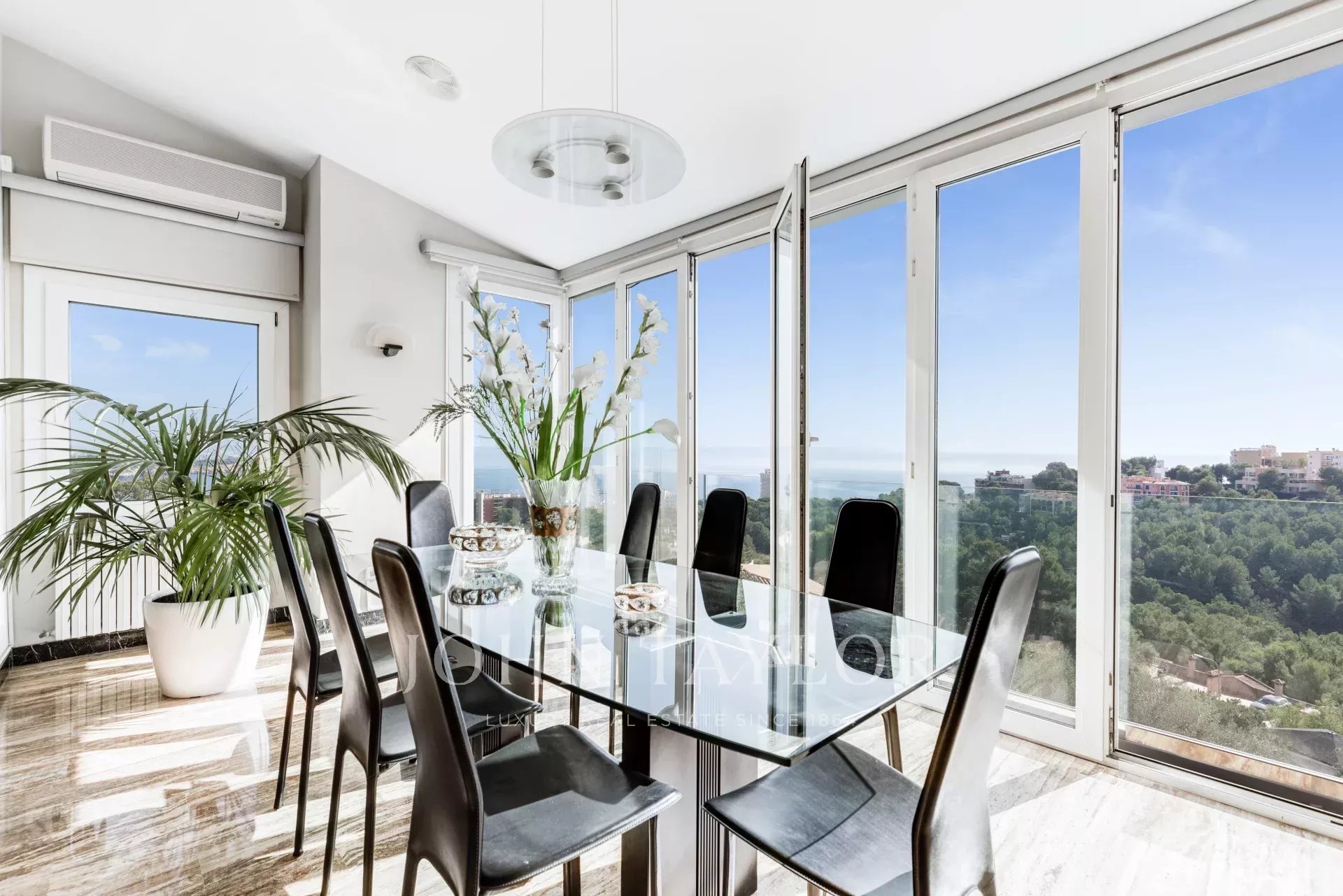 Villa de lujo con vistas al mar y licencia de alquiler en Cas Catalá. Esta casa con una arquitectura original y techos altos se encuentra en una ubicación maravillosa en la parte alta de la tranquila zona residencial de Cas Catalá. Gracias a su posición elevada casi todas las estancias de la casa disfrutan de vistas fabulosas a la Bahía de Palma.