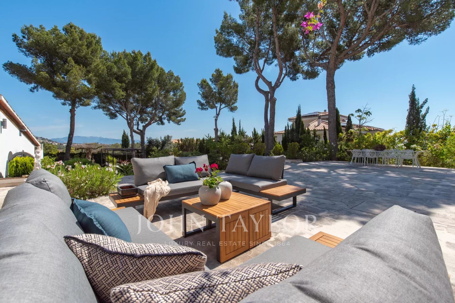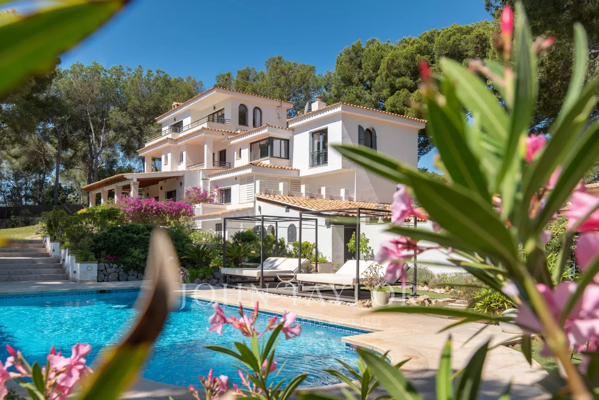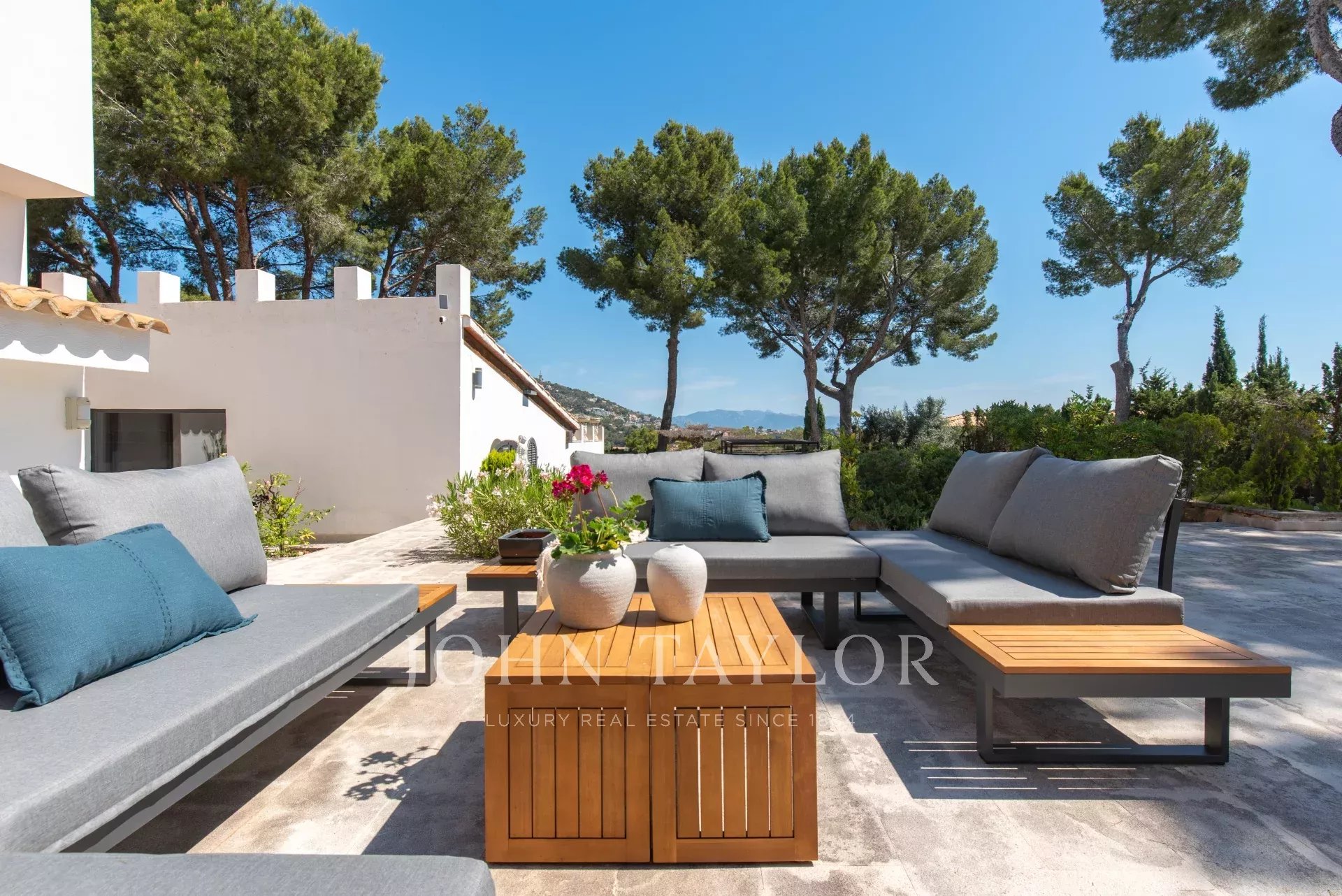 La villa se despliega en una elegante zona de entrada, un amplio y luminoso salón con acceso directo al área exterior, una cocina moderna completamente equipada, seis dormitorios y cuatro baños, dos de ellos en suite. Su cuidada zona exterior, adornada con exuberante vegetación mediterránea y árboles que proporcionan frescura y sombra, acoge una piscina, rincones ideales para el descanso y un porche con zona de barbacoa, perfecto para reuniones inolvidables.
