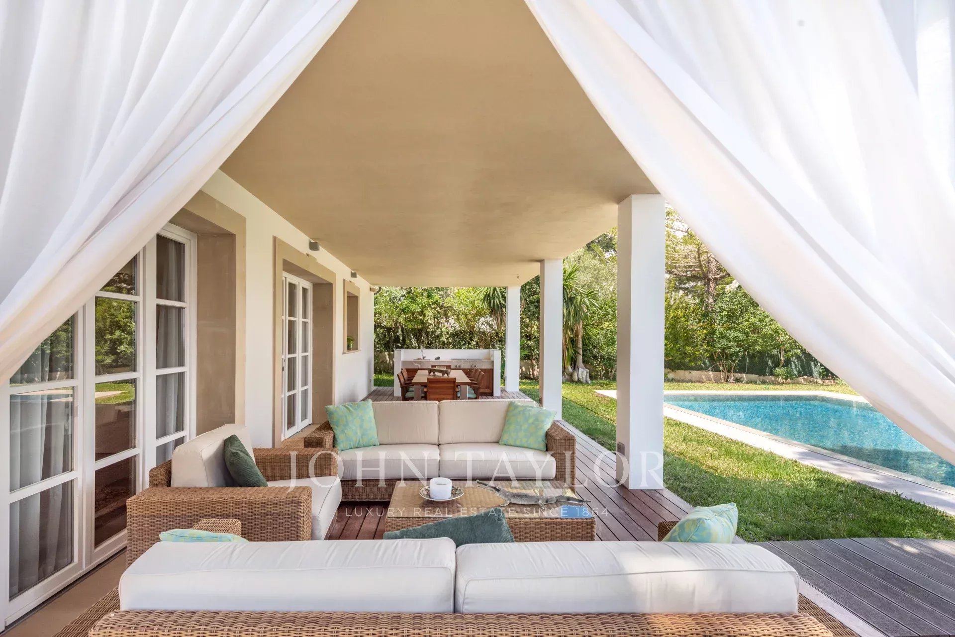 La terraza es un lugar perfecto para disfrutar del verano, con su cocina exterior y zona de comedor para varios comensales, ideal para relajarse y disfrutar de momentos de tranquilidad. La propiedad también cuenta con una amplia piscina de agua salada, sistema de riego automático, iluminación exterior y una cochera para un coche.
