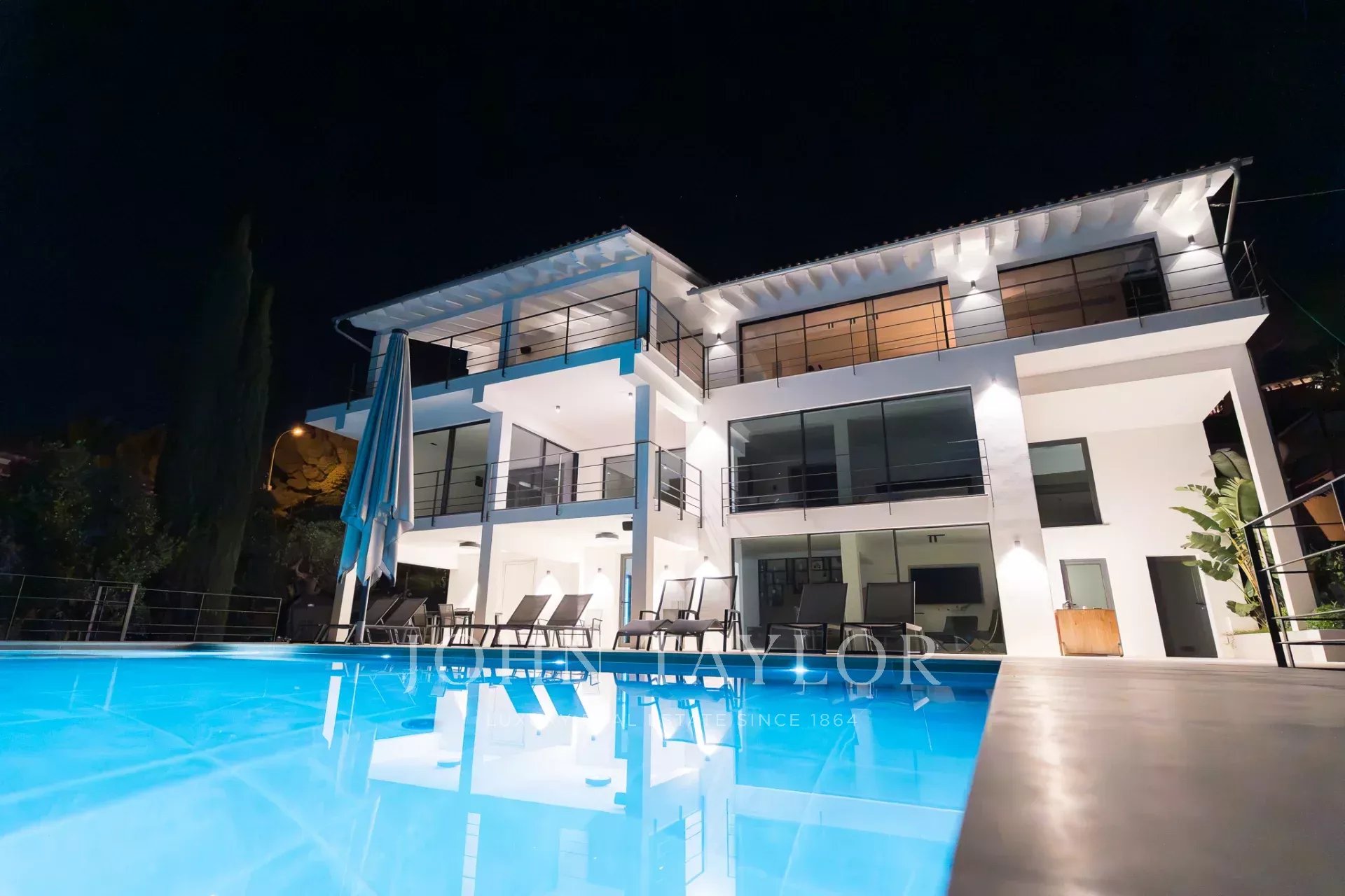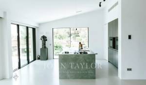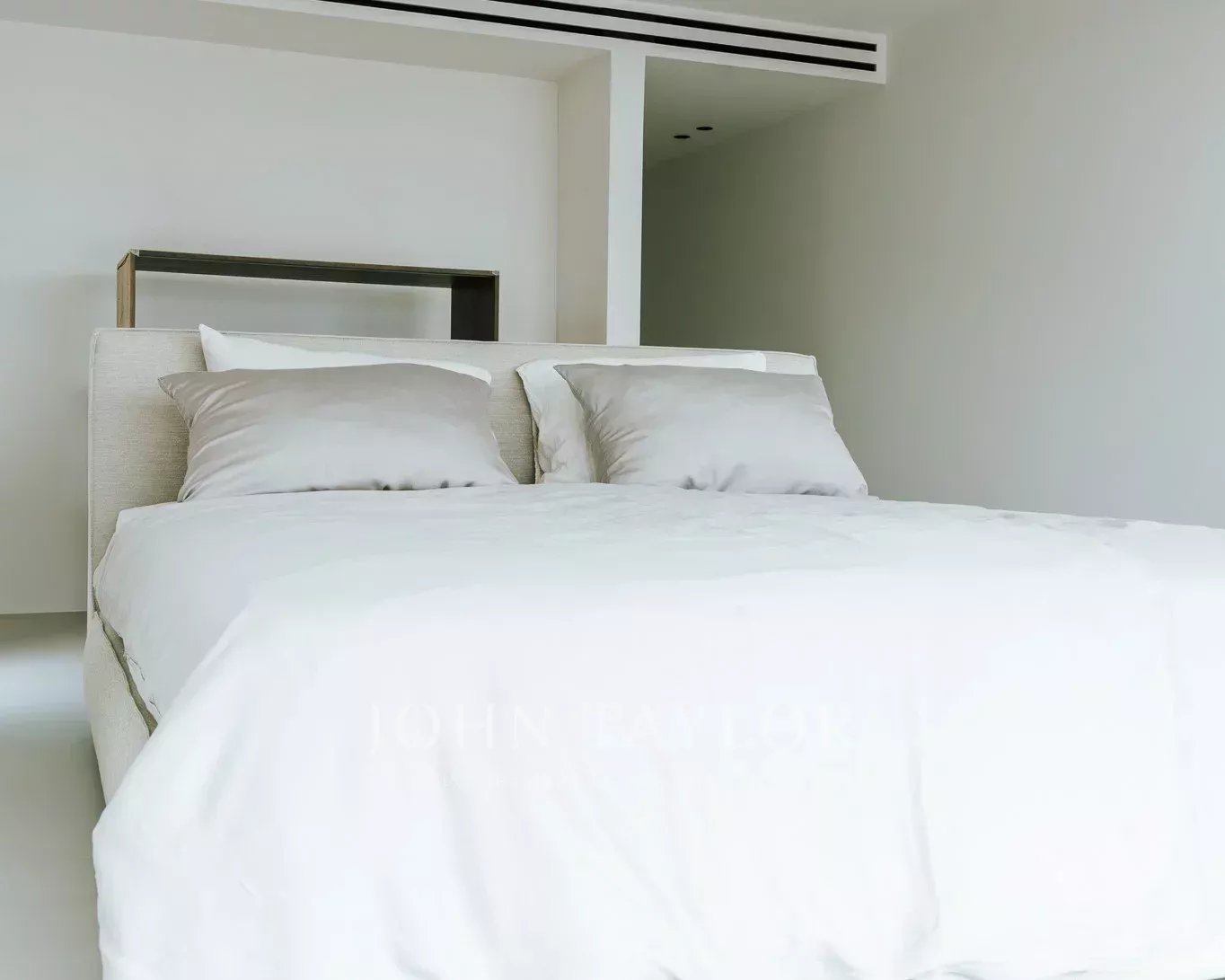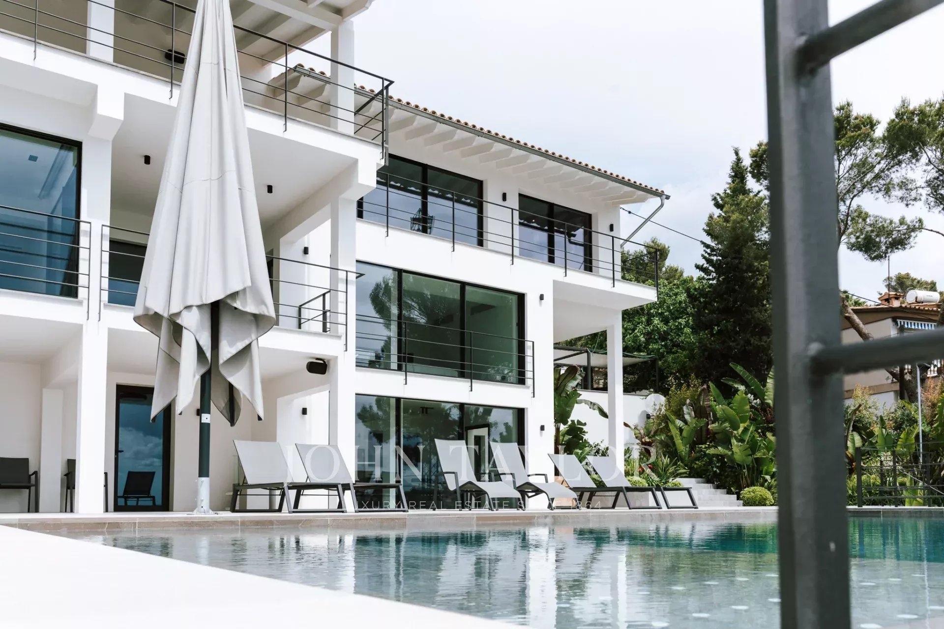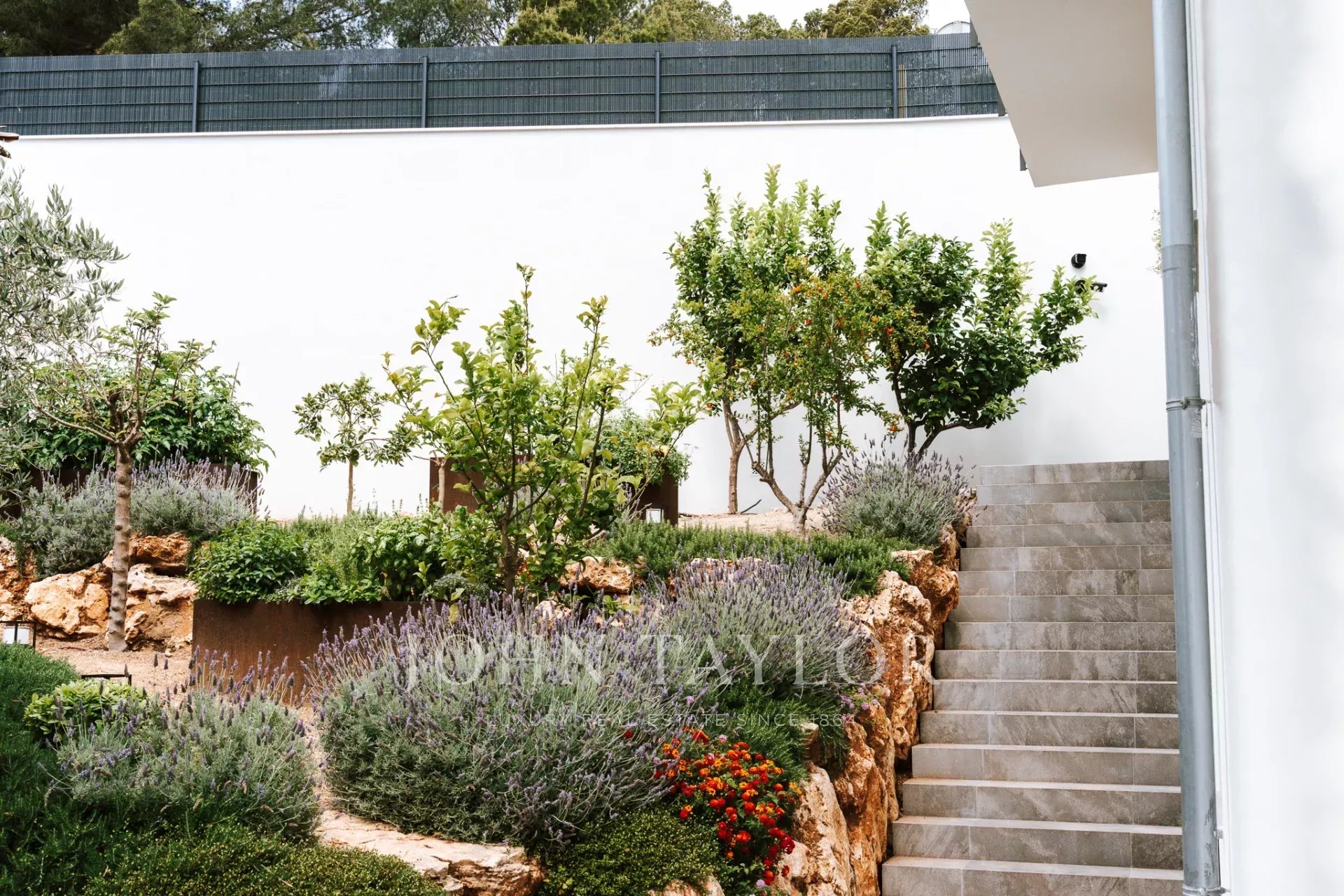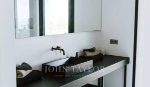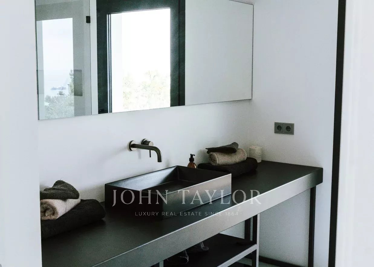 Una escalera conduce a los dormitorios. En este nivel, con sensacionales vistas al mar y al patio, hay tres dormitorios. Uno de ellos se encuentra en un amplio apartamento de invitados con acceso propio y vestidor. El apartamento de invitados está conectado con el dormitorio principal a través de una terraza. El dormitorio principal tiene su propio vestidor y un lujoso baño en suite. Junto al dormitorio principal se encuentra el tercer dormitorio. Desde el patio, dos escaleras (a cada lado de la casa) conducen a la zona de la piscina con terraza, donde se puede admirar el jardín de hierbas y plantas mediterráneas.