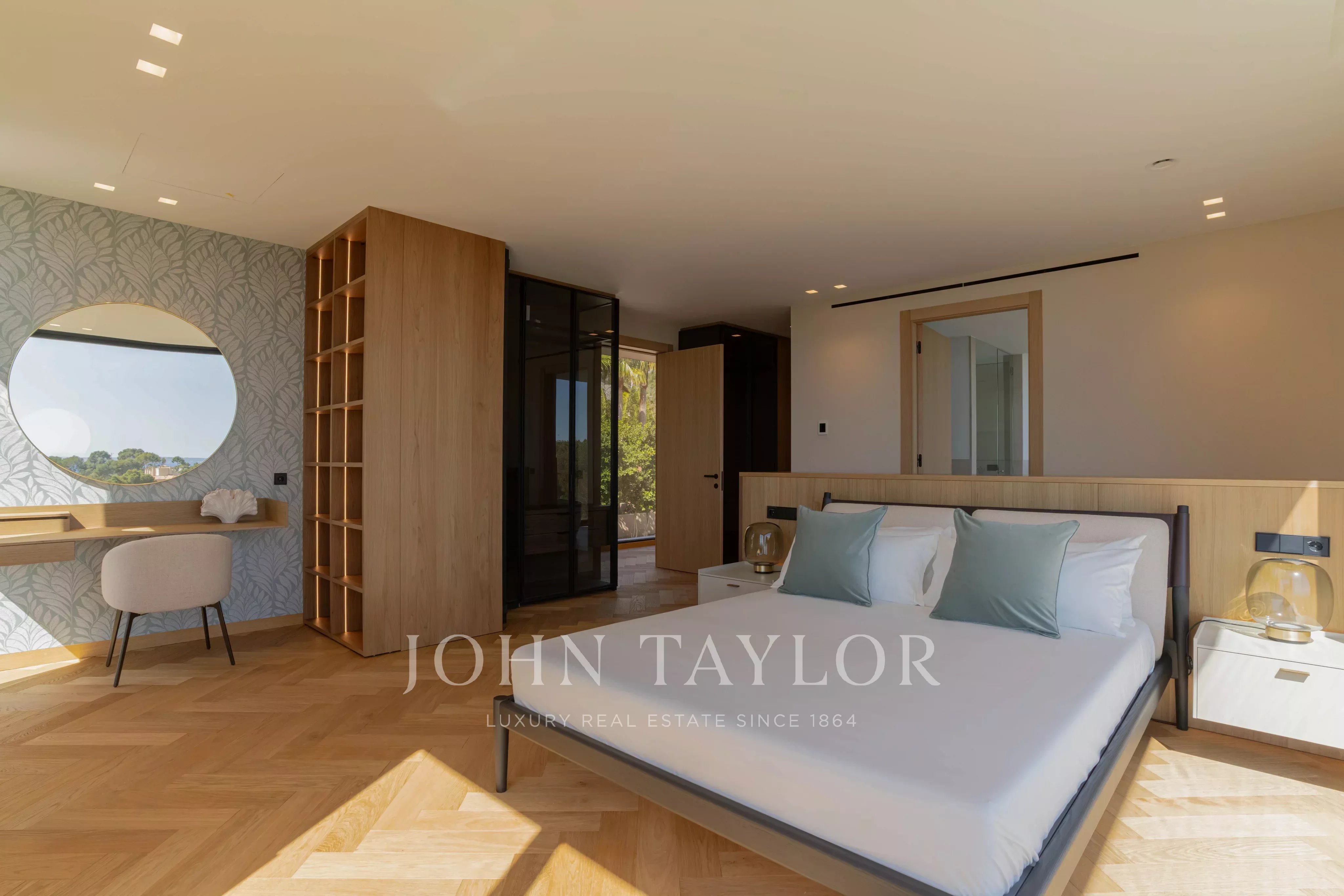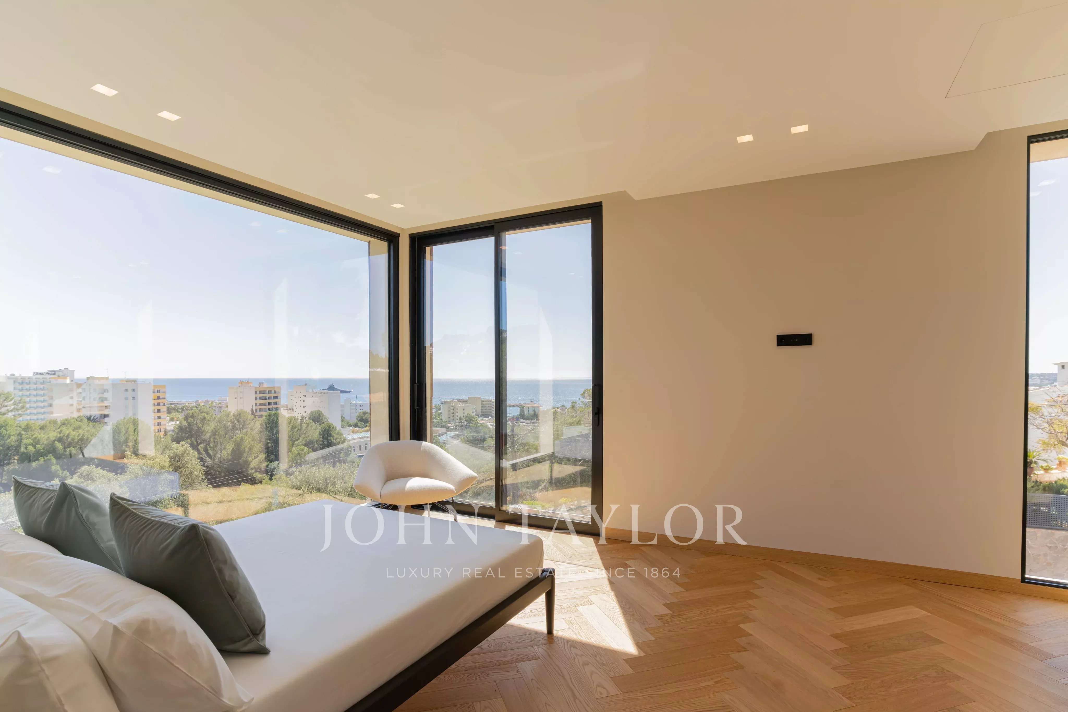En la planta de arriba hay 3 dormitorios con baño en suite. Todos tienen vistas al mar, pero la habitación principal destaca especialmente por la vista panorámica a la Bahía de Palmanova.