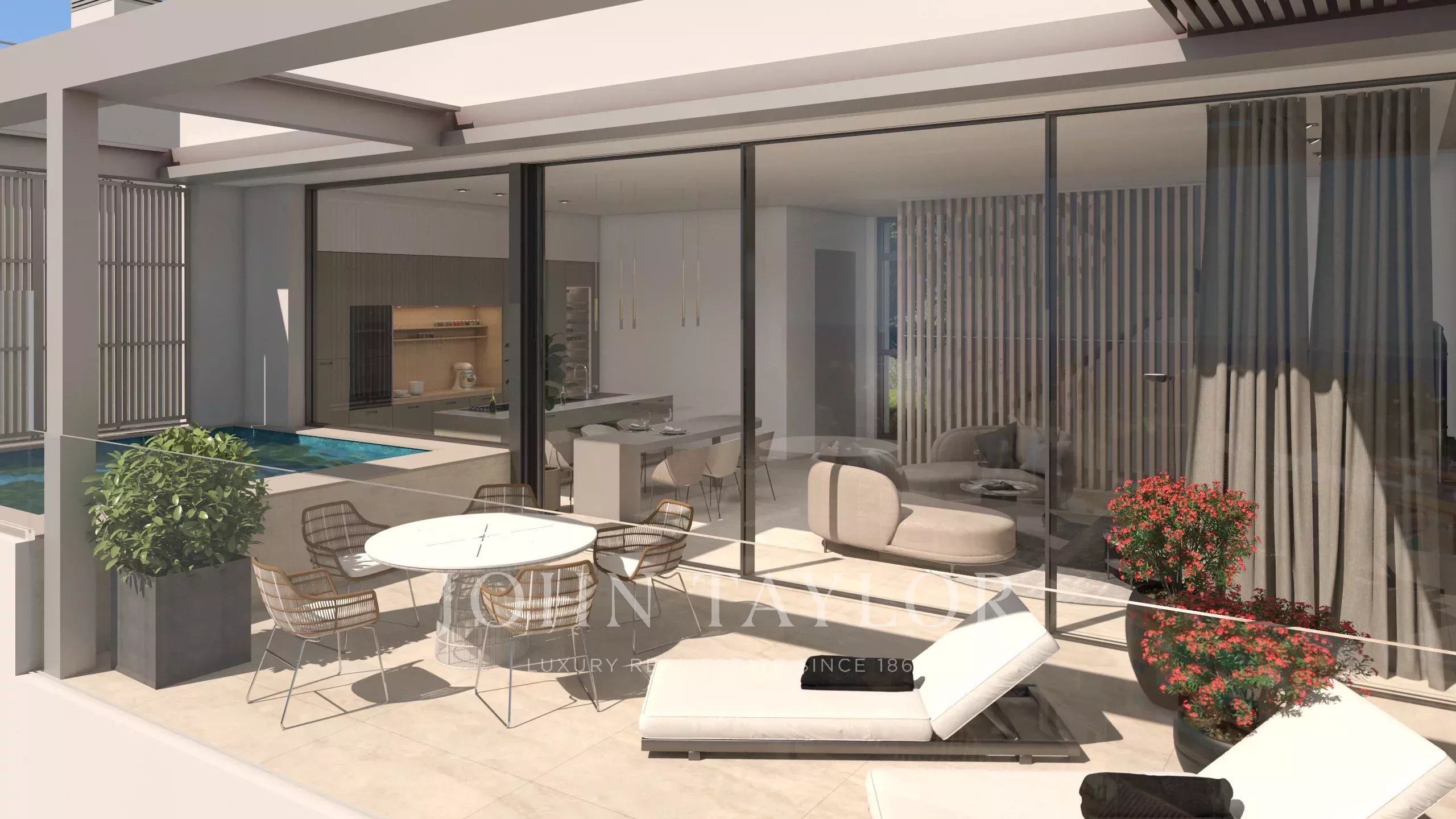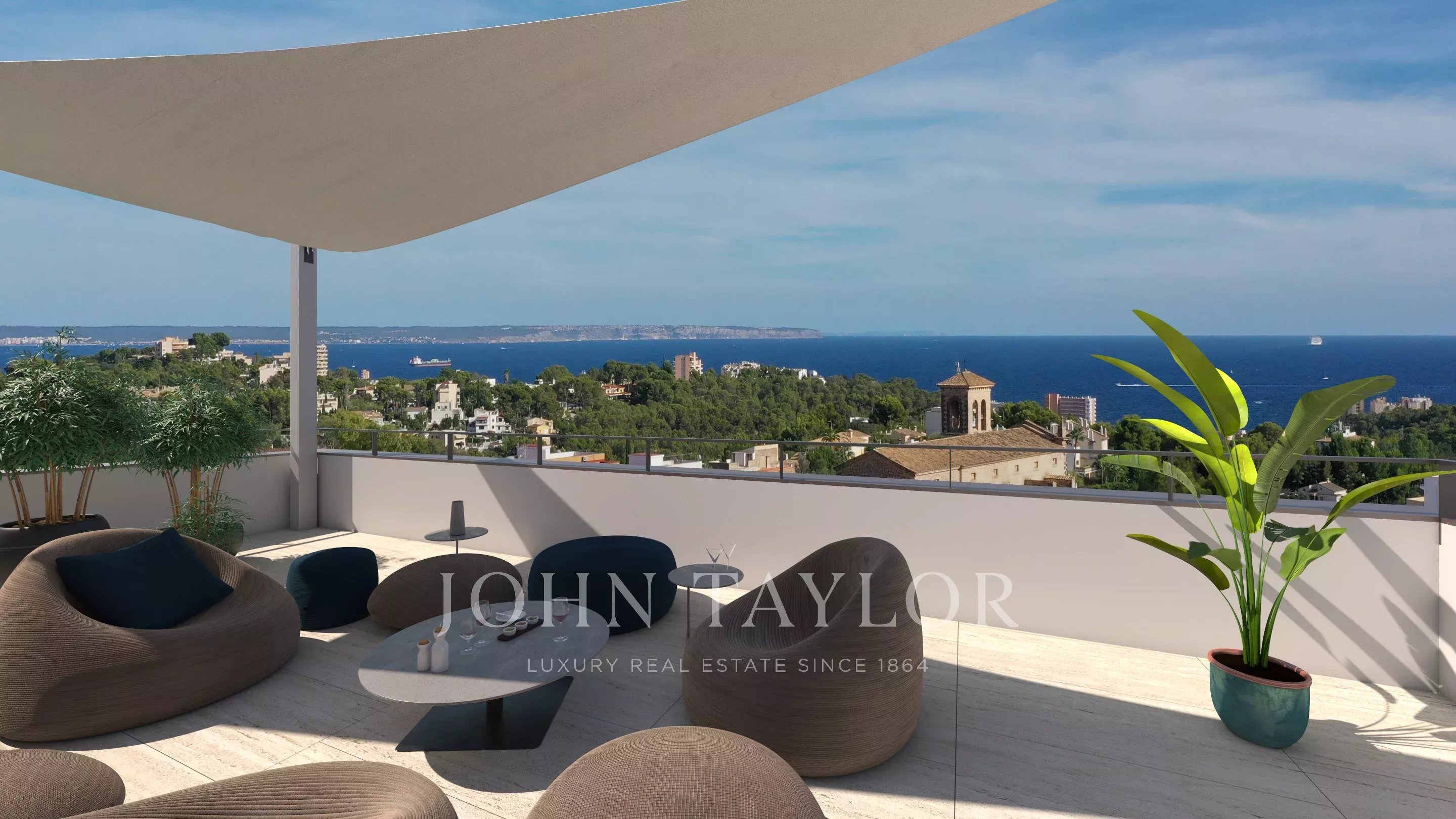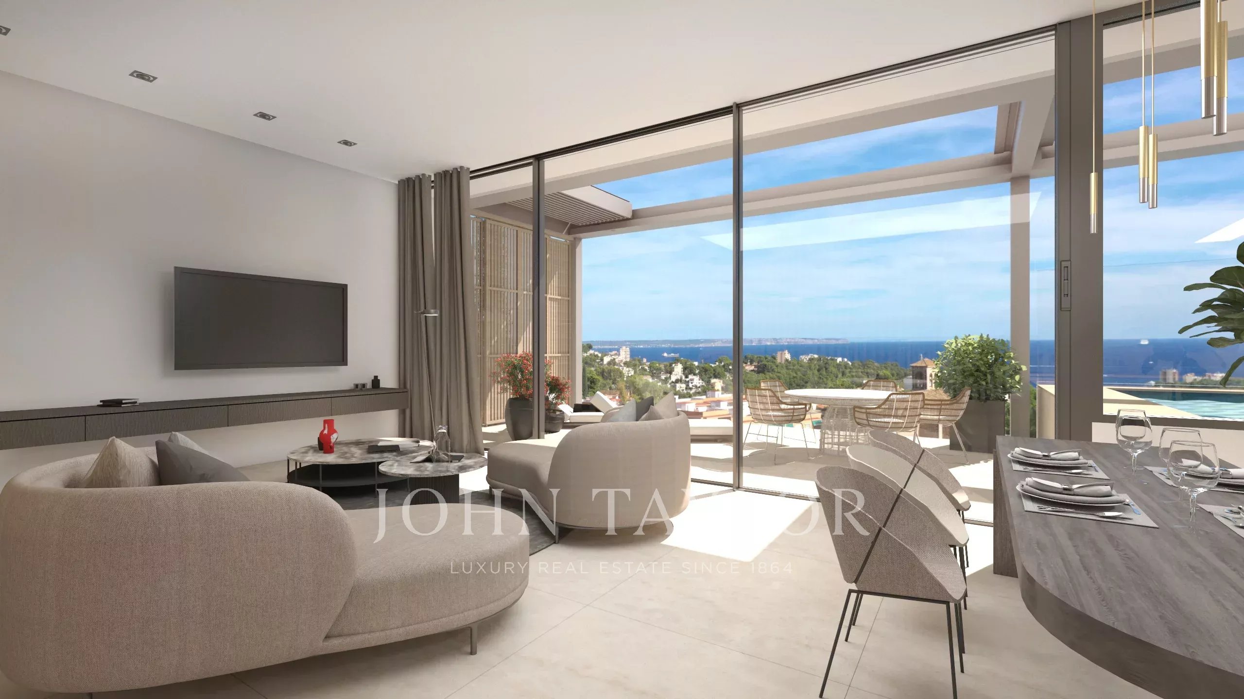Una de las características más notables de la villa es su espectacular terraza en la azotea, que ofrece total privacidad y vistas ininterrumpidas de la bahía. Este excepcional espacio exterior ofrece el marco perfecto para relajarse, entretenerse o simplemente disfrutar de la luz y el ambiente únicos que definen la vida en Mallorca.