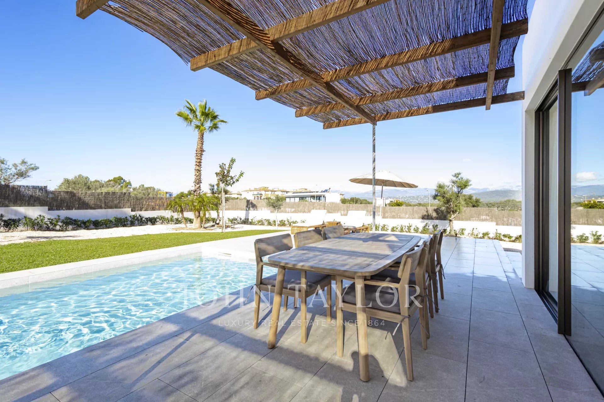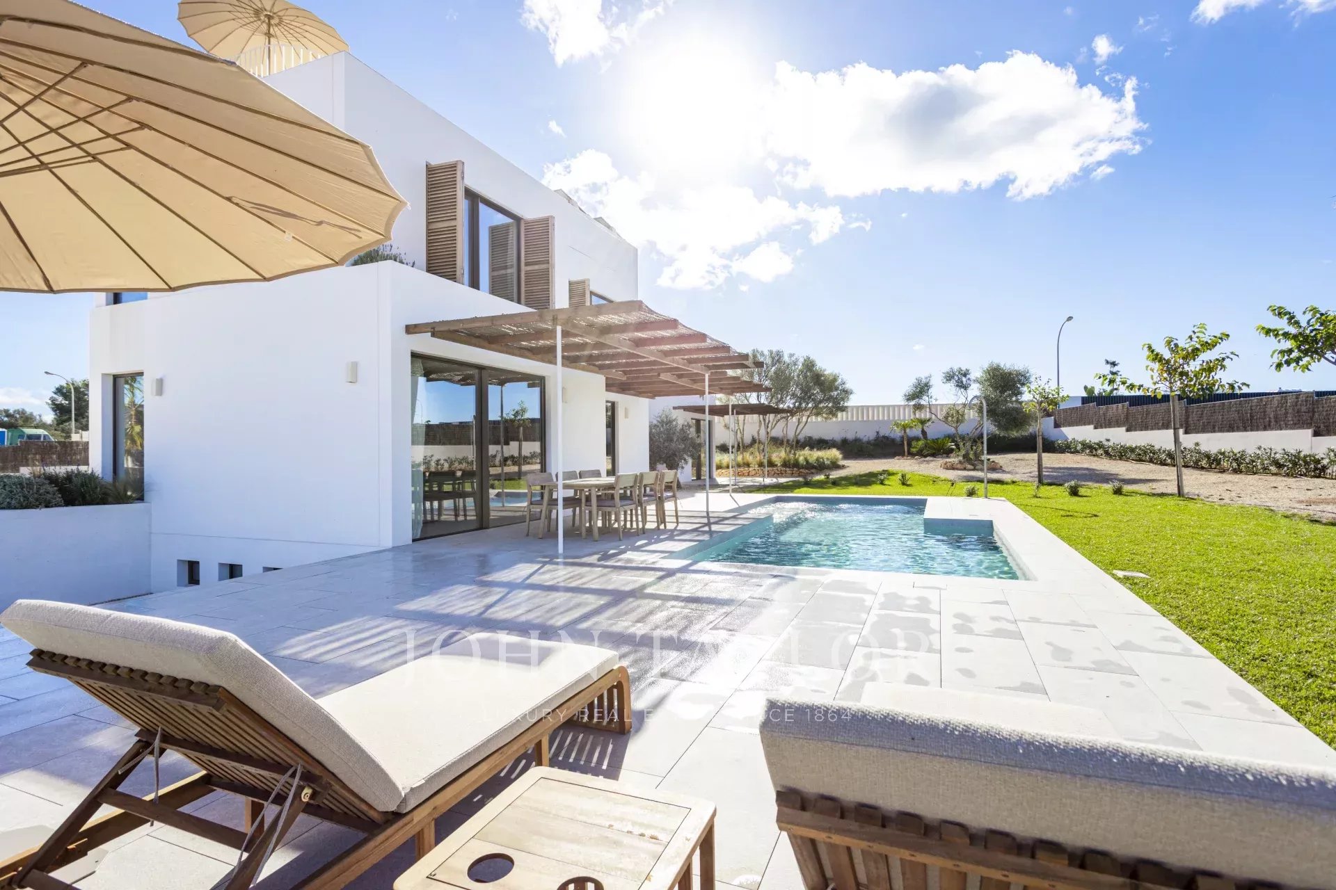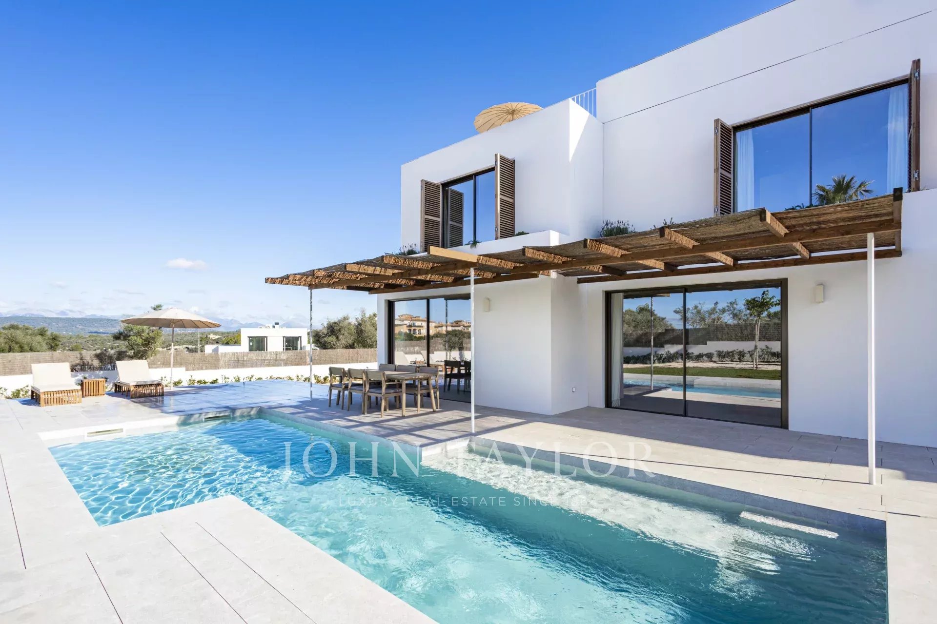Descubra el lujo moderno en Son Gual, Mallorca, con esta impresionante villa de nueva construcción. Ubicada en una espaciosa parcela de 2001m², esta villa de 396m² cuenta con 4 lujosos dormitorios, 3 elegantes baños y un amplio salón-comedor de planta abierta con cocina integrada. Disfrute de la vida interior-exterior sin fisuras con 121m² de terrazas, una piscina privada y una ducha al aire libre, perfecto para disfrutar del hermoso clima de Mallorca.