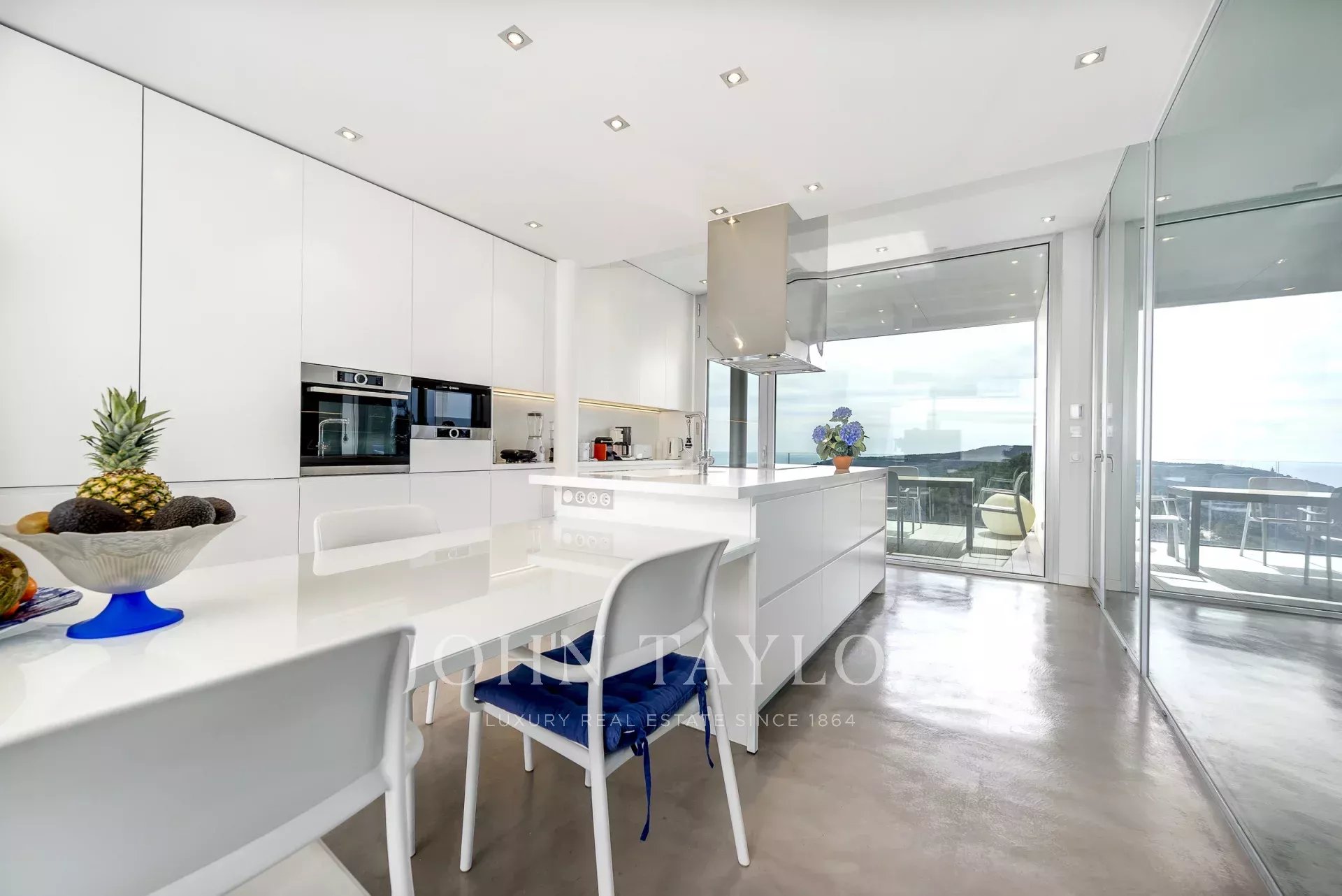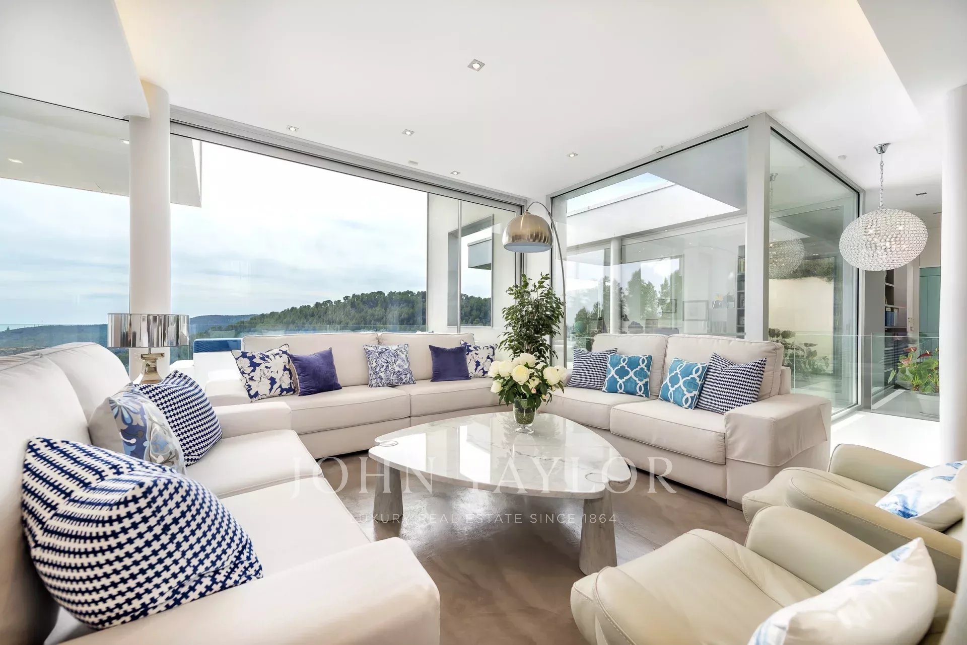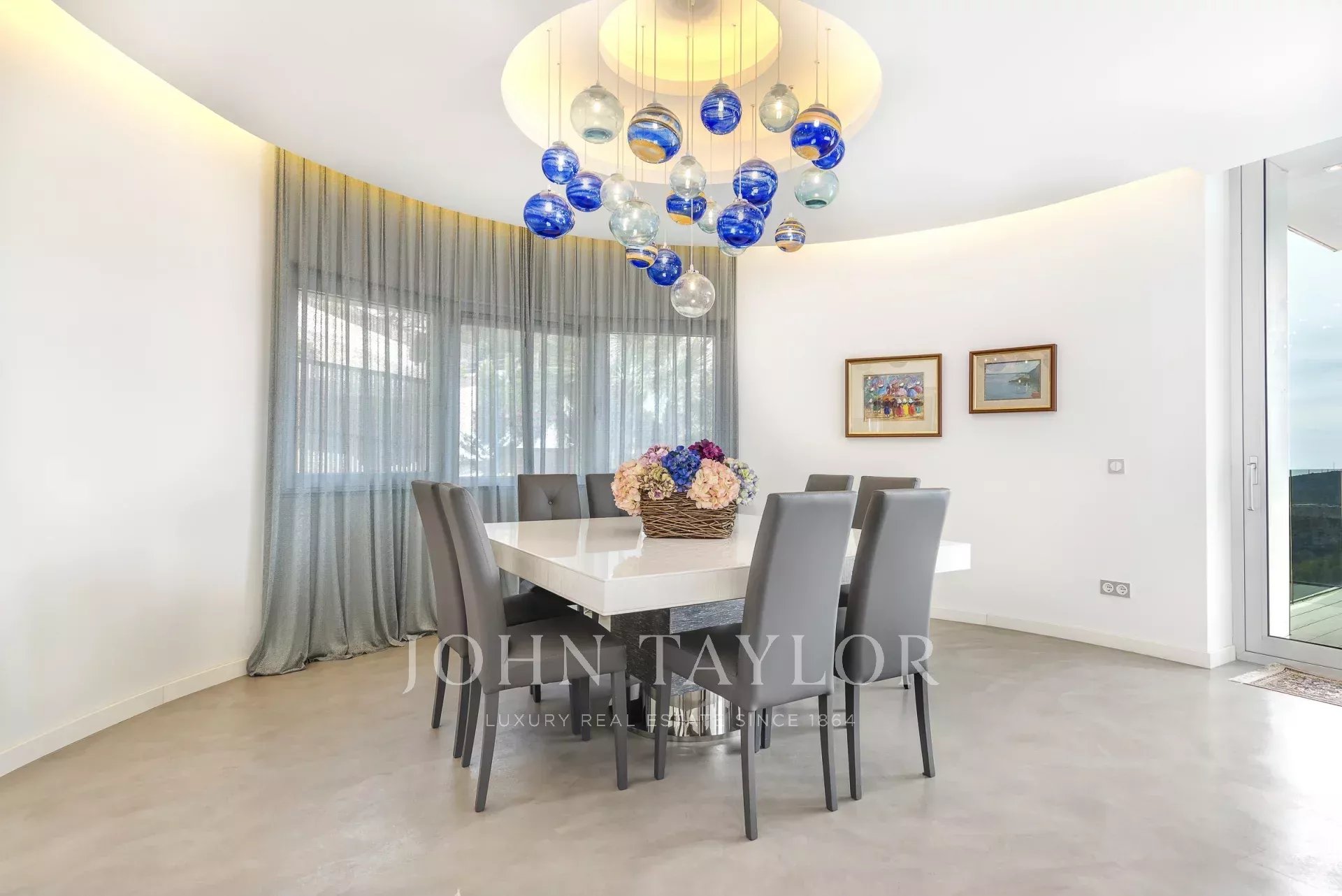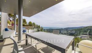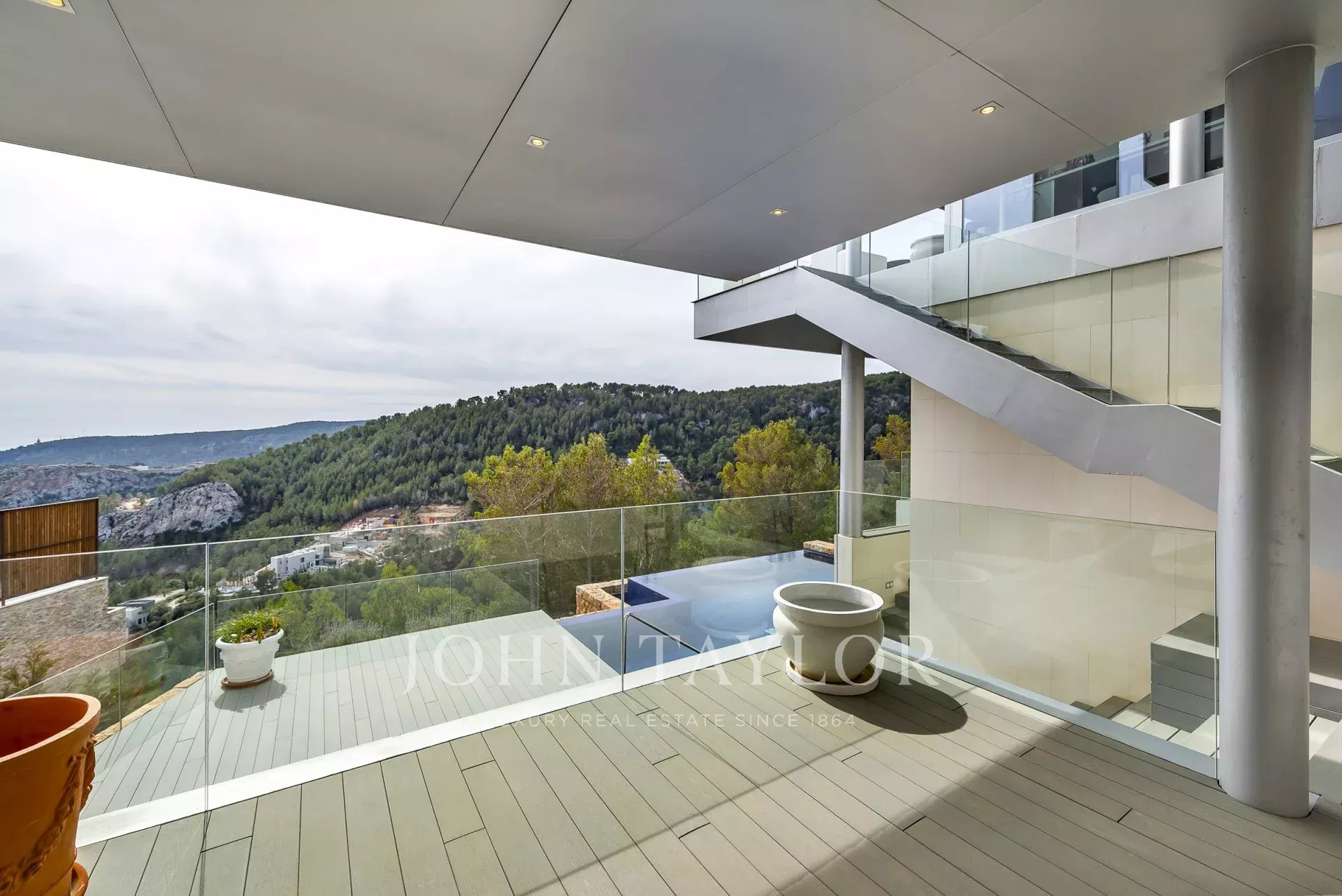 Esta impresionante propiedad, ubicada en una tranquila calle con poco tráfico y final en cul de sac, ofrece una experiencia de vida única. Con vistas panorámicas al mar y a la montaña, cada rincón de esta villa ha sido diseñado para proporcionar tranquilidad y belleza. La villa cuenta con 5 habitaciones y 5 baños, brindando un espacio amplio y cómodo para la vida cotidiana y para recibir a invitados. Además, dispone de un estudio para aquellos que buscan un espacio privado para trabajar desde casa, una sala de cine y un gimnasio completamente equipado para mantenerse en forma sin salir de casa. Relájese y revitalícese en la sauna de la propiedad, o disfrute de momentos de serenidad en la zona de chill out con vistas maravillosas, perfecta para disfrutar de espectaculares puestas de sol o noches estrelladas. La villa cuenta con una piscina rebosante, que ofrece una experiencia única al nadar con vistas al mar. Imagine sumergirse en las aguas cristalinas mientras contempla el horizonte. La modernidad y la eficiencia energética son clave en esta propiedad, que cuenta con instalaciones de vanguardia como placas solares, cargador eléctrico para coches, descalcificador y sistema de ósmosis. La domótica facilita el control y la gestión de la casa, mientras que el ascensor proporciona accesibilidad a todas las áreas. El suelo radiante frío/calor asegura un confort óptimo en todas las estaciones del año, creando un ambiente acogedor y agradable en cada rincón de la villa.