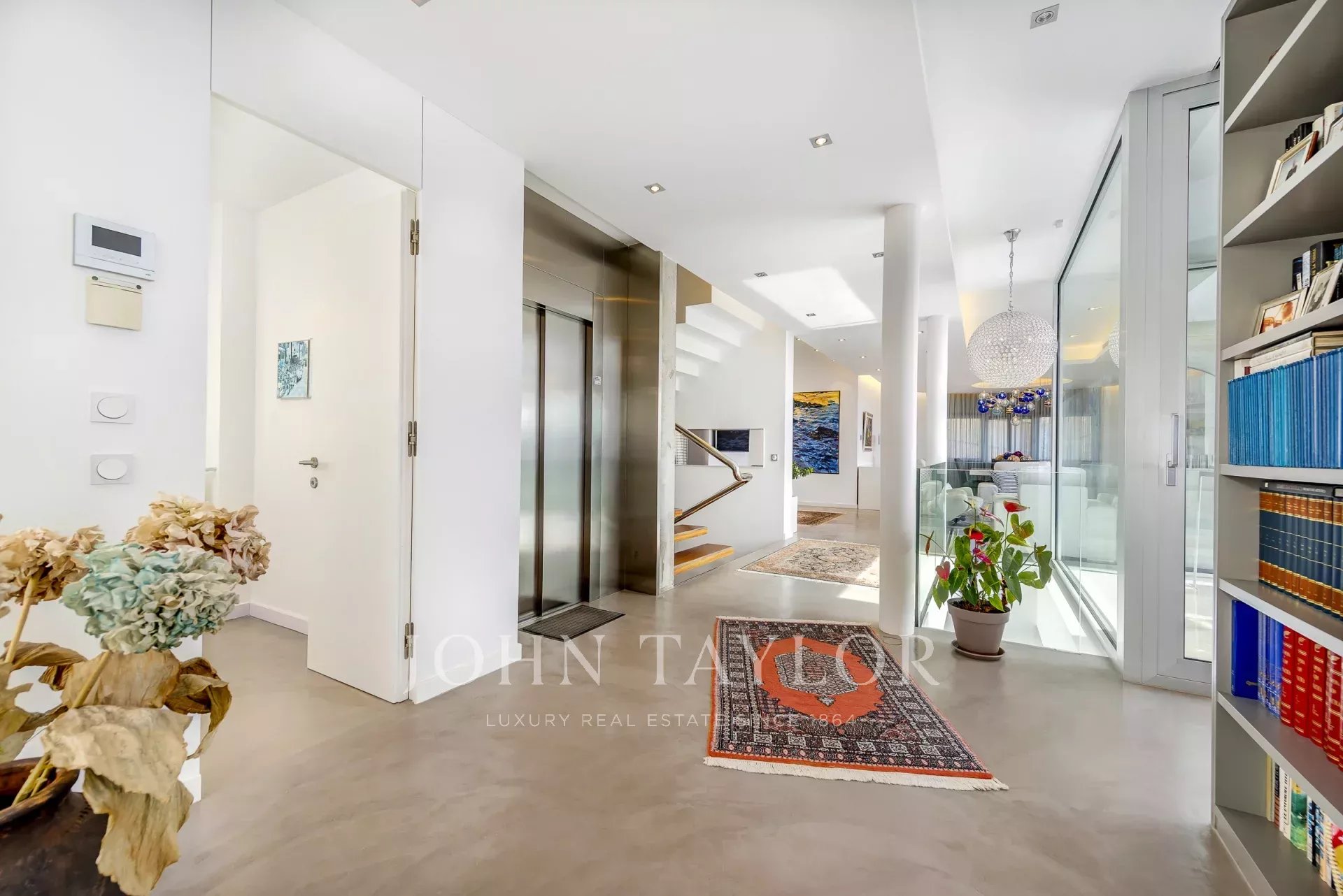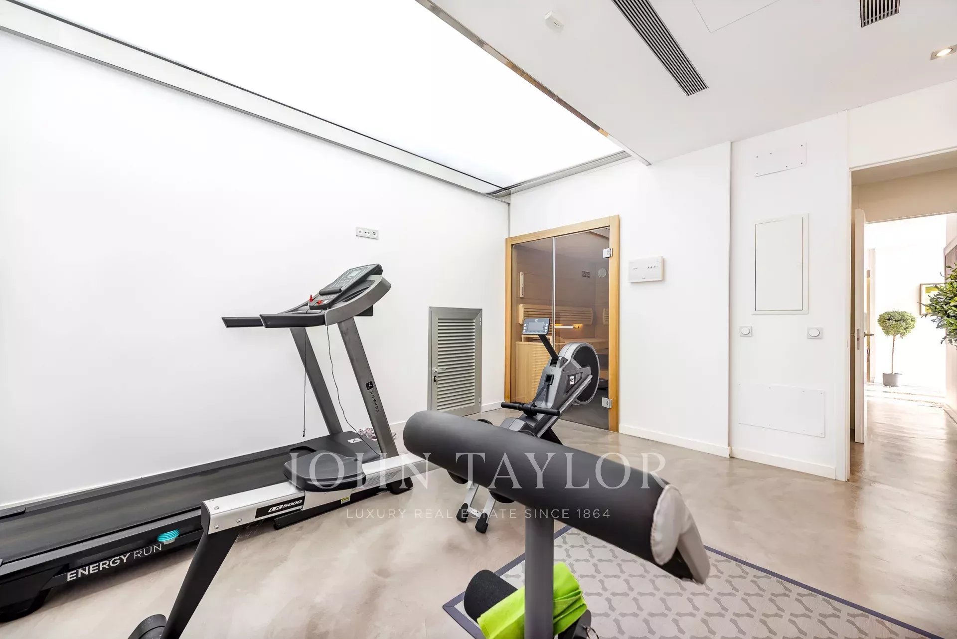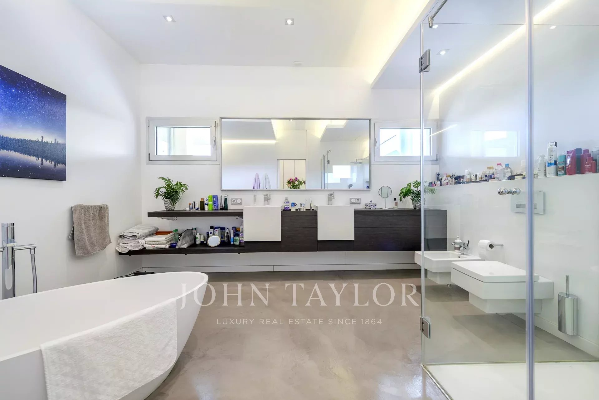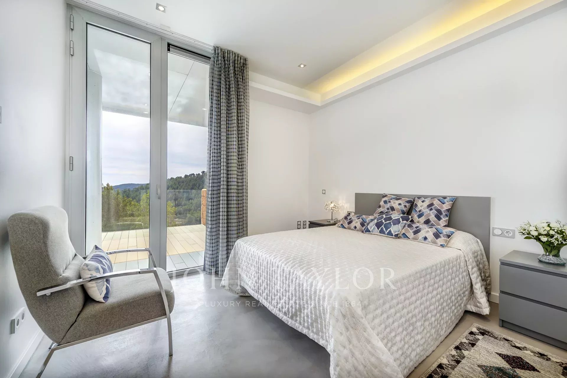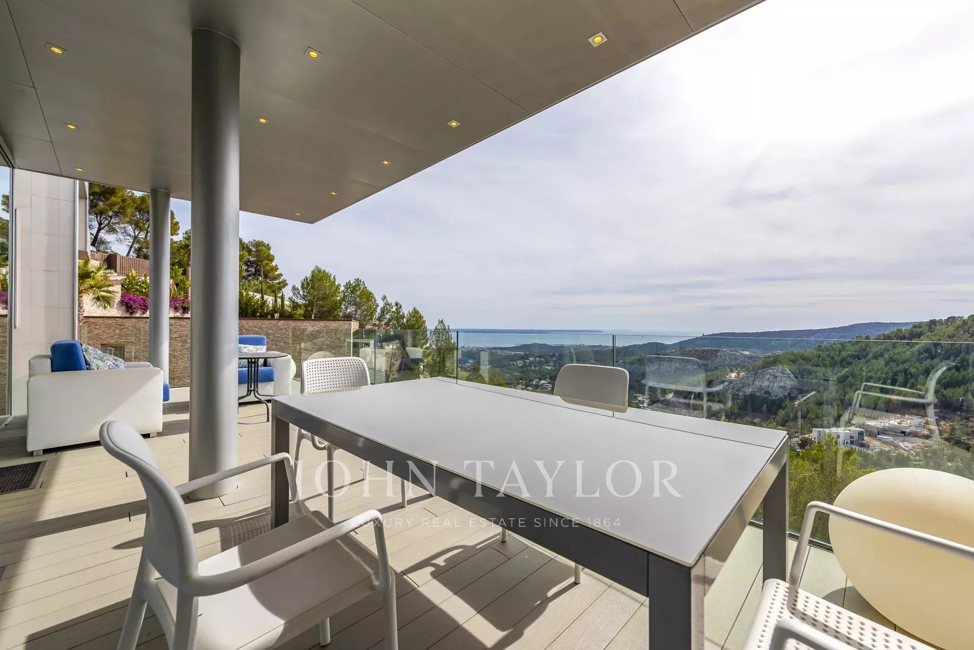 Esta impresionante propiedad, ubicada en una tranquila calle con poco tráfico y final en cul de sac, ofrece una experiencia de vida única. Con vistas panorámicas al mar y a la montaña, cada rincón de esta villa ha sido diseñado para proporcionar tranquilidad y belleza. La villa cuenta con 5 habitaciones y 5 baños, brindando un espacio amplio y cómodo para la vida cotidiana y para recibir a invitados. Además, dispone de un estudio para aquellos que buscan un espacio privado para trabajar desde casa, una sala de cine y un gimnasio completamente equipado para mantenerse en forma sin salir de casa. Relájese y revitalícese en la sauna de la propiedad, o disfrute de momentos de serenidad en la zona de chill out con vistas maravillosas, perfecta para disfrutar de espectaculares puestas de sol o noches estrelladas. La villa cuenta con una piscina rebosante, que ofrece una experiencia única al nadar con vistas al mar. Imagine sumergirse en las aguas cristalinas mientras contempla el horizonte. La modernidad y la eficiencia energética son clave en esta propiedad, que cuenta con instalaciones de vanguardia como placas solares, cargador eléctrico para coches, descalcificador y sistema de ósmosis. La domótica facilita el control y la gestión de la casa, mientras que el ascensor proporciona accesibilidad a todas las áreas. El suelo radiante frío/calor asegura un confort óptimo en todas las estaciones del año, creando un ambiente acogedor y agradable en cada rincón de la villa.