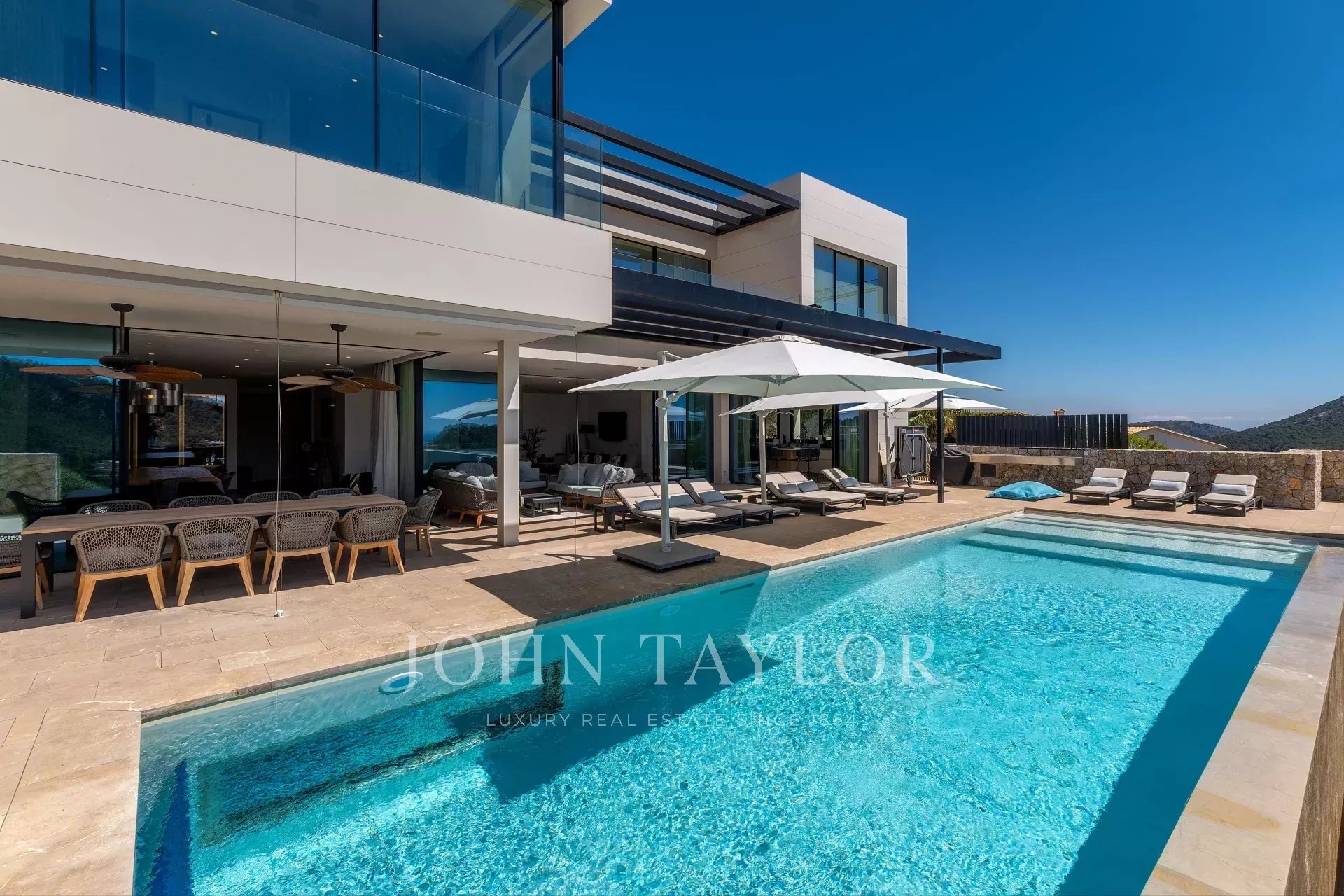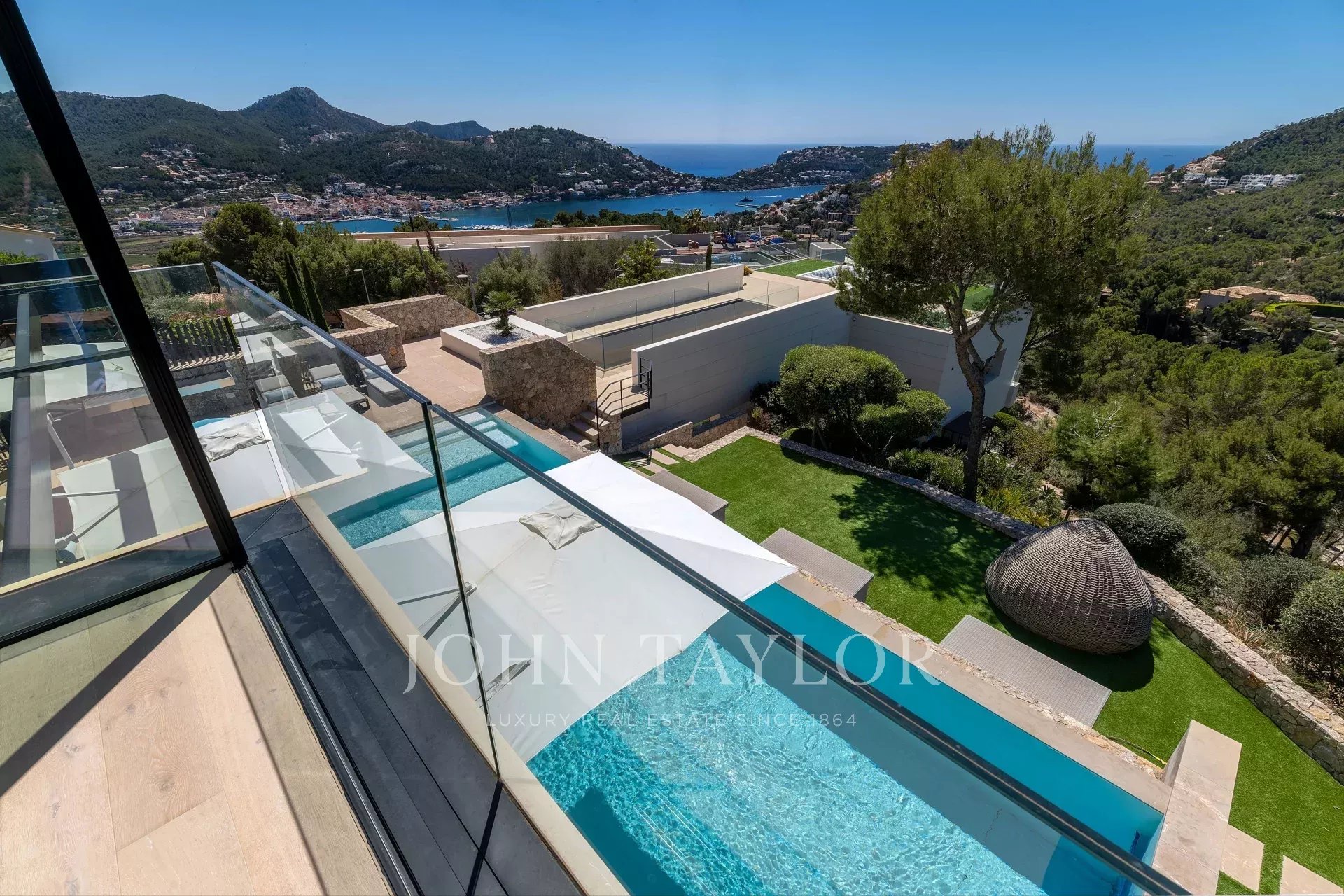 La propiedad cuenta con una excepcional residencia principal con impresionantes vistas al puerto y al mar, complementada por una casa de invitados integrada conectada por un puente que cuenta con un cine, sala de juegos y dos amplios dormitorios. Esta parcela tiene 2.471 metros cuadrados, la casa principal tiene 1.079 metros cuadrados construidos y la casa de invitados conectada tiene 301 metros cuadrados construidos. La villa cuenta con 6 dormitorios y la casa de invitados con 2 dormitorios.