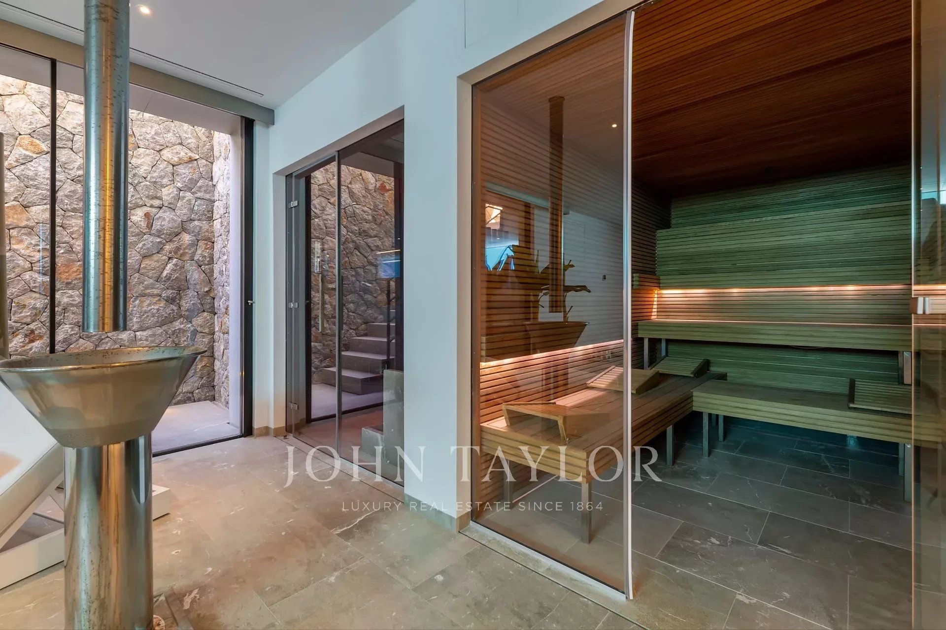 El spa completo y gimnasio de la casa principal permiten a los nuevos propietarios relajarse y disfrutar de privacidad total con sauna, baño de vapor y un tobogán de hielo desde el techo, iluminado mágicamente por luz natural desde una ventana de la piscina. Para mayor comodidad, la propiedad cuenta con un garaje integrado con plataforma giratoria para facilitar su uso y puntos de carga para coches eléctricos. Recientemente construida, esta residencia emana sofisticación con acabados de lujo de alta gama y materiales de calidad en todo el interior.