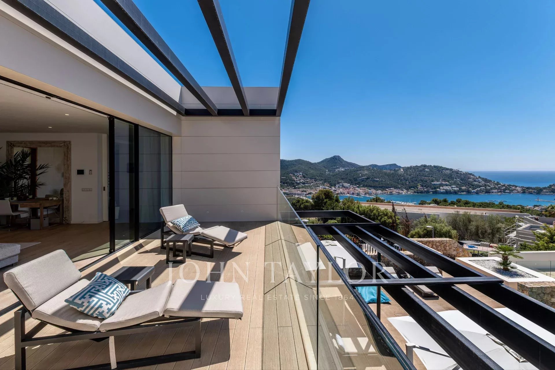 Ubicada en el pintoresco pueblo de Port d'Andratx, esta villa se encuentra en la impresionante zona suroeste de Mallorca, Islas Baleares, España. Port d'Andratx es conocido por su exclusivo puerto deportivo, boutiques de diseño y exquisitas opciones gastronómicas, lo que lo convierte en un destino codiciado para aquellos que buscan un estilo de vida sofisticado junto al mar. El puerto conserva el encanto de sus orígenes como puerto pesquero, con una amplia variedad de bares, restaurantes y hoteles mezclados entre las históricas casas de pescadores y talleres en el paseo marítimo. Igualmente, el "Club de Vela" ofrece instalaciones marinas de clase mundial con amarres de hasta 60 metros que dan acceso a algunas de las aguas más hermosas del mar Mediterráneo.