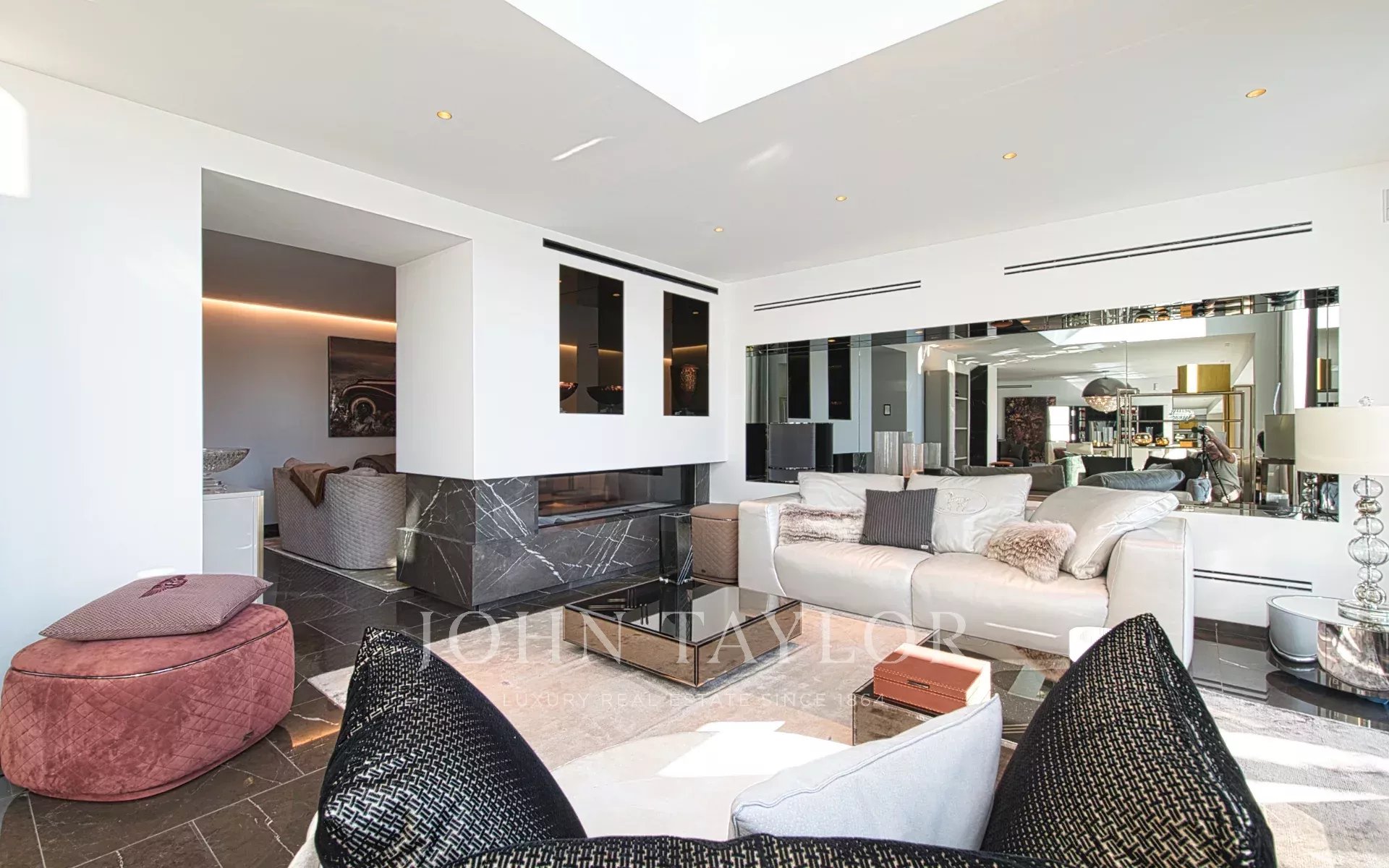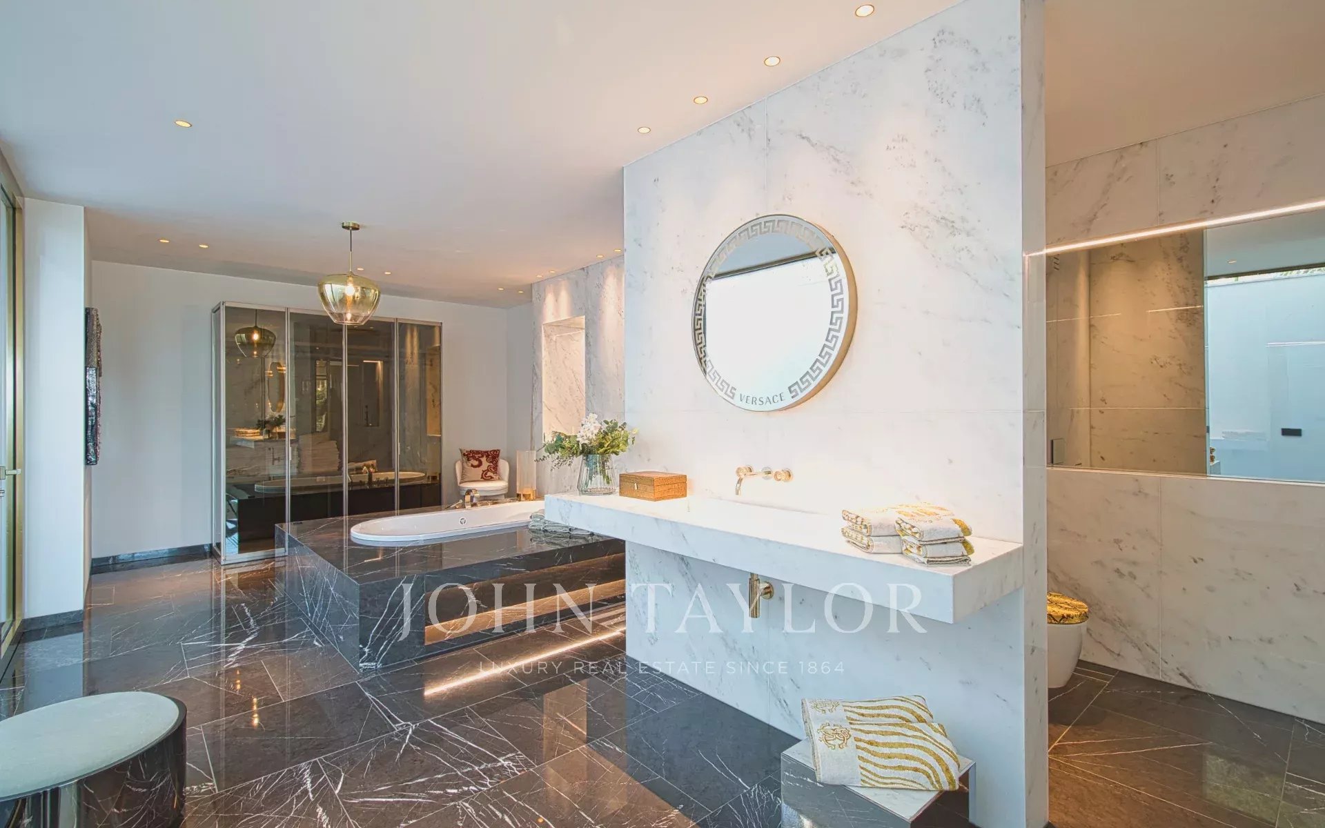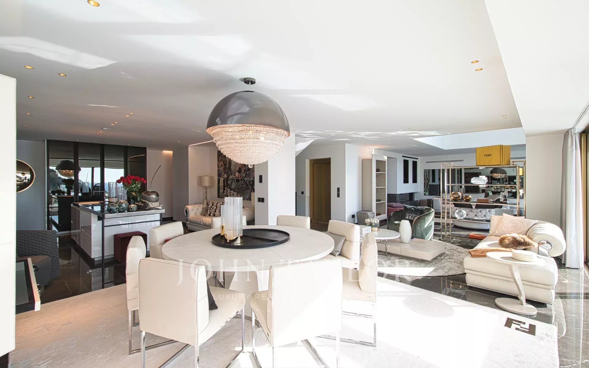 Tres excepcionales variedades de mármol definen la estética distintiva de la villa. El mobiliario de Fendi Casa y Bentley Home (valorado en 1,2 millones de euros) completa esta obra maestra del interiorismo contemporáneo.