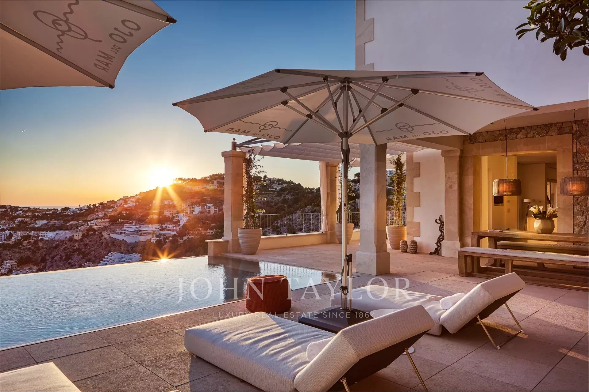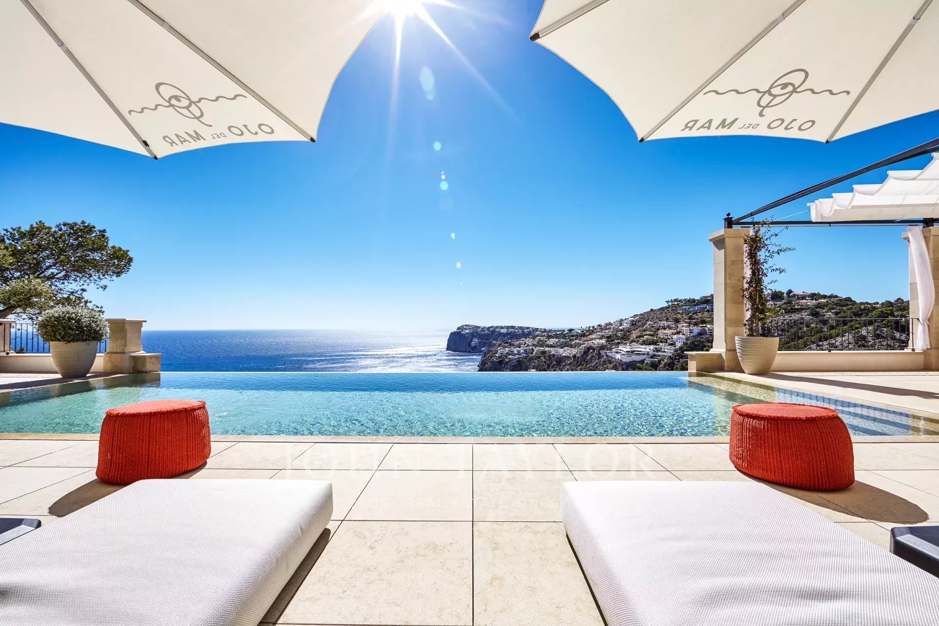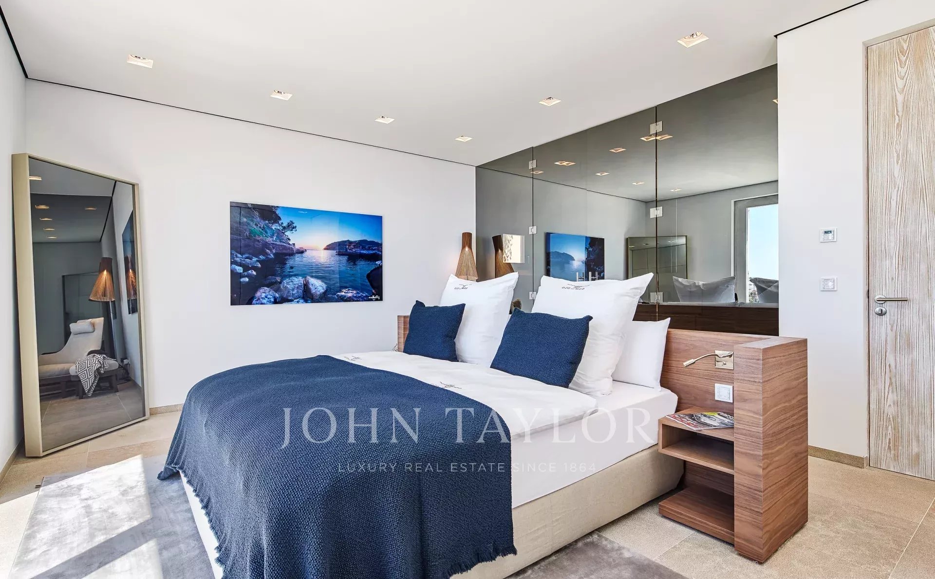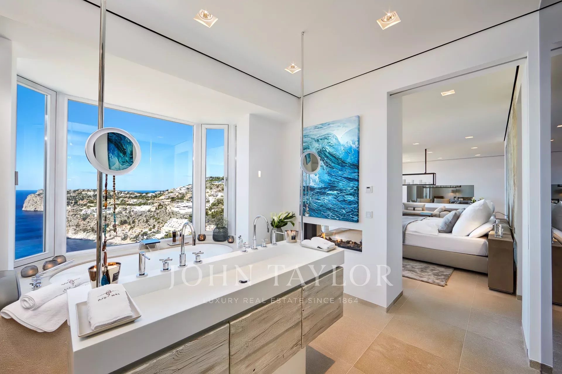 Esta lujosa propiedad está situada en un lugar codiciado por encima de la bahía de Cala Llamp y ofrece impresionantes vistas panorámicas al mar. La villa tiene una superficie construida de 700m2 en tres niveles. En la planta baja, hay un elegante hall de entrada que conduce a la sala de TV, sala de estar, comedor y cocina. La espaciosa zona de estar se extiende a través de las pérgolas hasta las terrazas, donde hay dos cocinas exteriores con parrillas de barbacoa y una gran mesa de comedor, así como un cuarto de baño. Otro punto a destacar es la piscina infinita de 60m2. La zona exterior está diseñada para disfrutar perfectamente del clima mediterráneo. Se puede acceder a la planta superior a través del ascensor o de la escalera elegantemente iluminada, donde se encuentra la zona de dormitorios. Ésta consta de dos dormitorios con baños en suite y una cómoda suite principal. Ésta consta de una antesala, una amplia zona de dormitorio y un lujoso cuarto de baño con bañera en el mirador. En el sótano, además del garaje de 100m2, que ofrece espacio para al menos 5 coches, hay una bodega, un gimnasio con sauna, una sala de cine, un dormitorio de servicio con baño en-suite, otro baño, una lavandería, un lavadero y un trastero. La propiedad se vende con muebles incluidos.