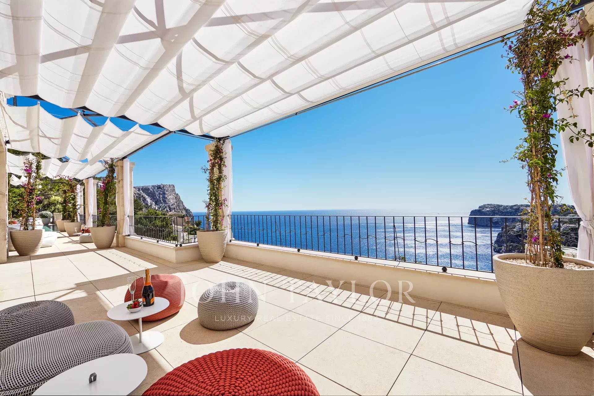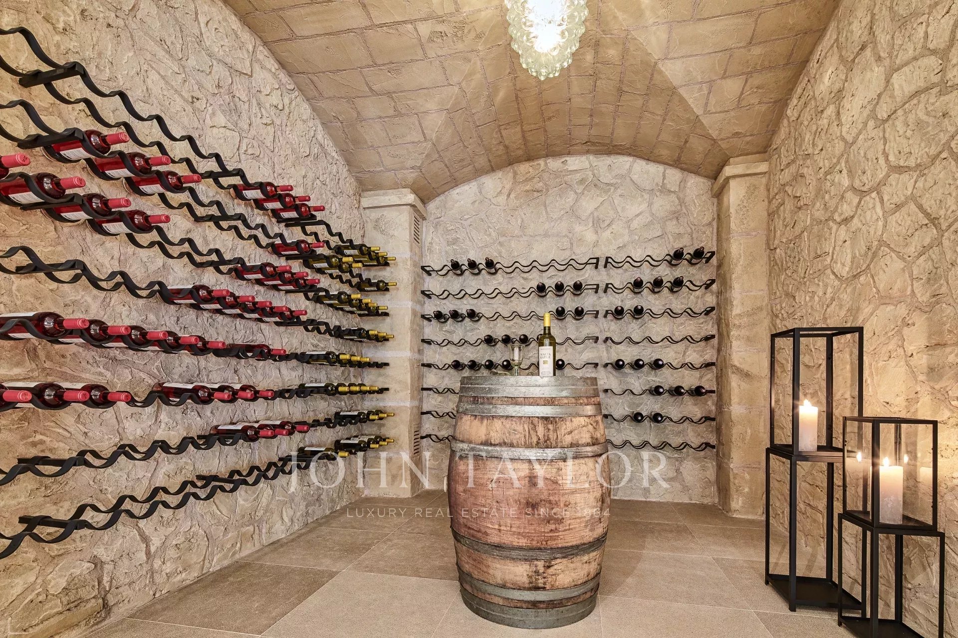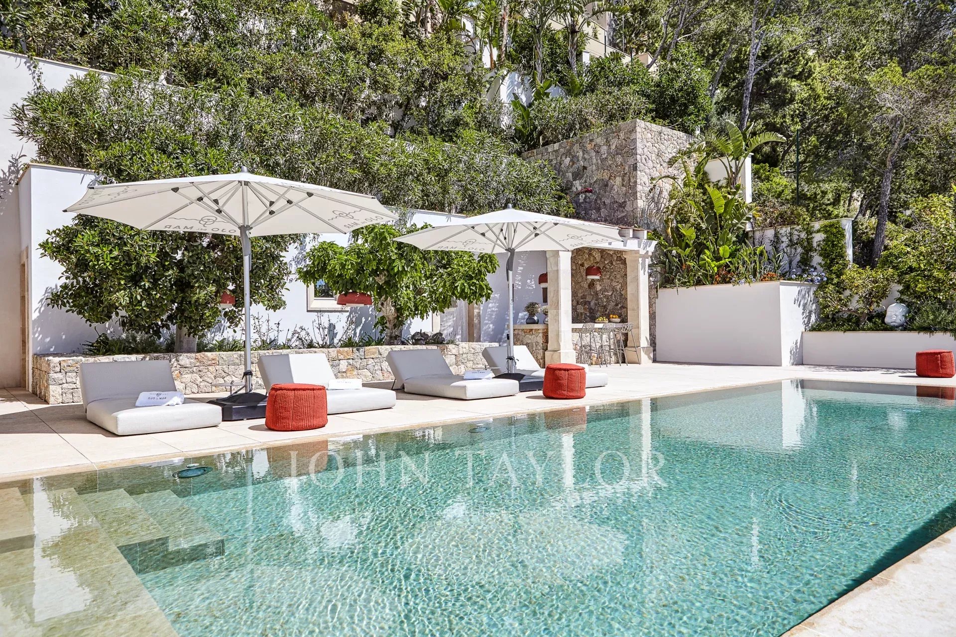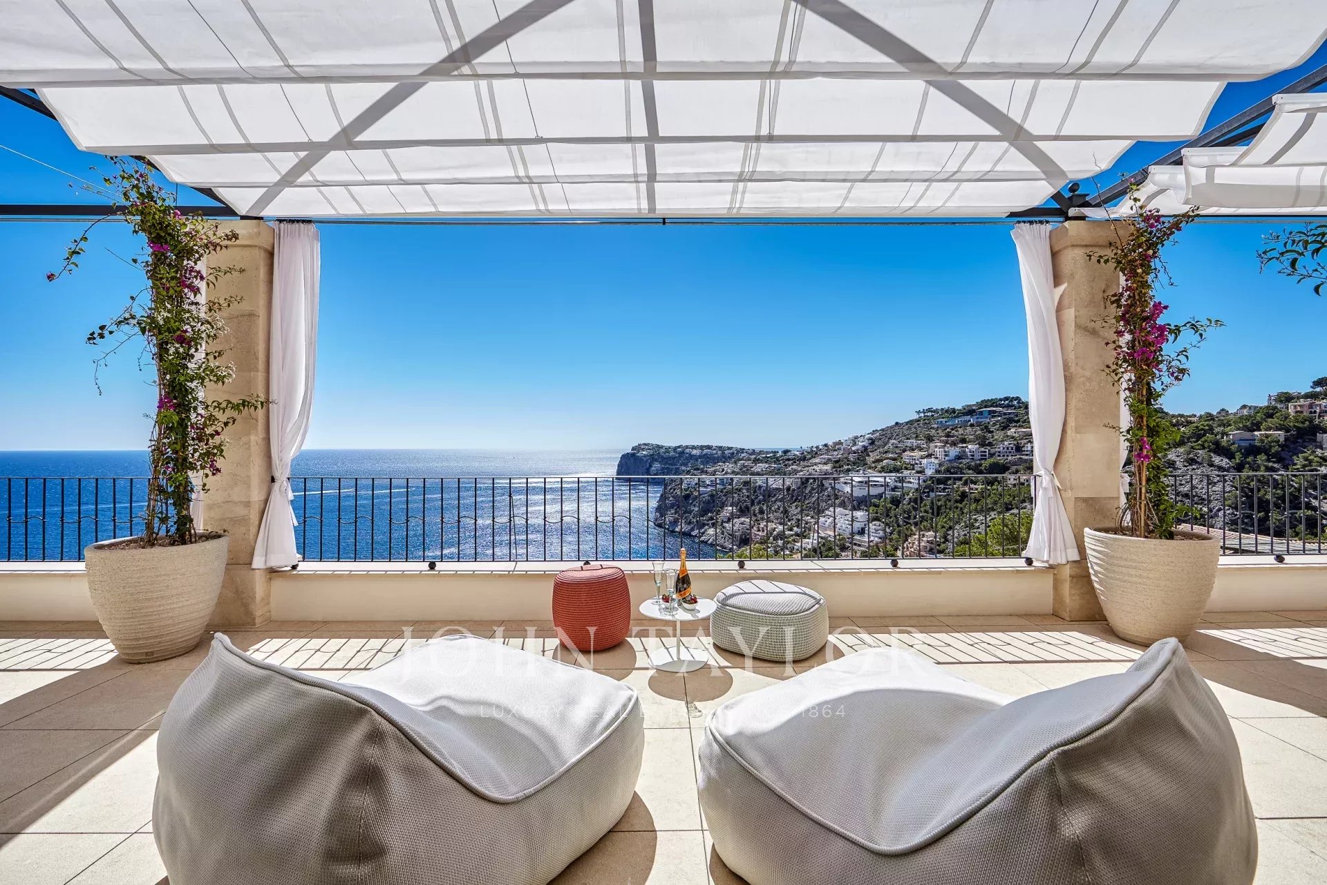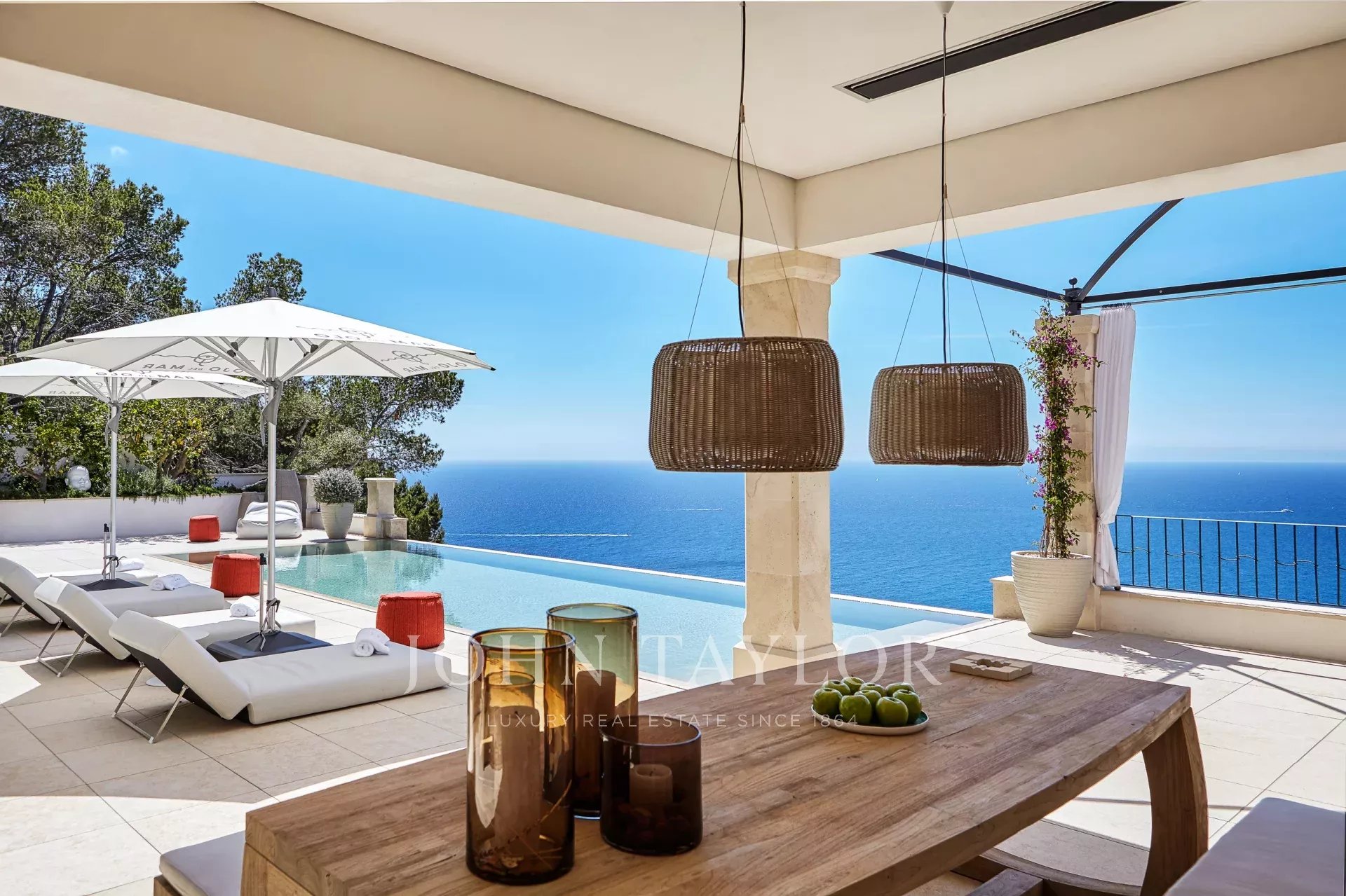 Esta lujosa propiedad está situada en un lugar codiciado por encima de la bahía de Cala Llamp y ofrece impresionantes vistas panorámicas al mar. La villa tiene una superficie construida de 700m2 en tres niveles. En la planta baja, hay un elegante hall de entrada que conduce a la sala de TV, sala de estar, comedor y cocina. La espaciosa zona de estar se extiende a través de las pérgolas hasta las terrazas, donde hay dos cocinas exteriores con parrillas de barbacoa y una gran mesa de comedor, así como un cuarto de baño. Otro punto a destacar es la piscina infinita de 60m2. La zona exterior está diseñada para disfrutar perfectamente del clima mediterráneo. Se puede acceder a la planta superior a través del ascensor o de la escalera elegantemente iluminada, donde se encuentra la zona de dormitorios. Ésta consta de dos dormitorios con baños en suite y una cómoda suite principal. Ésta consta de una antesala, una amplia zona de dormitorio y un lujoso cuarto de baño con bañera en el mirador. En el sótano, además del garaje de 100m2, que ofrece espacio para al menos 5 coches, hay una bodega, un gimnasio con sauna, una sala de cine, un dormitorio de servicio con baño en-suite, otro baño, una lavandería, un lavadero y un trastero. La propiedad se vende con muebles incluidos.