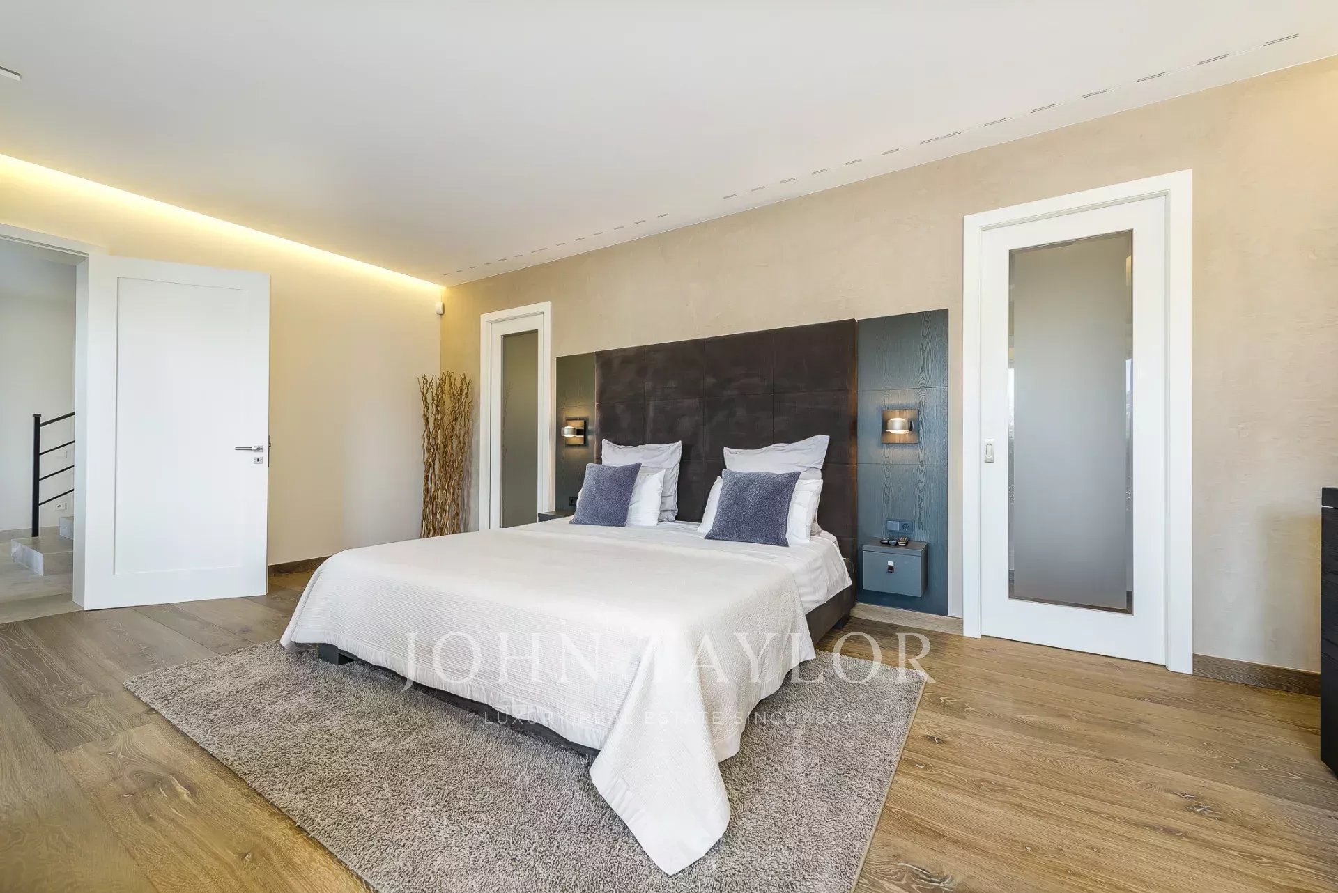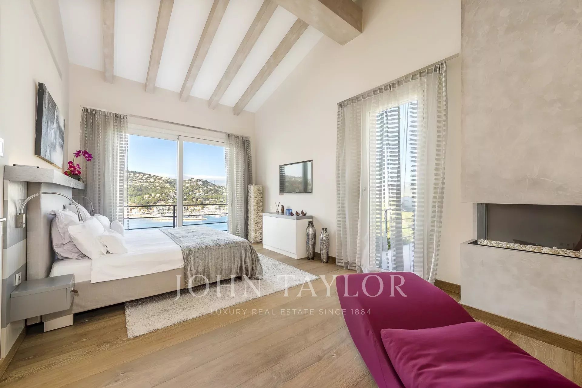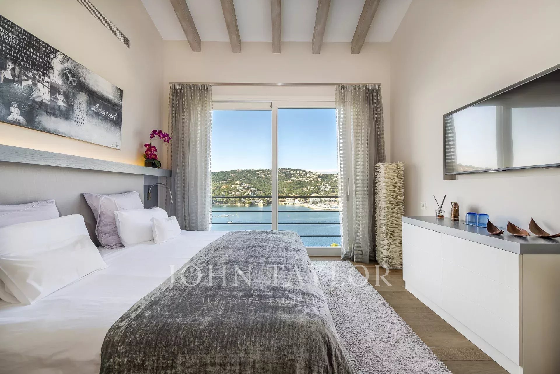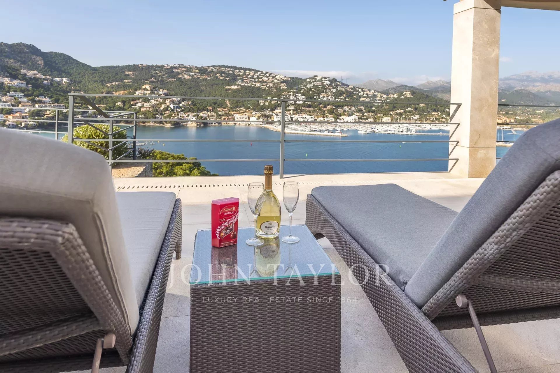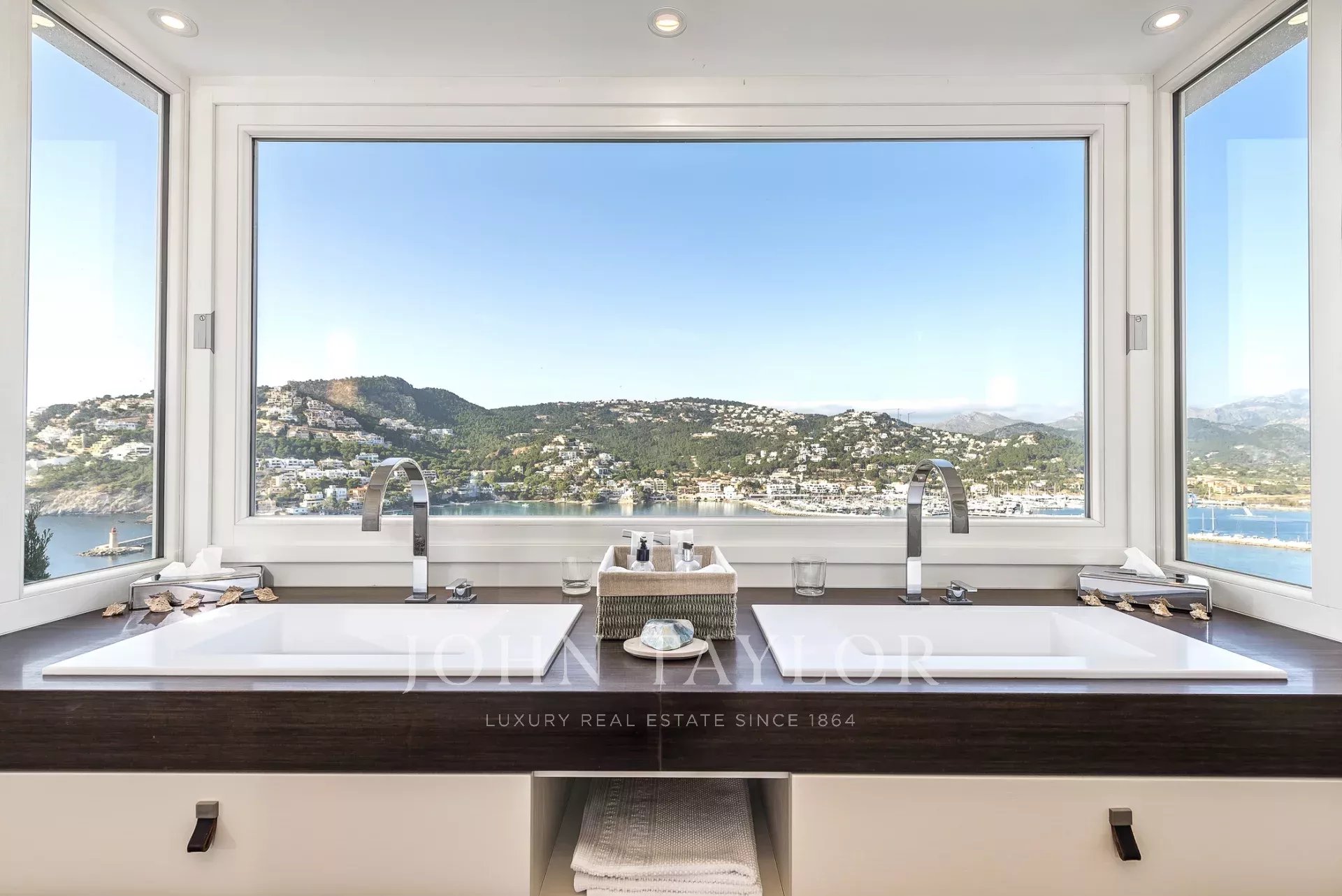 Villa de lujo en la mejor ubicación. En esta villa de nueva construcción, 5 dormitorios con baños en suite se distribuyen en 600 m2 de espacio habitable. La construcción y el diseño modernos se extienden por toda la casa. La cocina americana totalmente equipada no deja nada que desear. Ya sea desde el dormitorio, la acogedora sala de estar con chimenea o la cocina, todas las habitaciones tienen unas vistas impresionantes sobre la bahía de Puerto de Andratx y el puerto. En el exterior se encuentra la piscina infinita climatizada con zona chill-out y una gran mesa de comedor con barbacoa. Destaca especialmente la sauna, desde la que podrá disfrutar de una magnífica vista al mar gracias a su gran cristalera. Las puestas de sol están garantizadas.