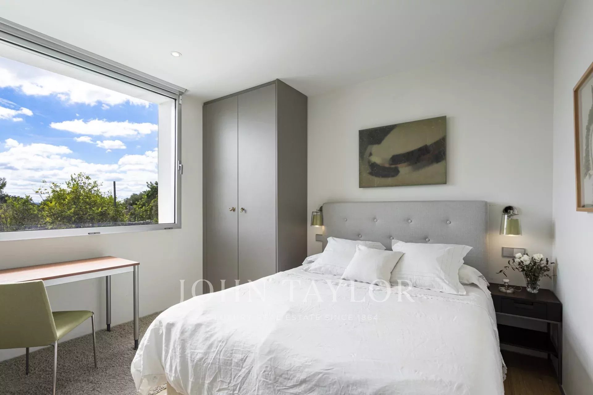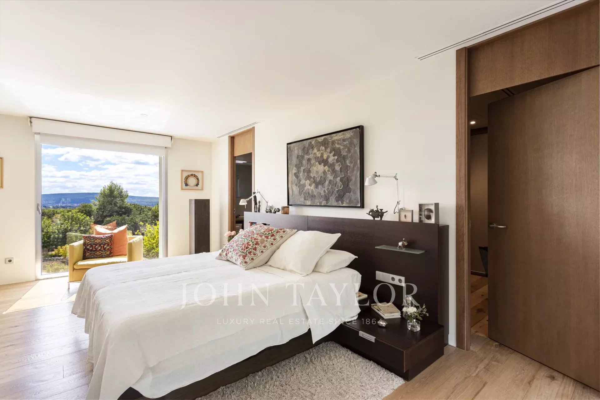 La finca consta de dos residencias independientes. La casa principal, de arquitectura moderna, destaca por sus impresionantes ventanales de suelo a techo que inundan de luz natural todos los espacios y permiten vistas panorámicas del campo mallorquín. Cuenta con dos dormitorios, dos baños y una extraordinaria suite principal situada en la planta superior junto a un despacho diáfano con vistas a ambos lados de la villa.