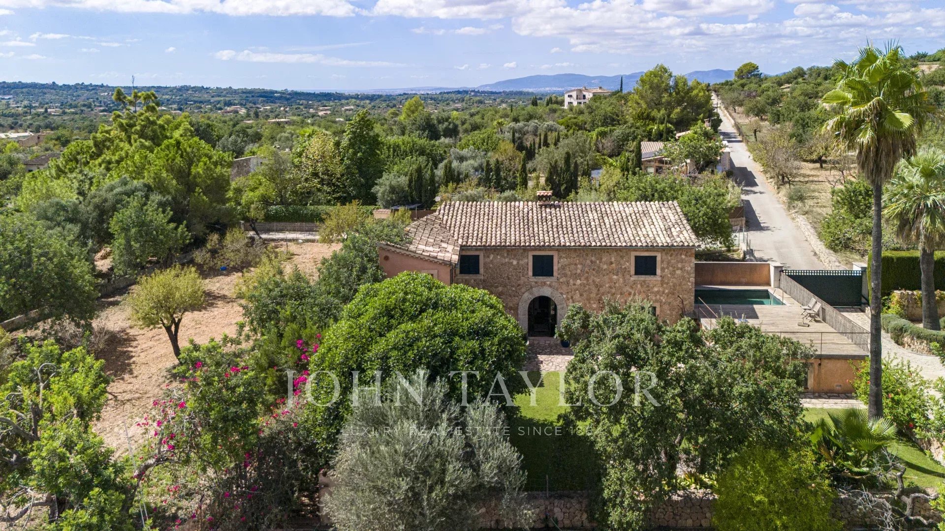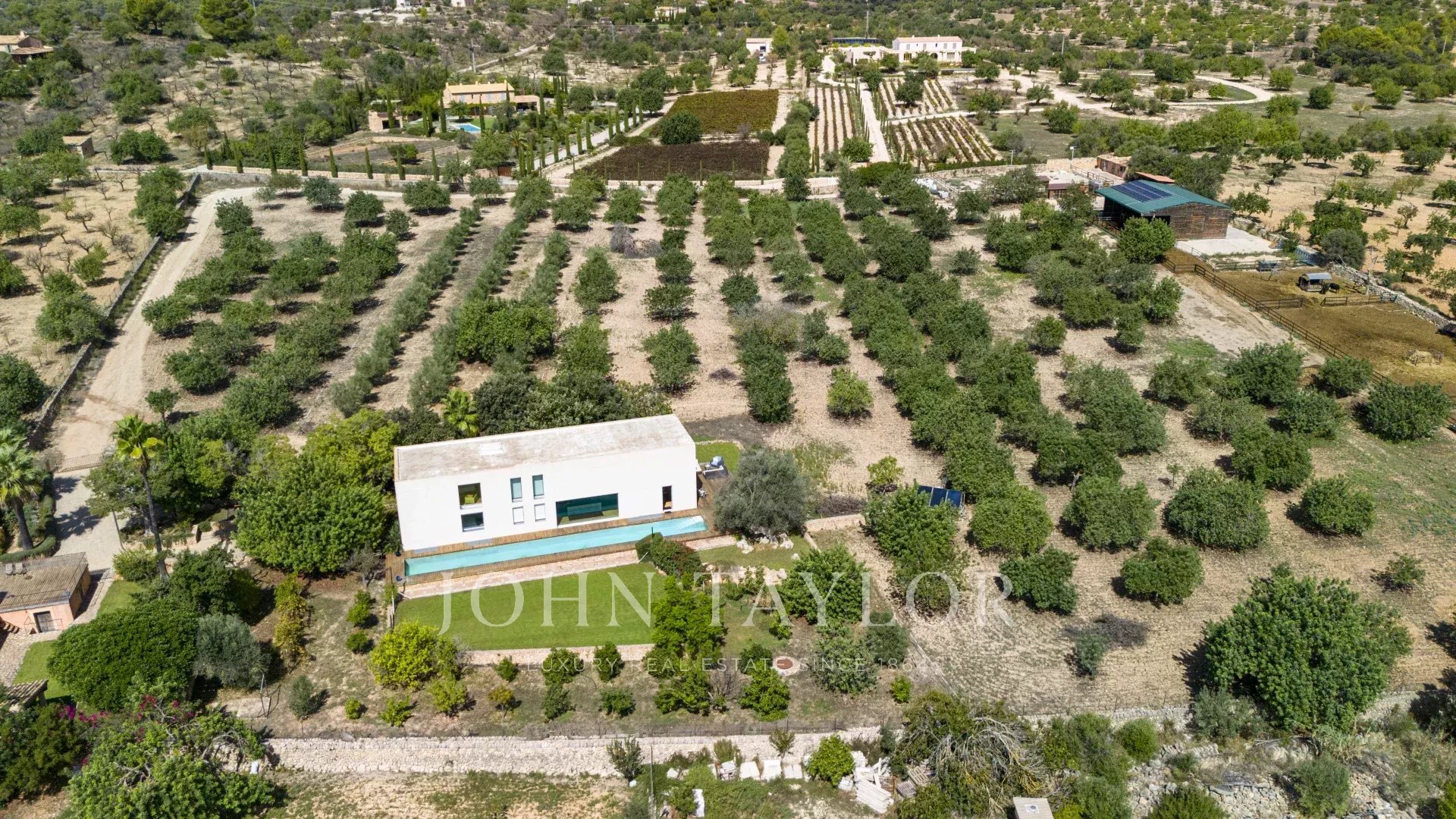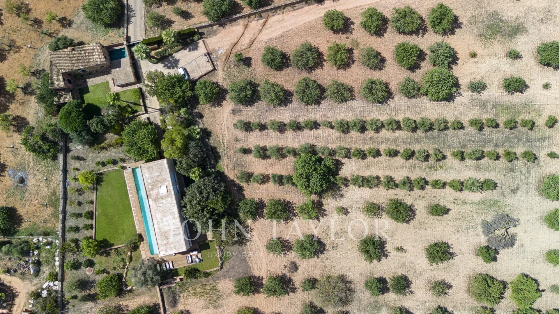 Con una parcela de 28.000 metros cuadrados, la propiedad ofrece total privacidad y un entorno natural único con más de doscientos algarrobos centenarios, establos para caballos, picadero y un edificio agrícola. Todo ello enmarcado por las incomparables vistas de la Serra de Tramuntana, y a tan sólo quince minutos en coche de Palma.