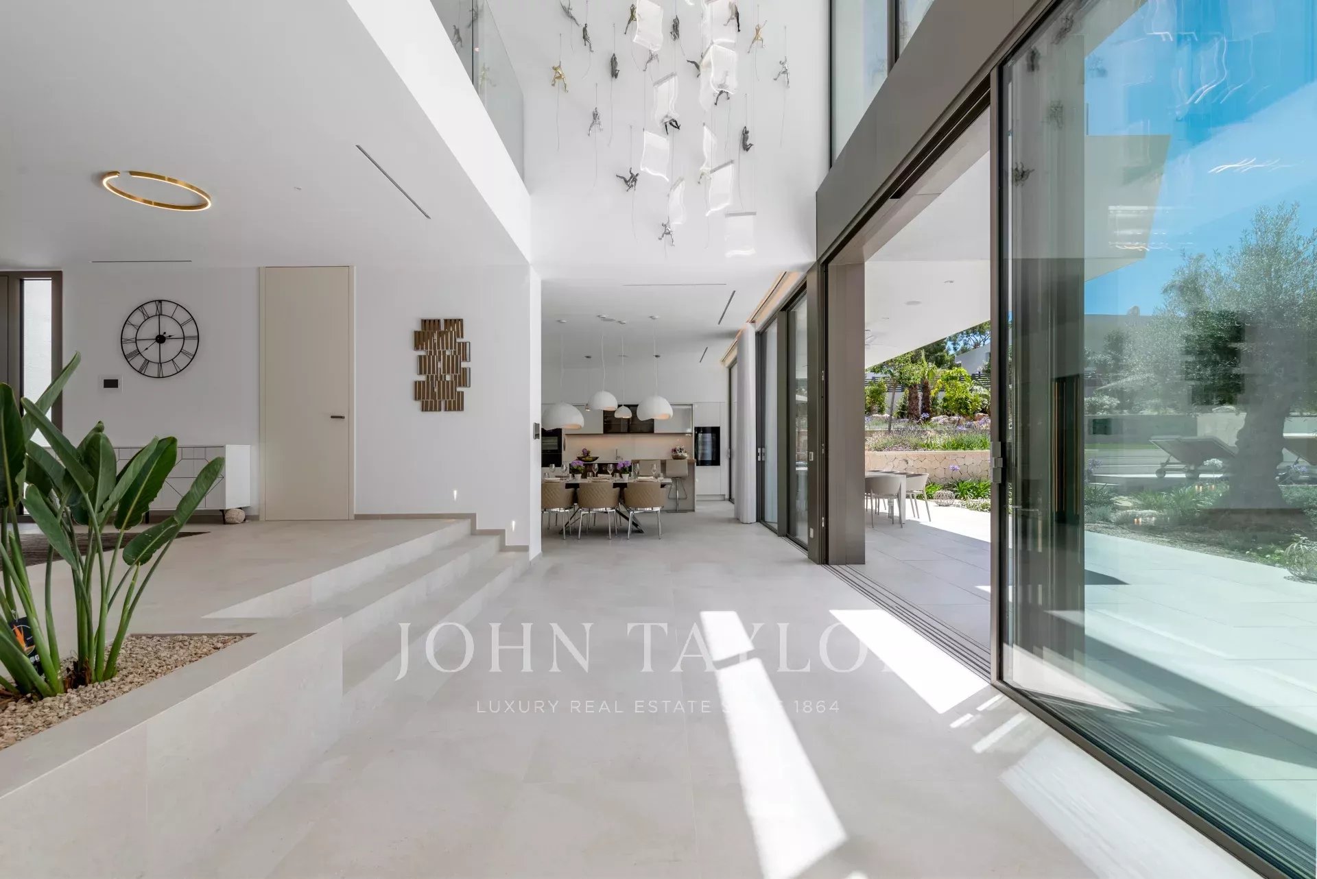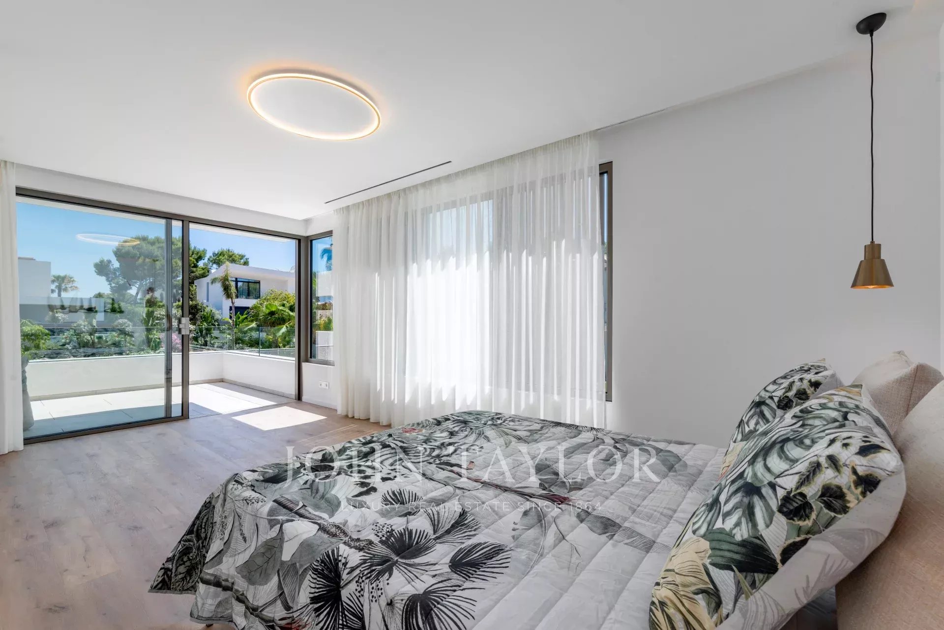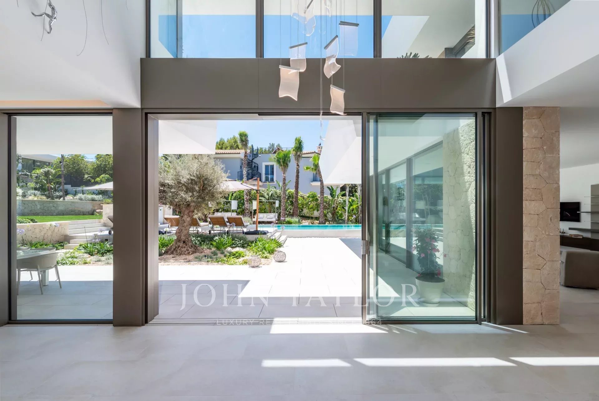 El exterior tropical-mediterráneo cuenta con una piscina de agua salada de 20 m, terraza, zonas de sombra y césped de 200 m². Disfrute del sol todo el día en esta ubicación perfecta. ¡Contáctenos para más información!