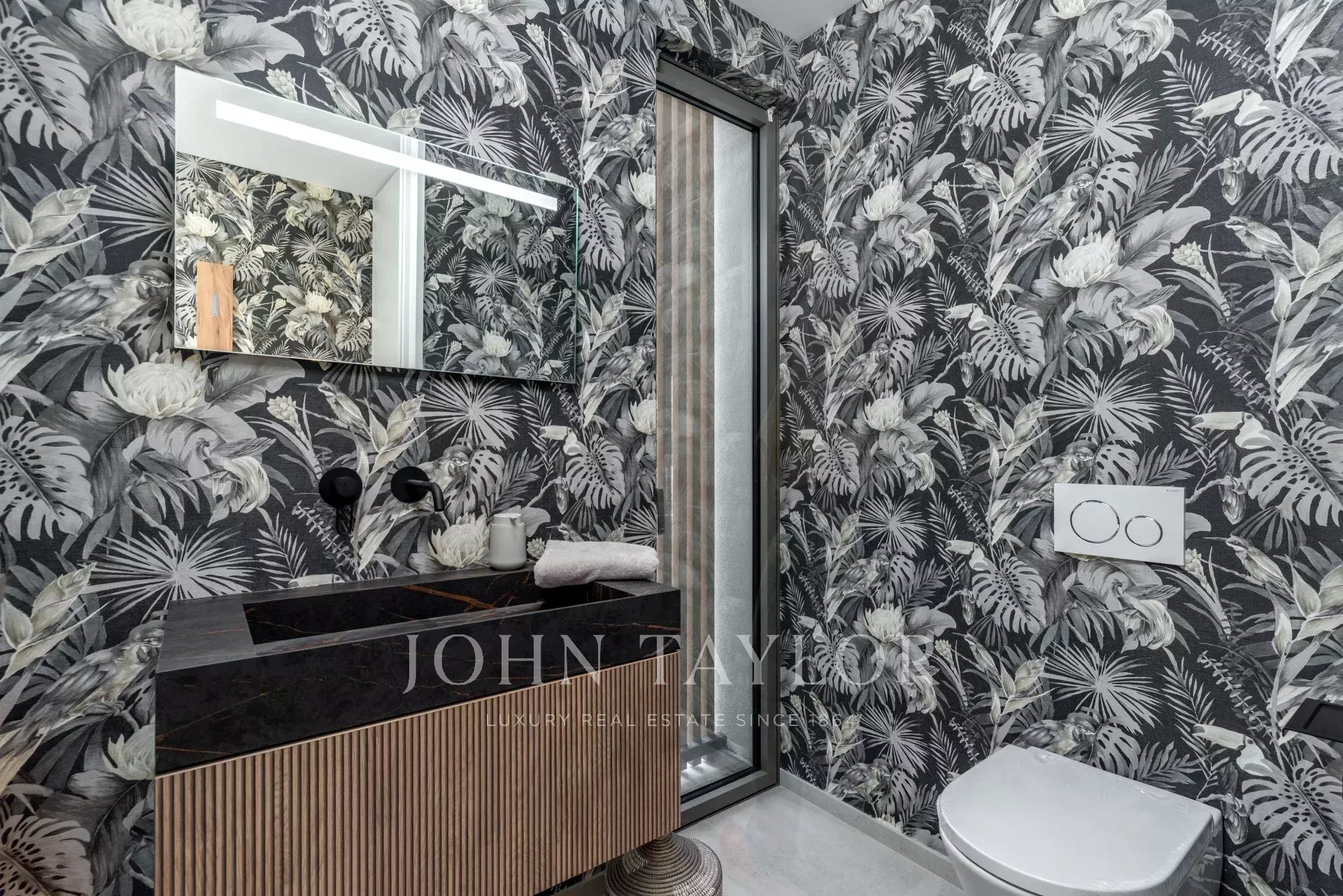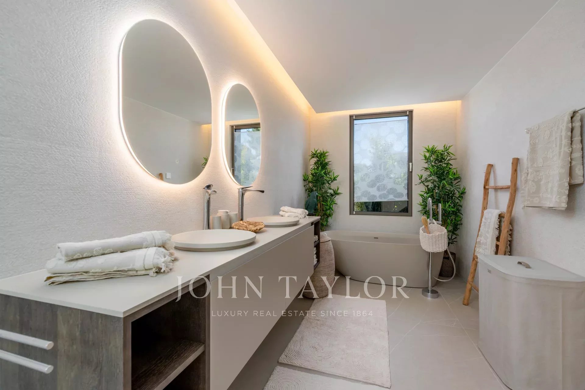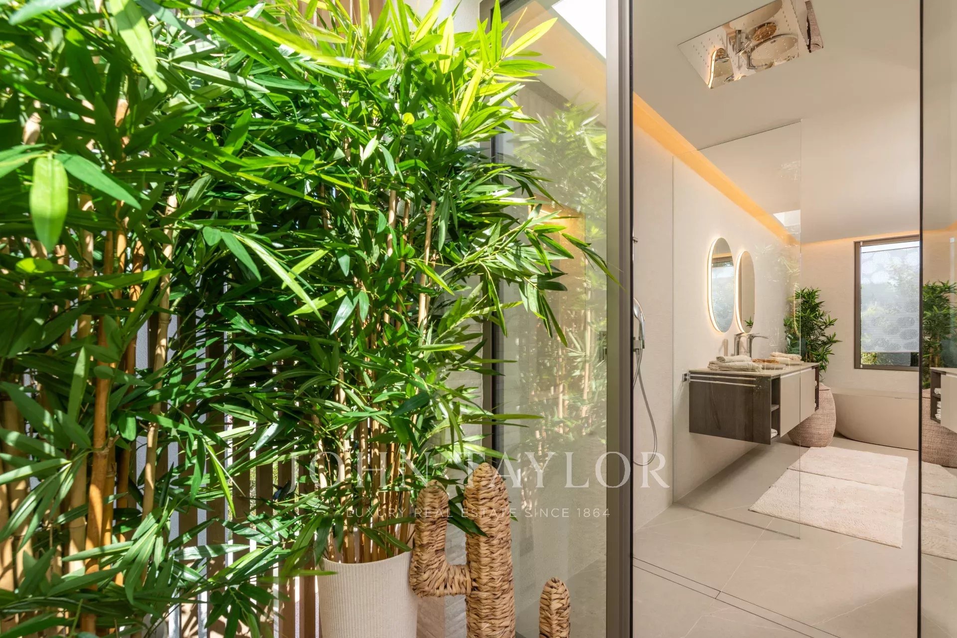 El exterior tropical-mediterráneo cuenta con una piscina de agua salada de 20 m, terraza, zonas de sombra y césped de 200 m². Disfrute del sol todo el día en esta ubicación perfecta. ¡Contáctenos para más información!
