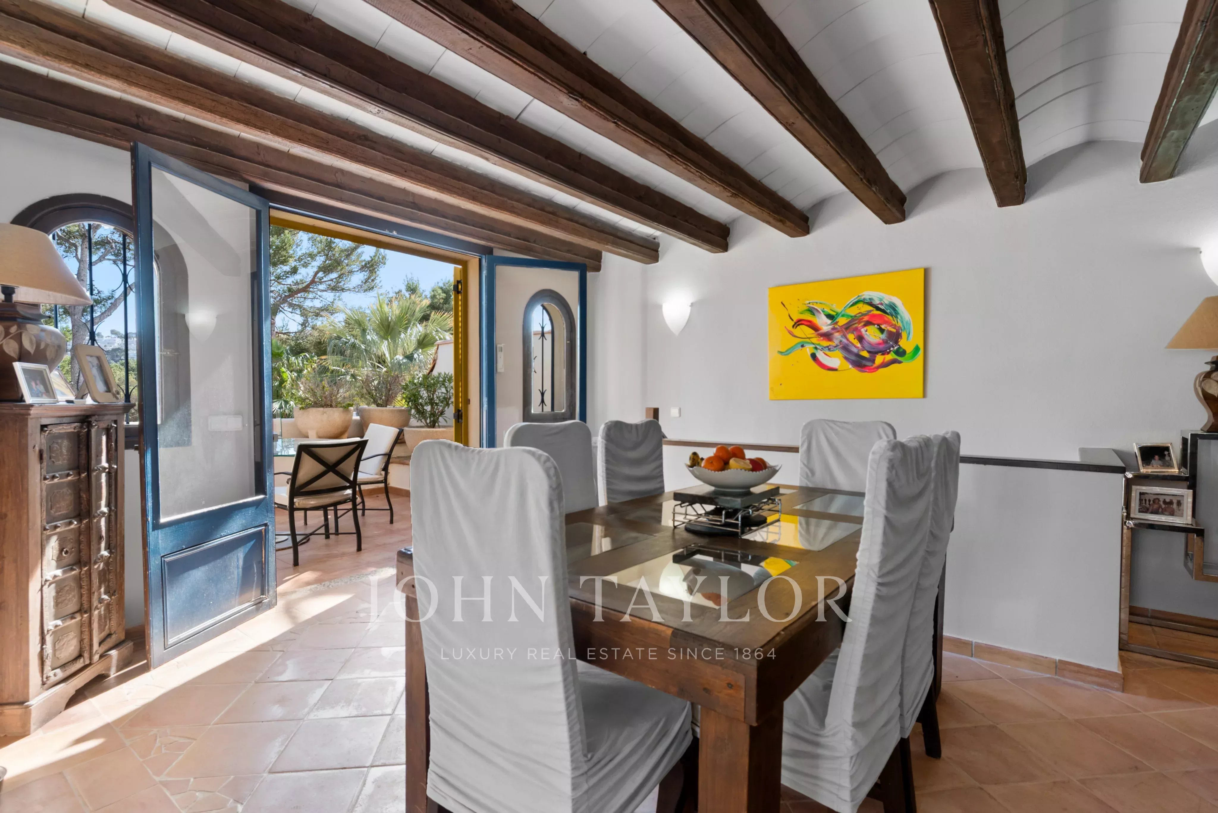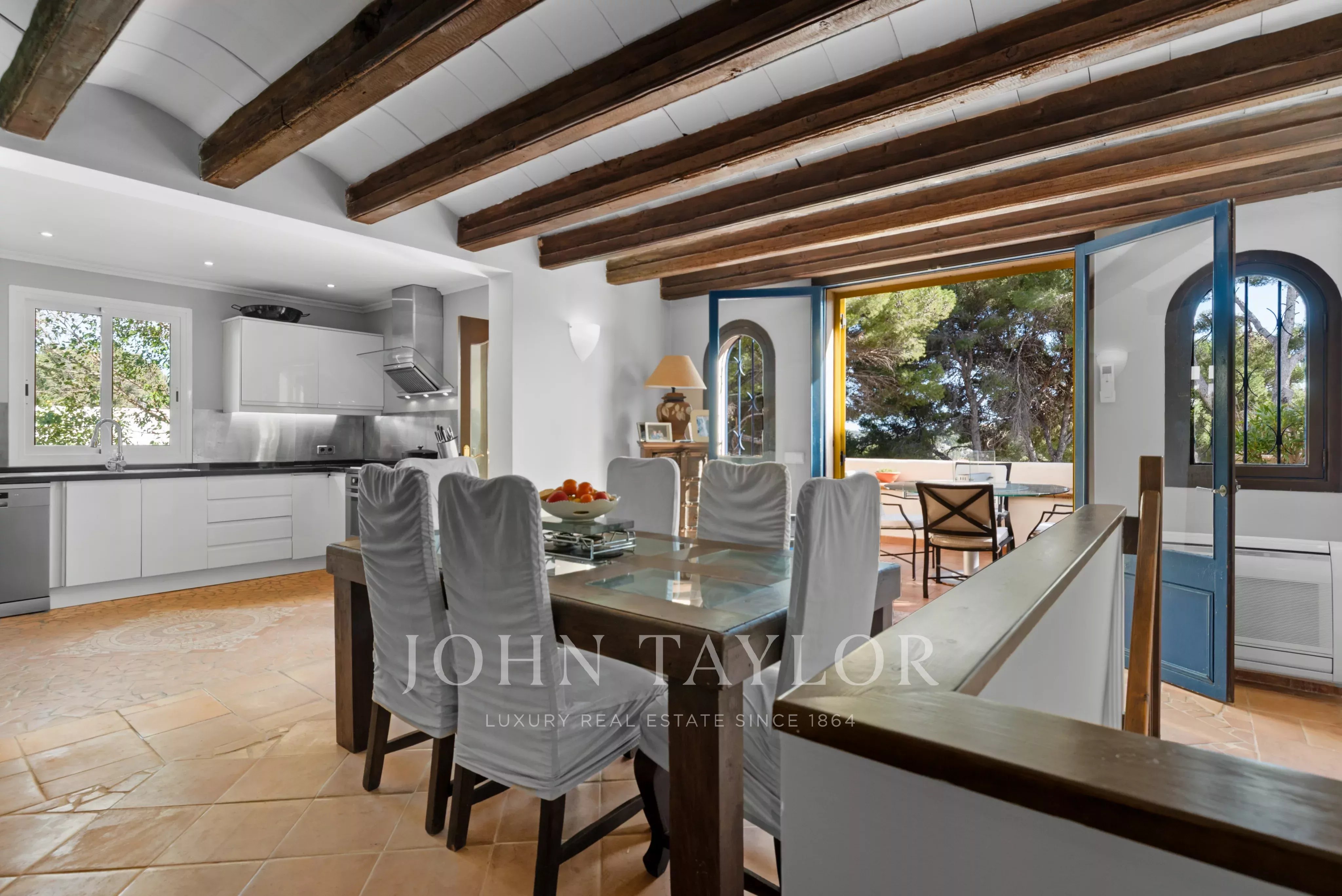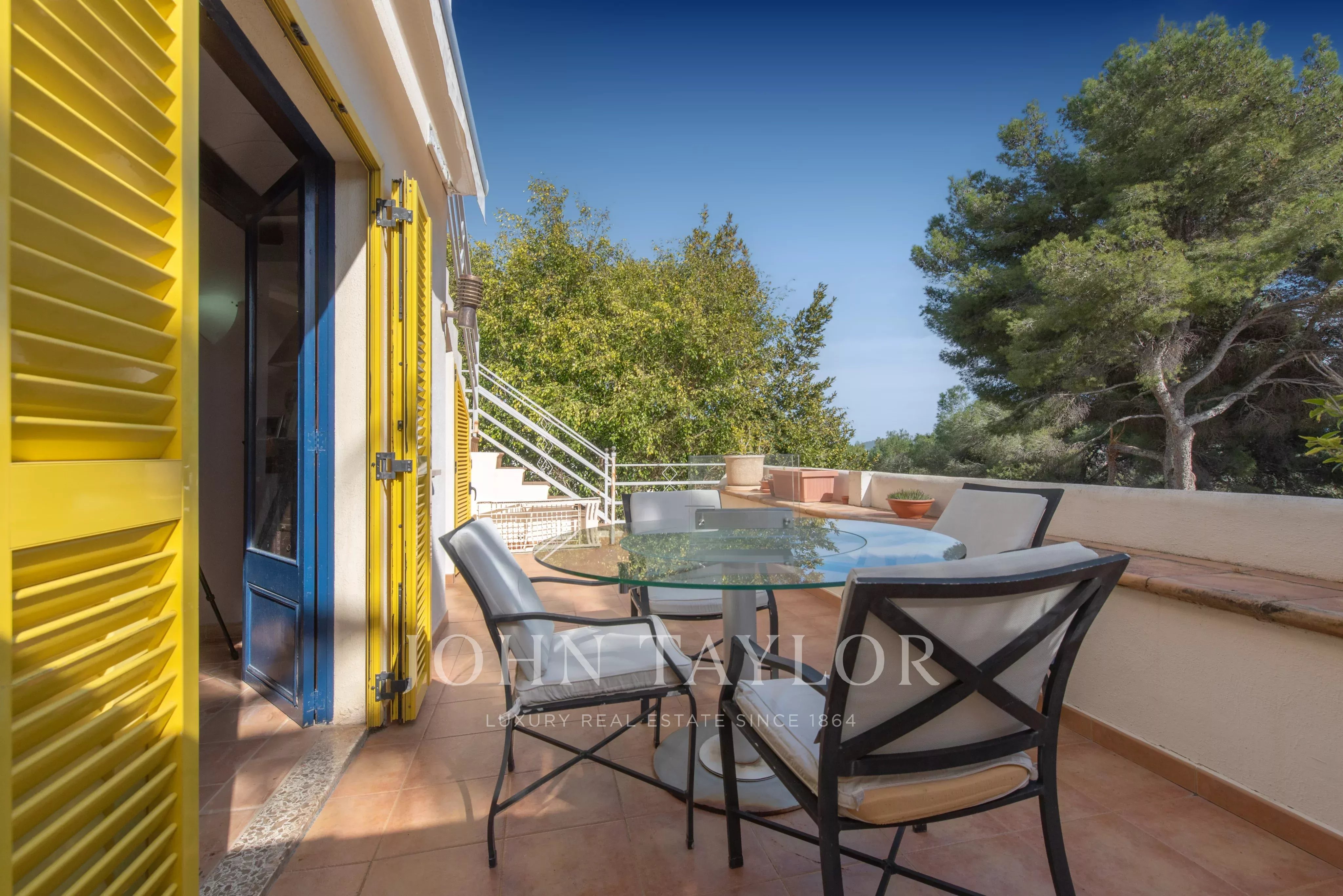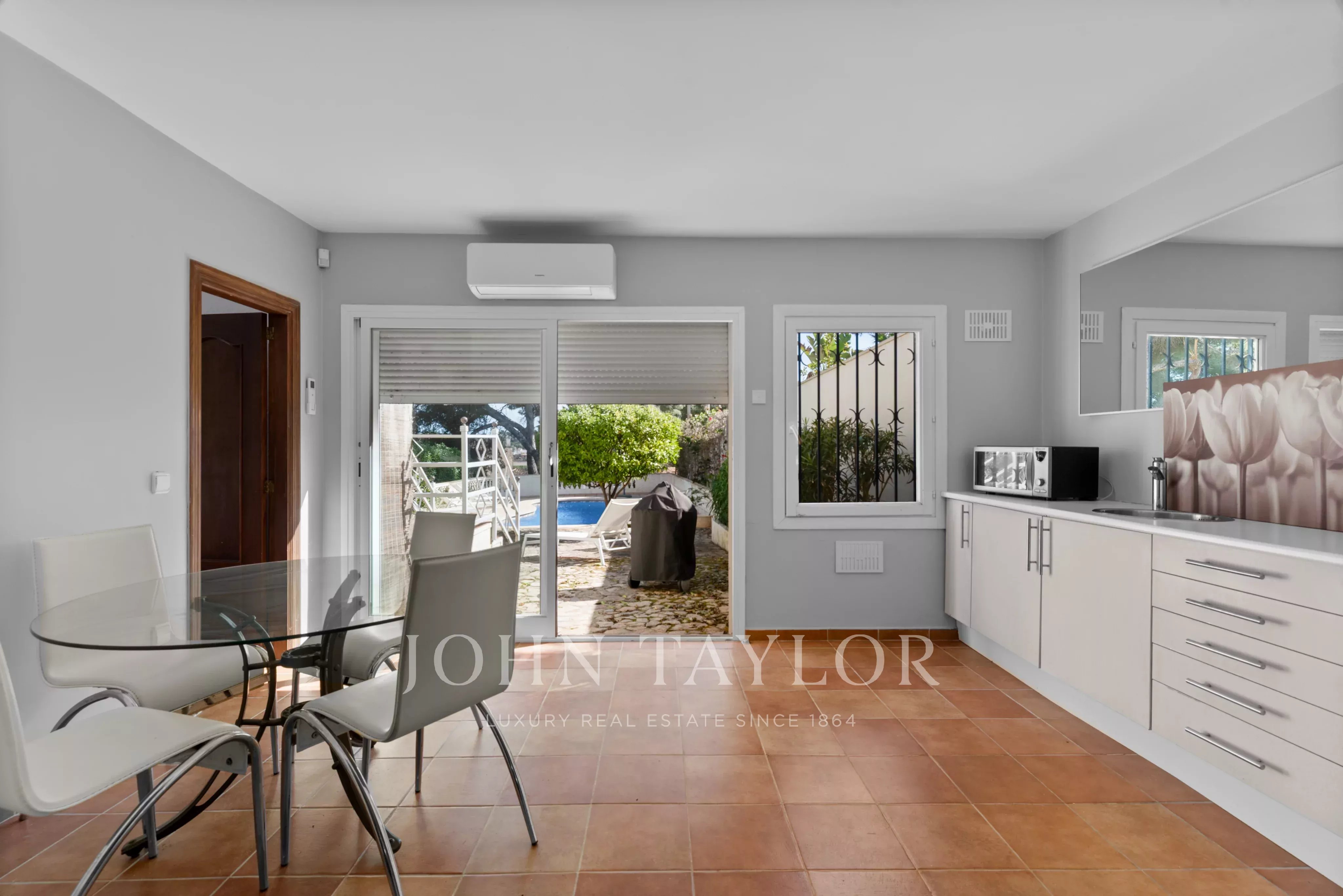 En el exterior es donde realmente se vive el estilo mediterráneo: jardín privado con piscina, varias terrazas y una cocina exterior que invita a disfrutar del aire libre durante gran parte del año. Ya sea para largas cenas de verano con amigos o para un café tranquilo por la mañana, hay rincones para cada momento.