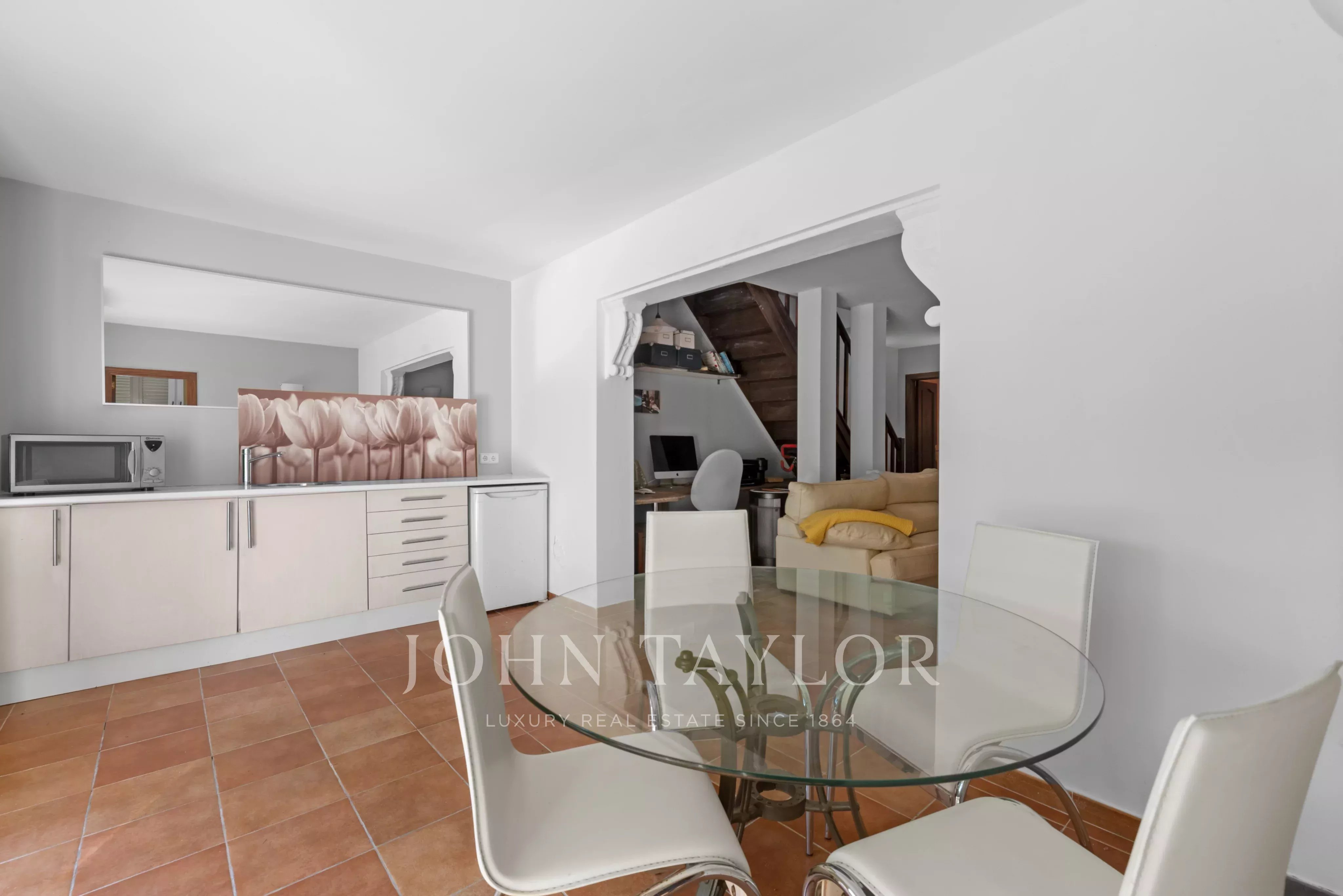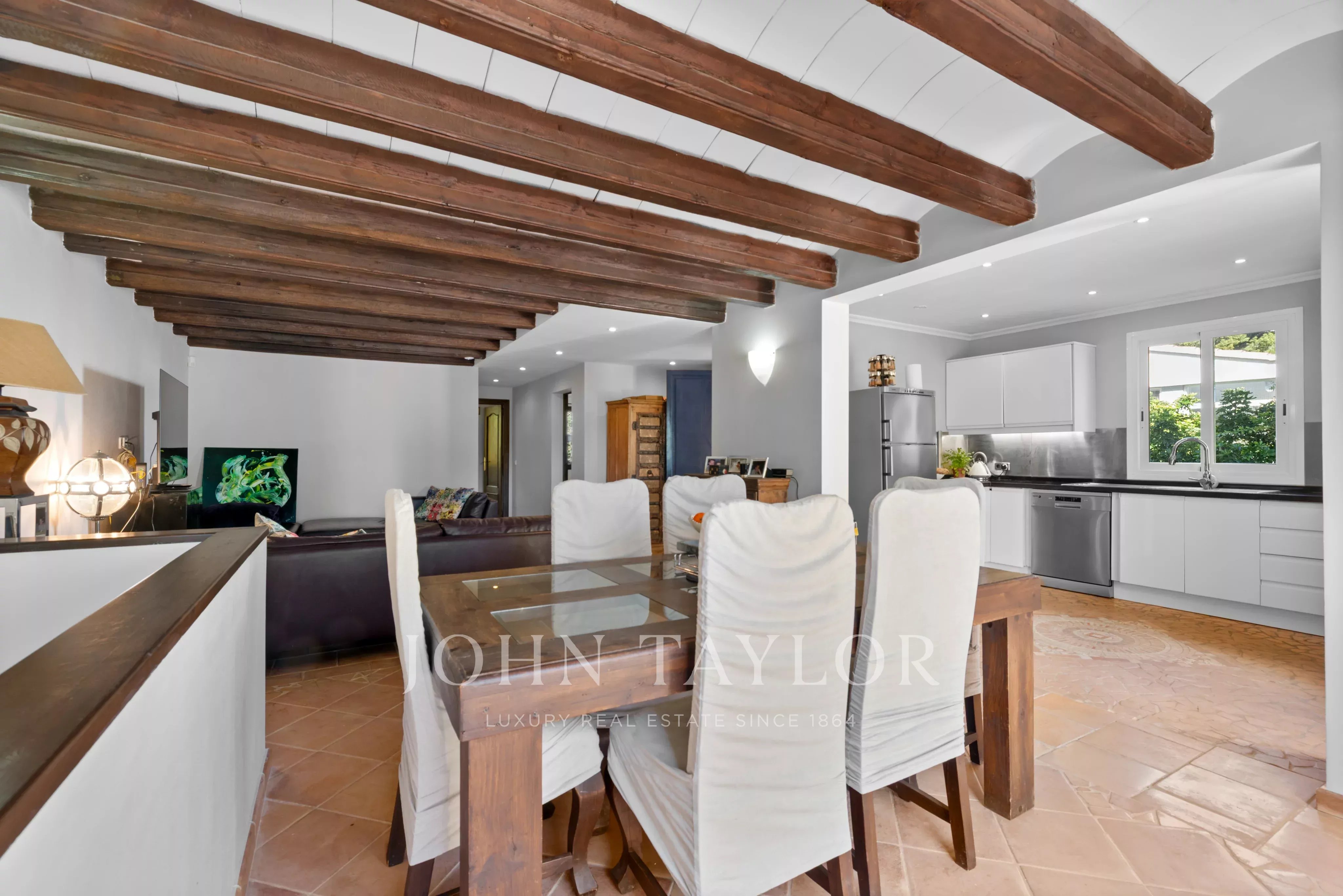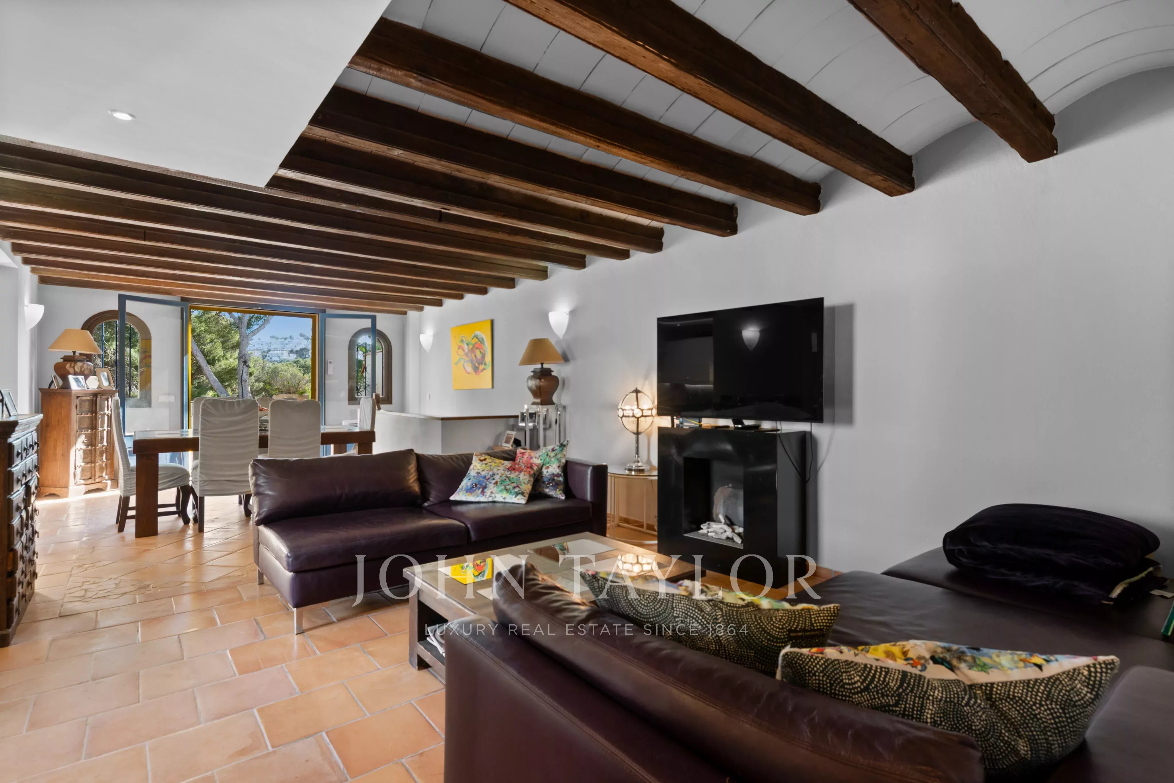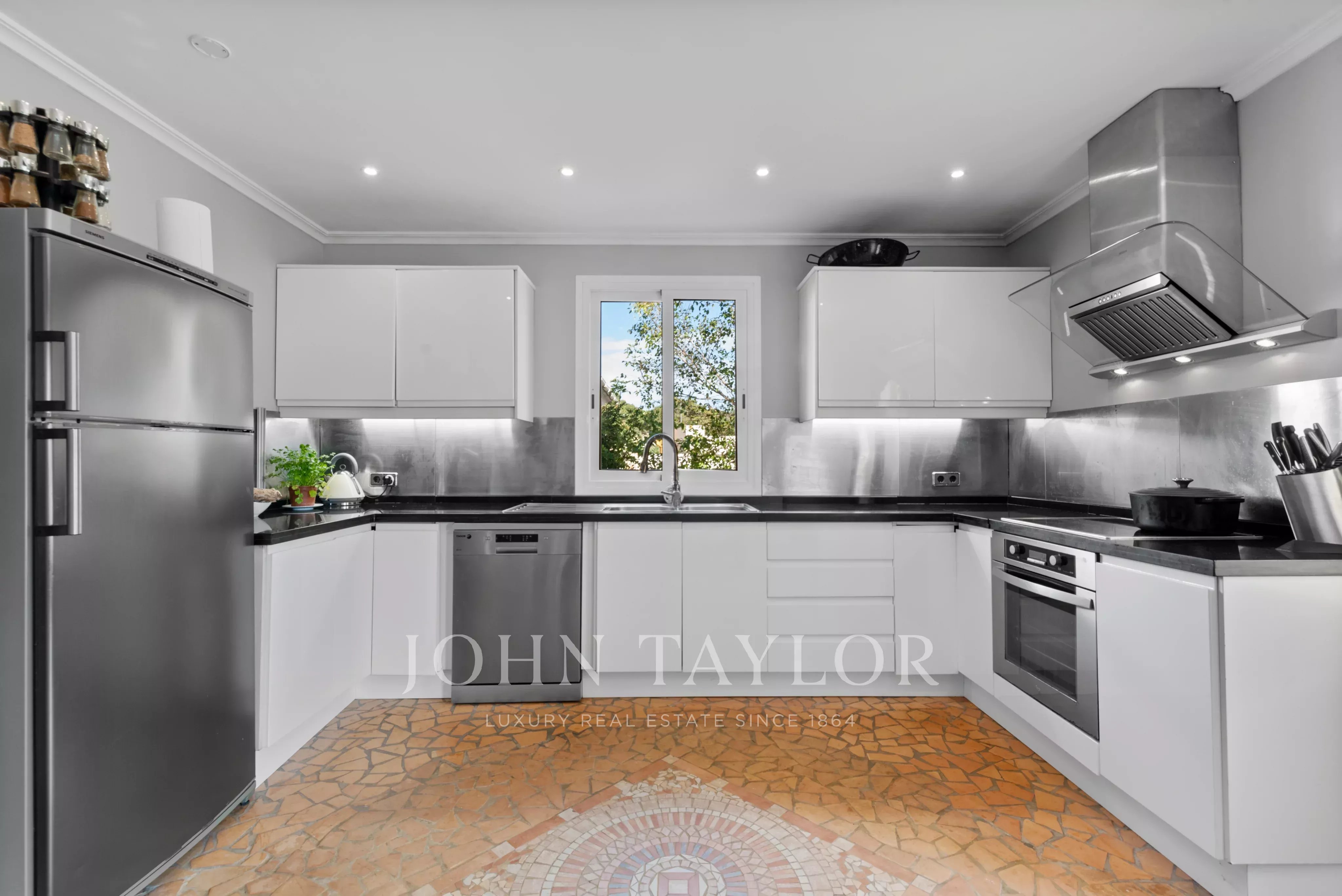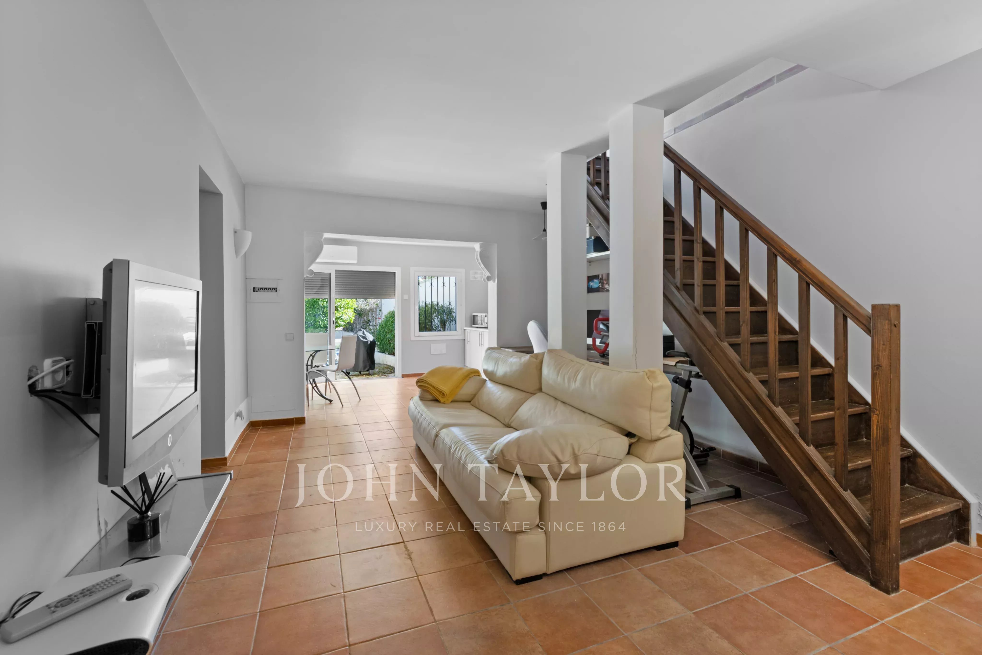 En el exterior es donde realmente se vive el estilo mediterráneo: jardín privado con piscina, varias terrazas y una cocina exterior que invita a disfrutar del aire libre durante gran parte del año. Ya sea para largas cenas de verano con amigos o para un café tranquilo por la mañana, hay rincones para cada momento.