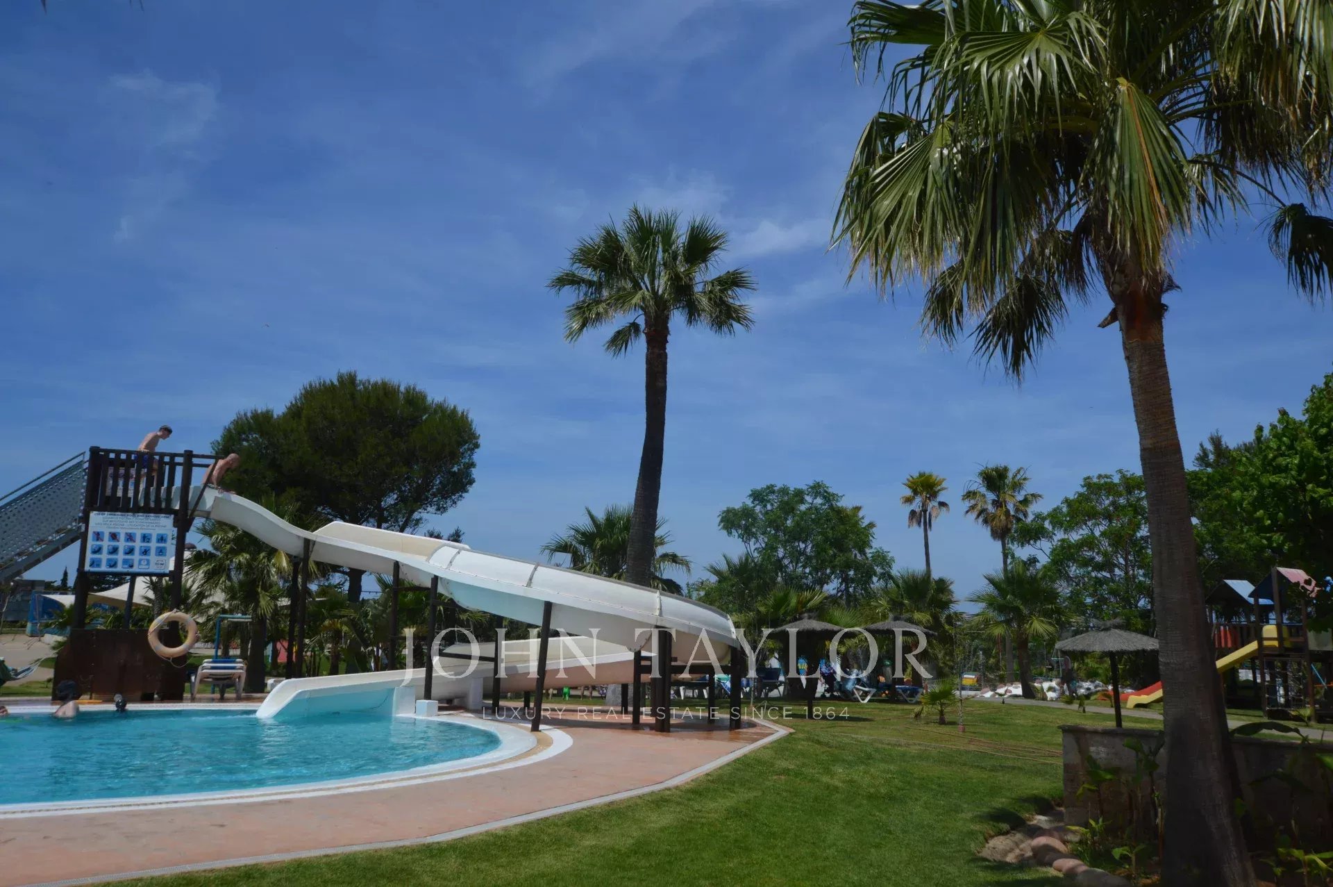 La piscina deportiva, con una profundidad de 1.20m a 1.80m, idónea para adultos que buscan diversión bajo el sol incluye un tobogán para añadir emoción a la experiencia acuática.