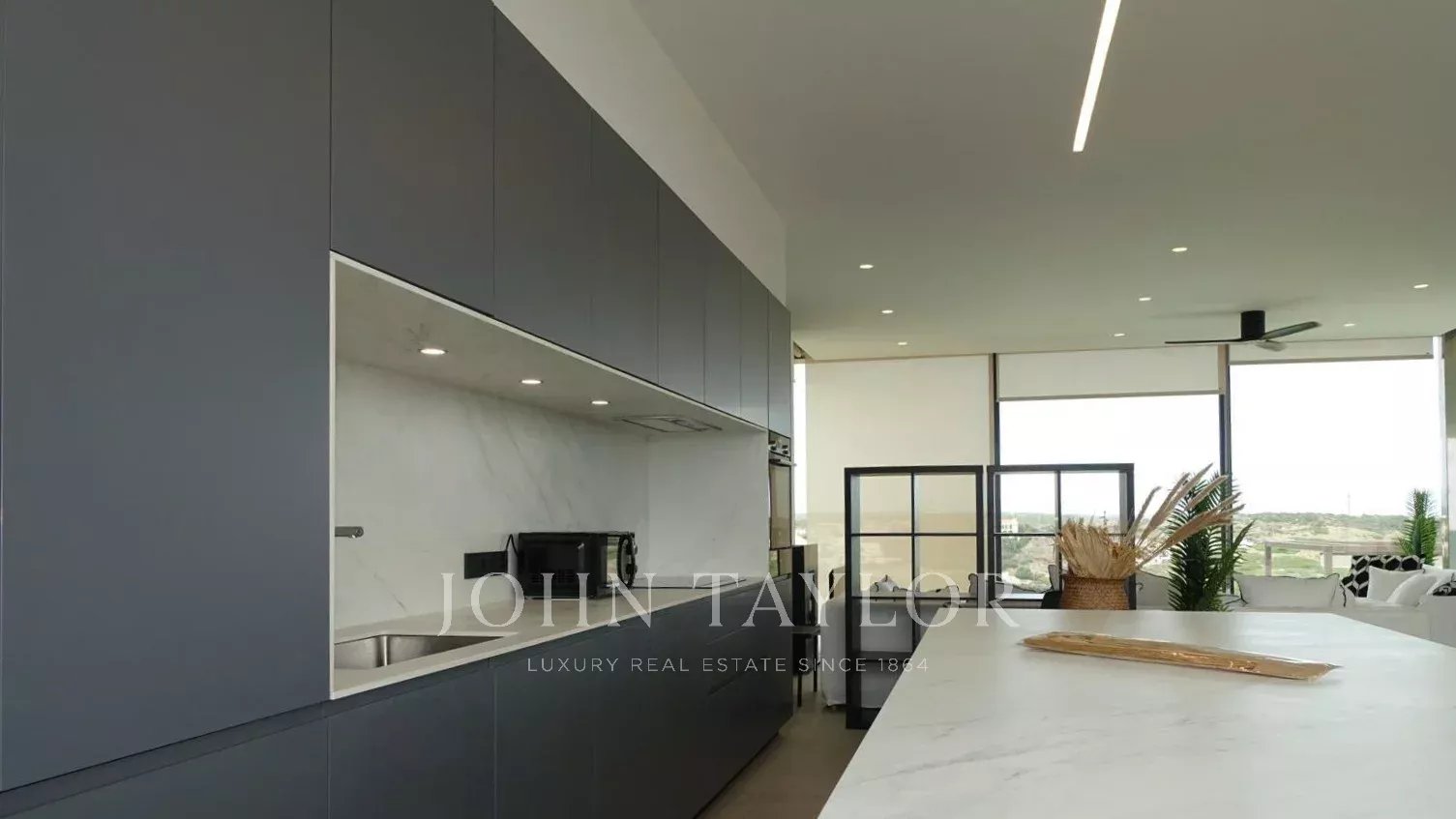 La cocina es de Porcelanosa, la isla con cascada a ambos lados y almacenaje acristalado e iluminado. La zona del salón tiene un fondo de pared de piedra Neolith en mármol negro Marquina y como en el resto de la casa, y bordeando todo el perímetro, pavimento cerámico Marazzi de gran formato.