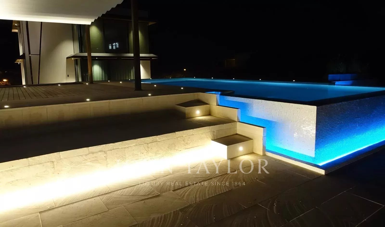 La zona de la piscina está concebida como un lugar de encuentro para la familia y los amigos, con bancos de piedra isla, en piedra Marés, y bordeando todo el perímetro. Dispone de un espacio con suelo de madera de teca y una pérgola para protegerse del sol totalmente integrada en el entorno. Esta zona está acompañada de palmeras, olivos, gauras y dispone de riego por goteo.