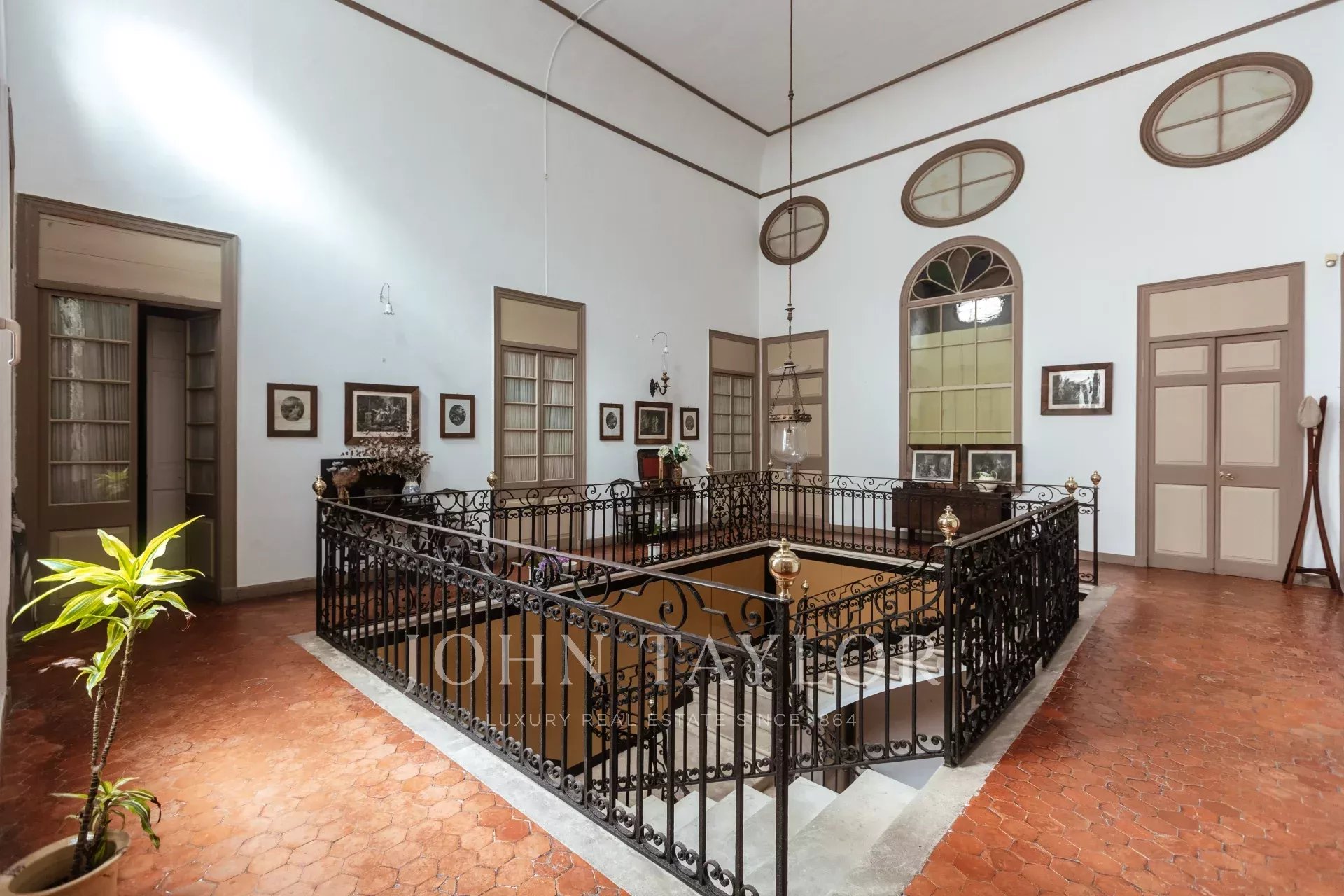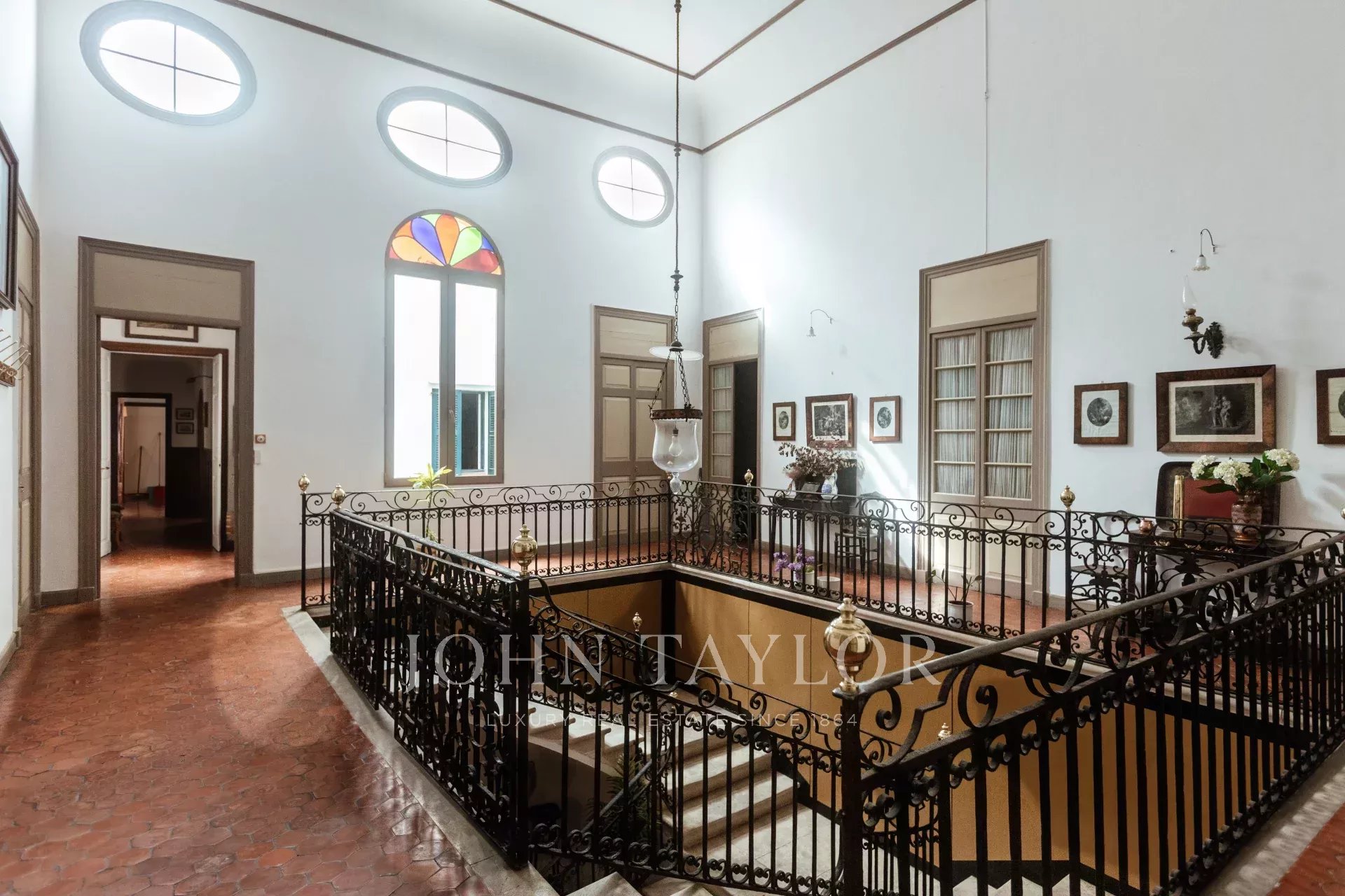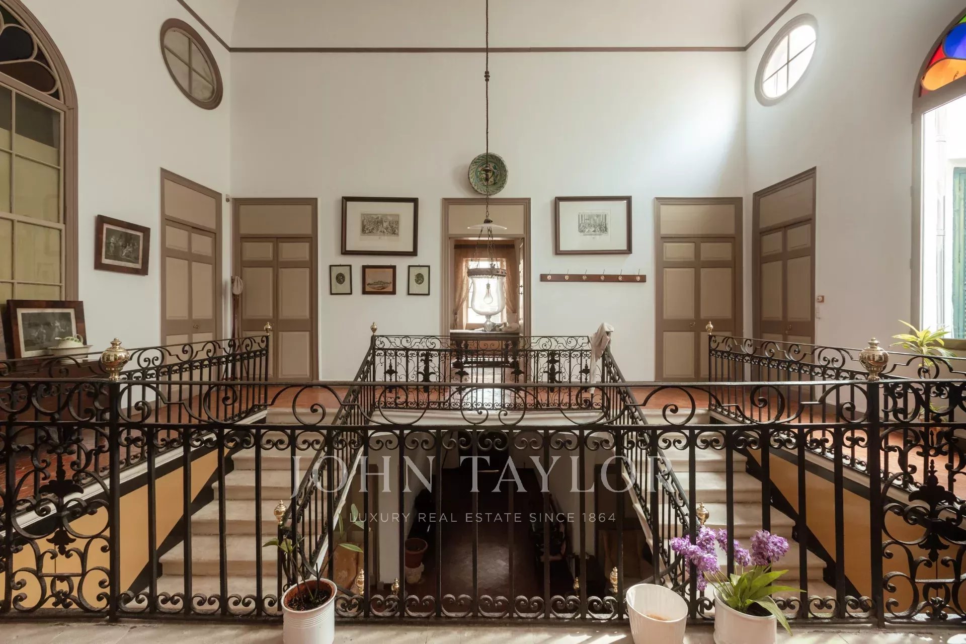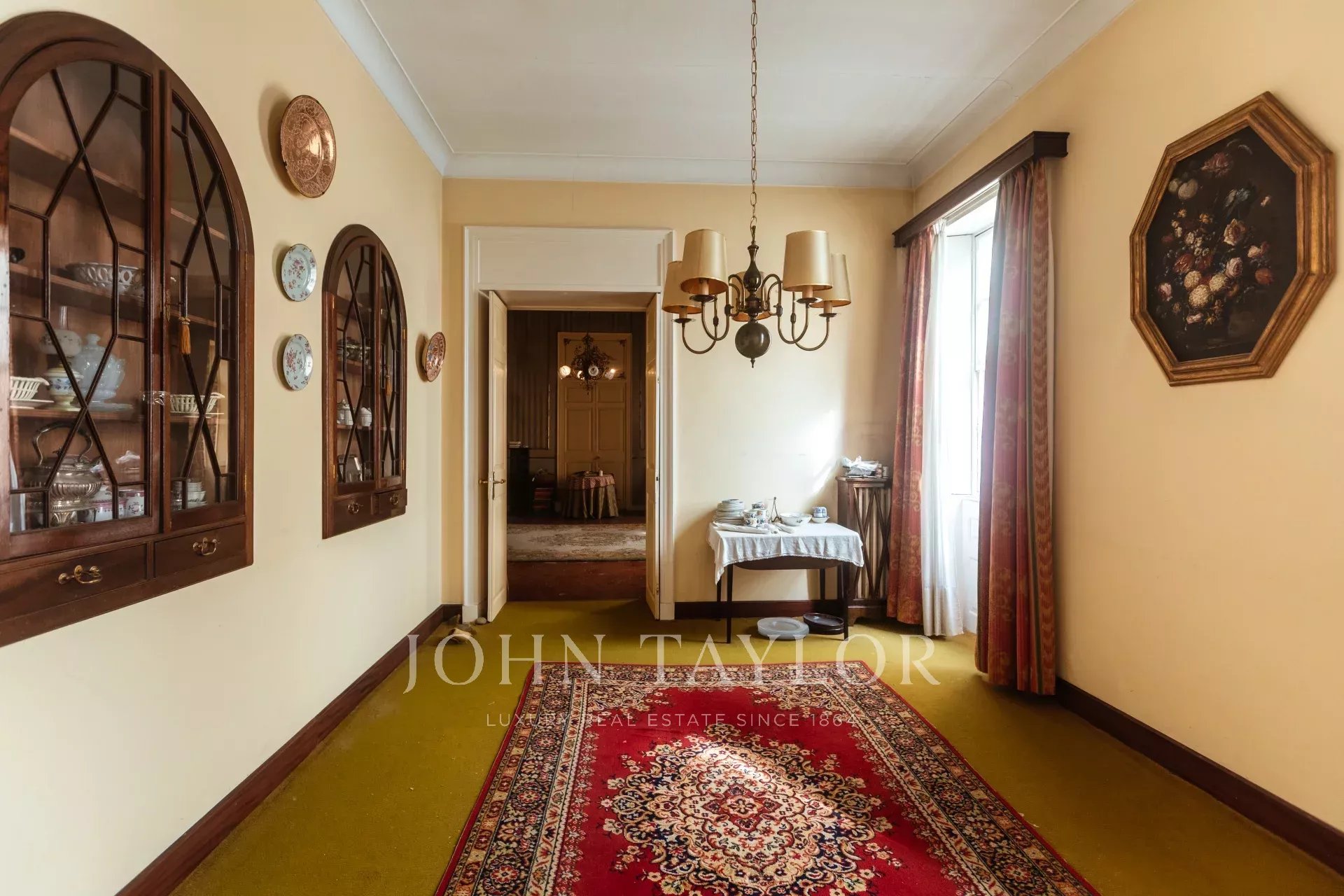 La primera planta tiene una galería central con 10 puertas que conducen a varios salones, comedores y 5 dormitorios con 4 cuartos de baño. El suelo es de baldosas originales, las ventanas son muy altas, los techos altos con decoraciones de estuco, todo ello con un toque muy distinguido y señorial. Todas las habitaciones disponen de calefacción central de gasoil.