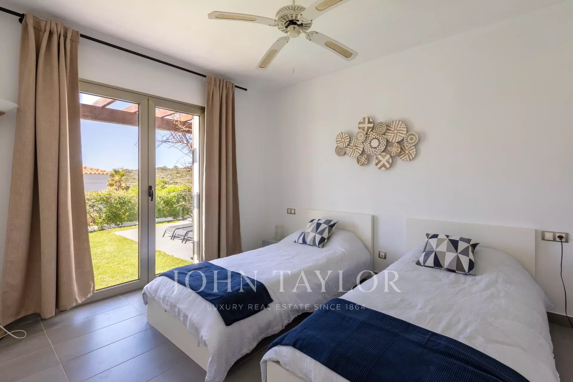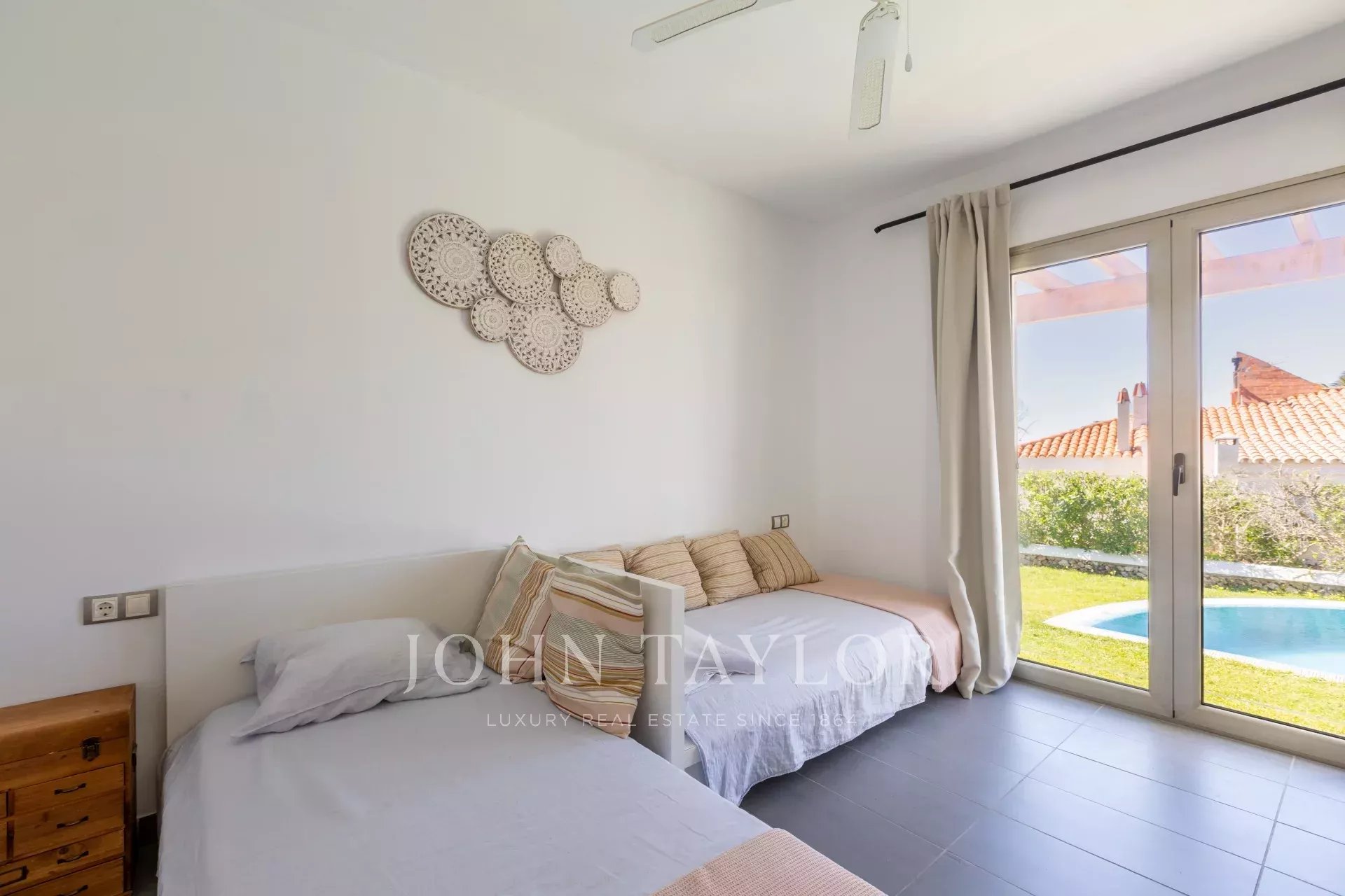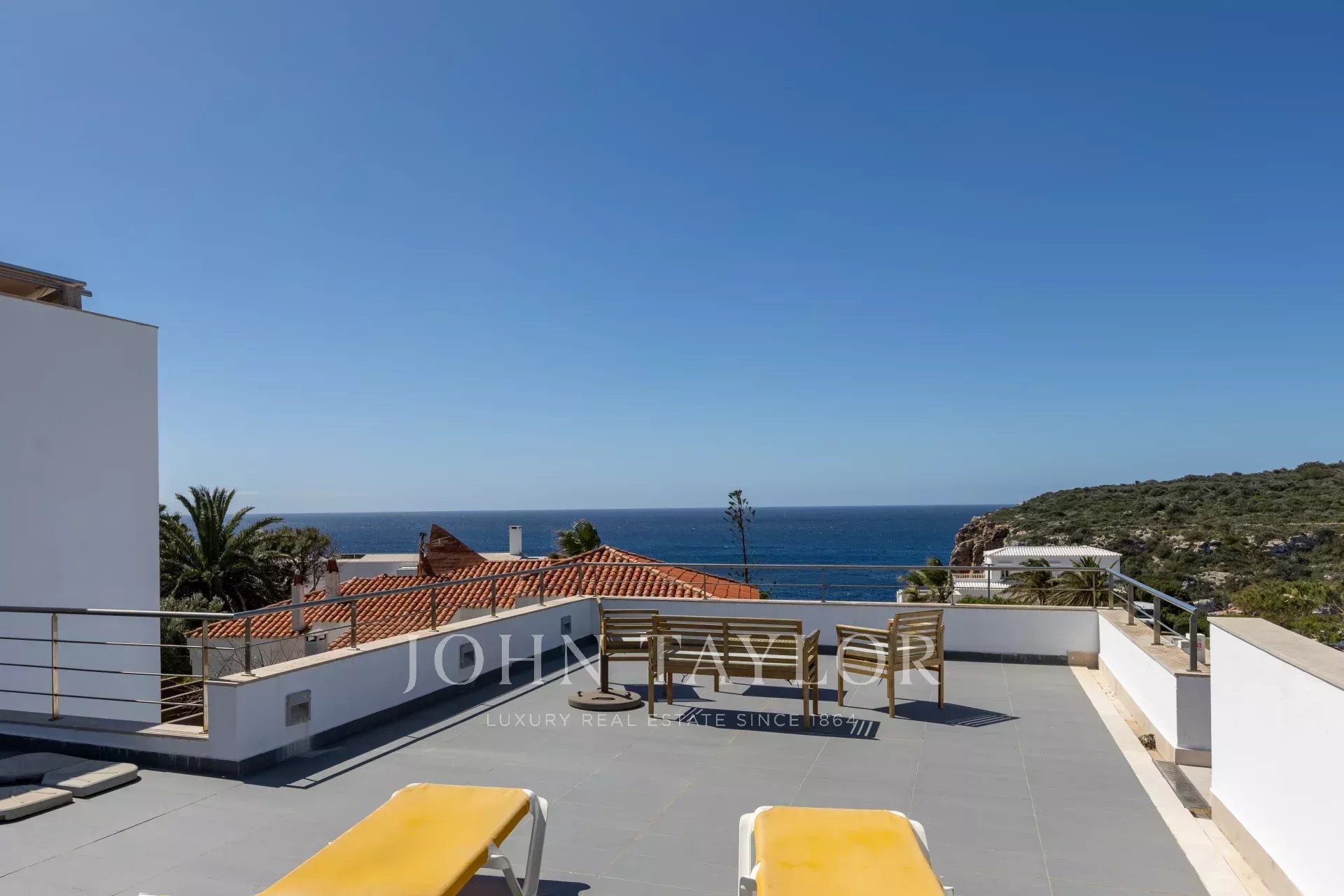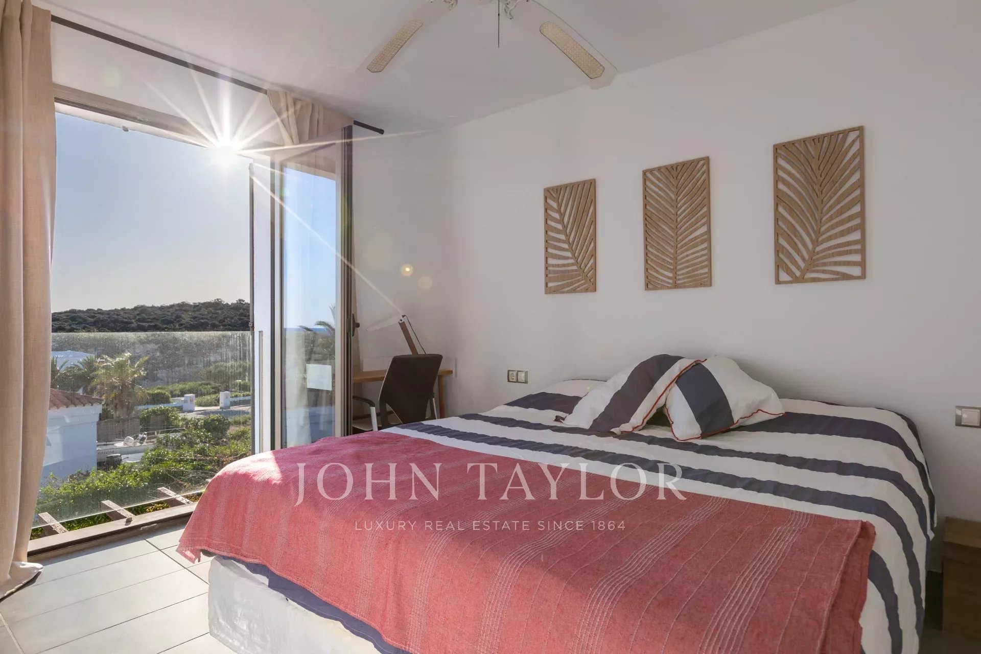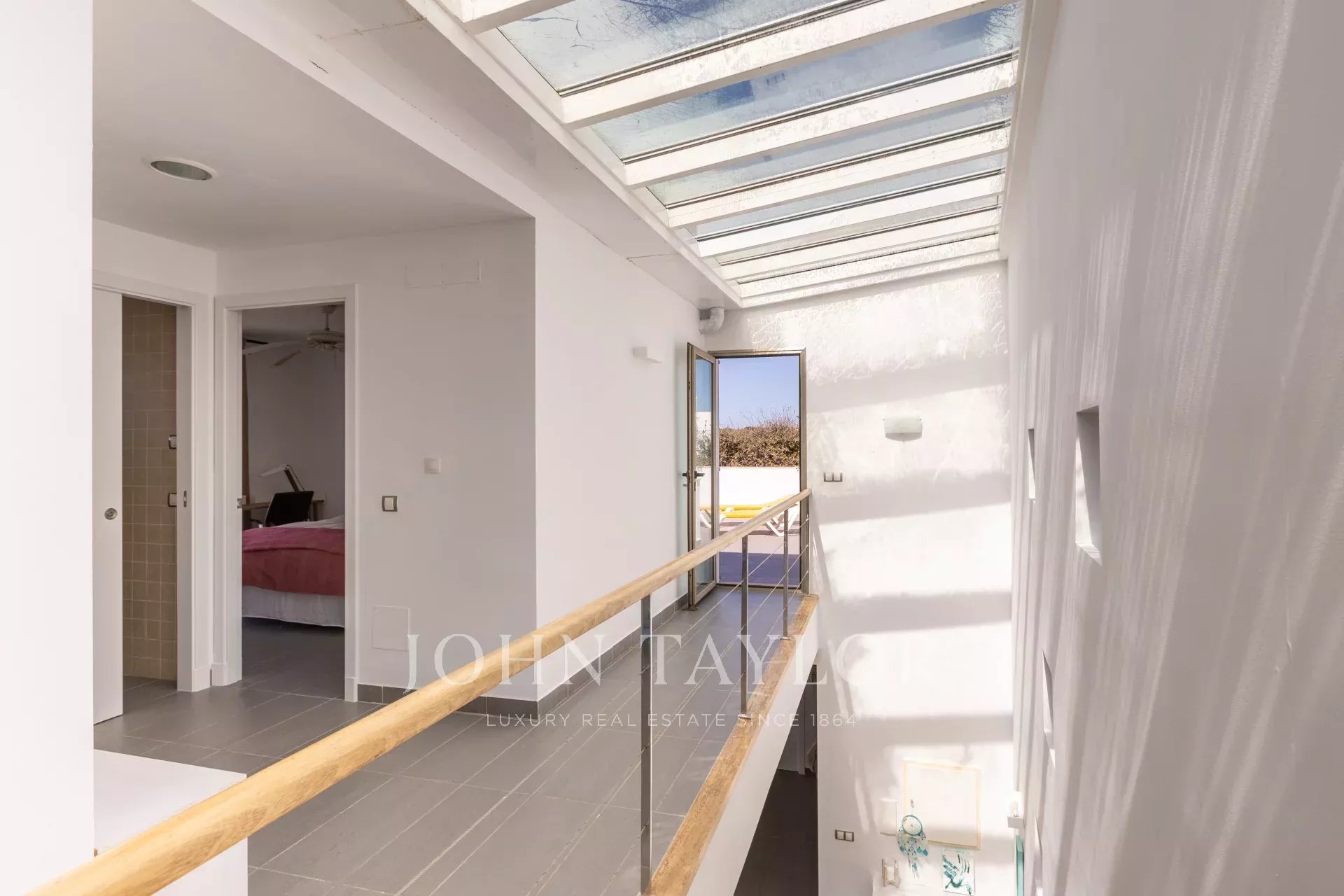 En la primera planta se encuentran otros dos dormitorios dobles con vistas al mar, un segundo baño completo y acceso a una espectacular terraza de 70 m². Este espacio ofrece un entorno privilegiado para relajarse, disfrutar de la brisa marina y contemplar unas vistas panorámicas inigualables.