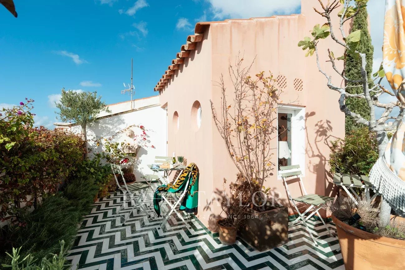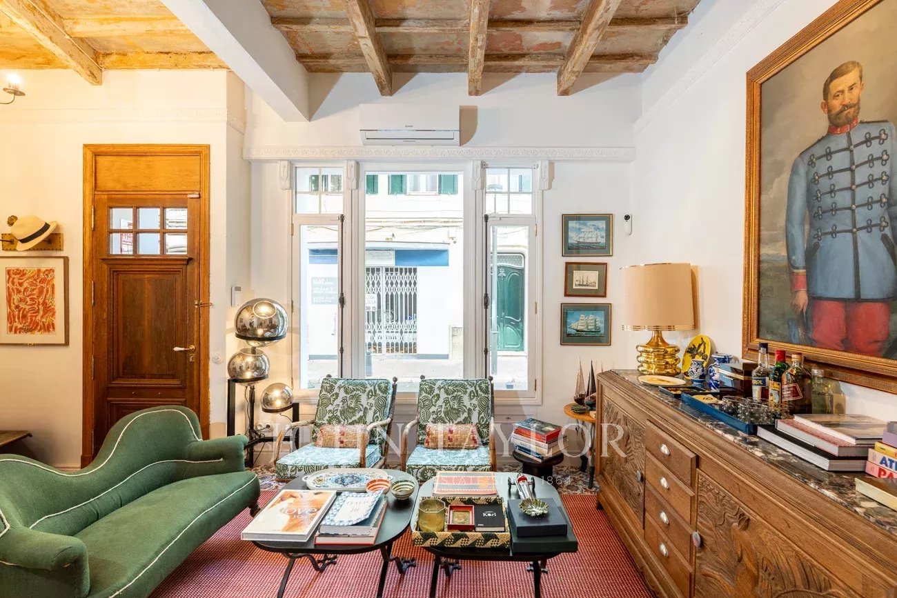 Esta extraordinaria casa de cinco plantas, con origen en el siglo XIX, se distingue por su rara disposición curva y su carácter arquitectónico singular. Su elegante escalera, que sigue la geometría orgánica del plano original, genera un flujo continuo y envolvente entre los distintos niveles. La propiedad cuenta con una terraza ajardinada en la planta superior, desde la cual se disfrutan vistas panorámicas sobre los tejados de Mahón y del histórico molino cercano, especialmente mágicas al amanecer.