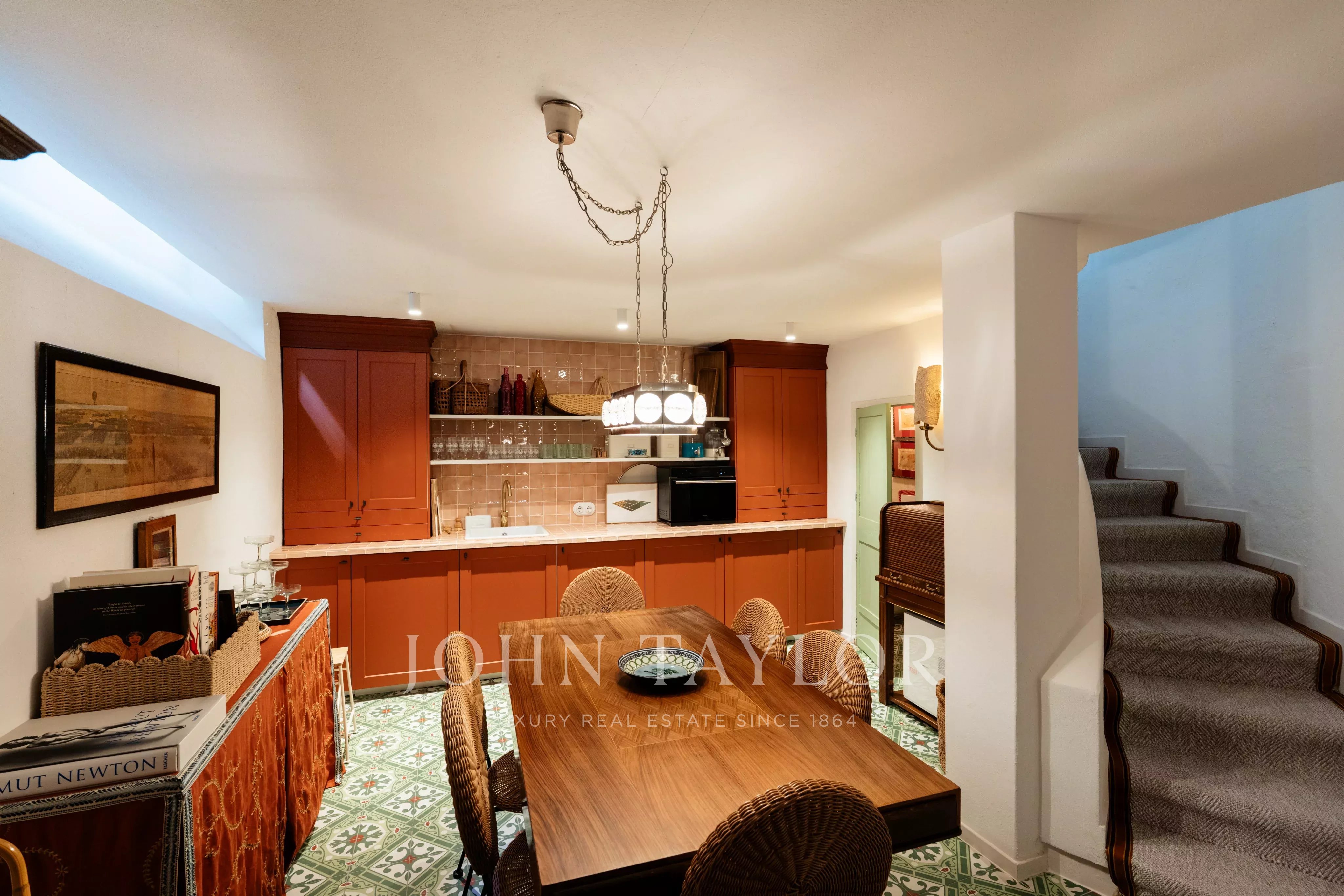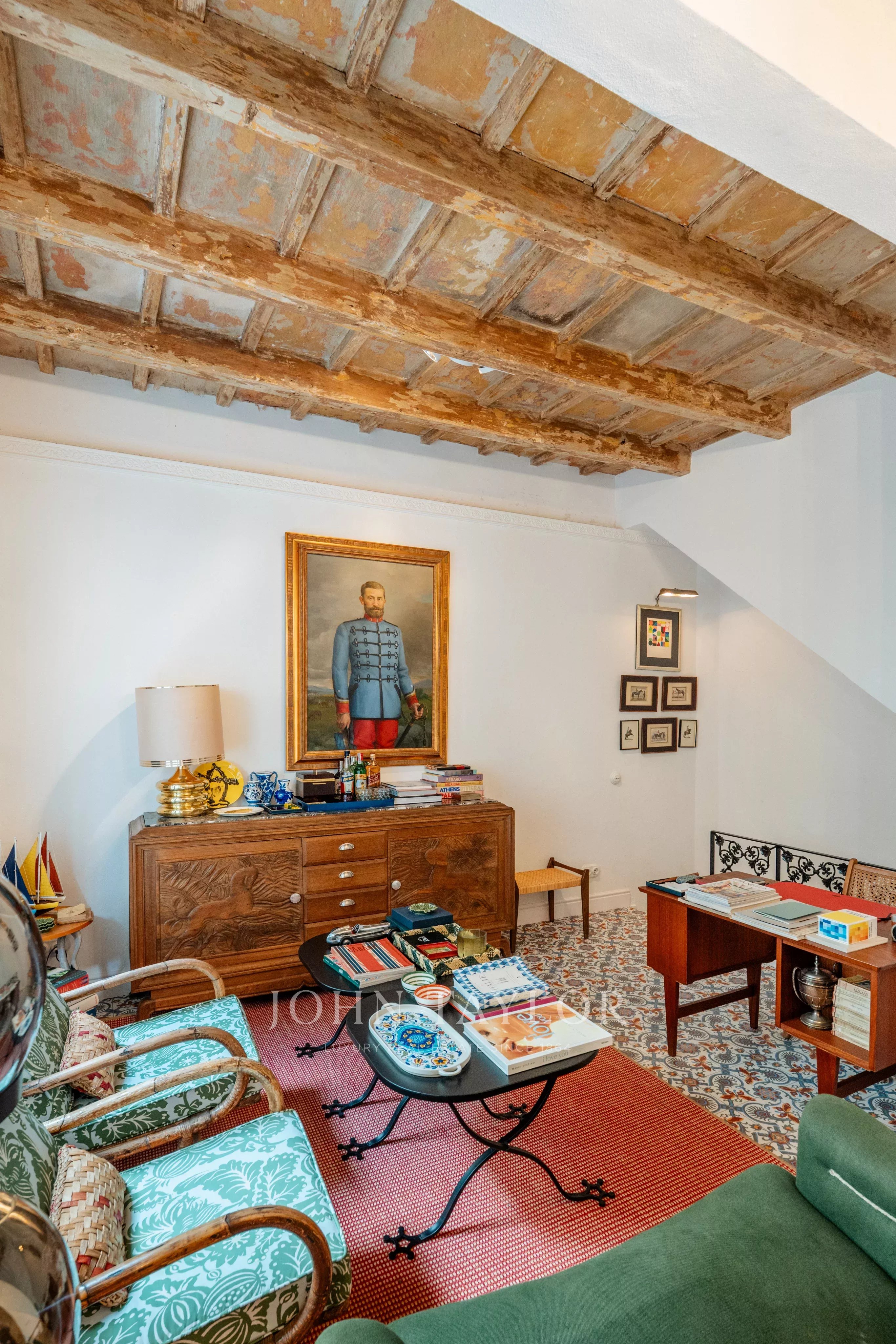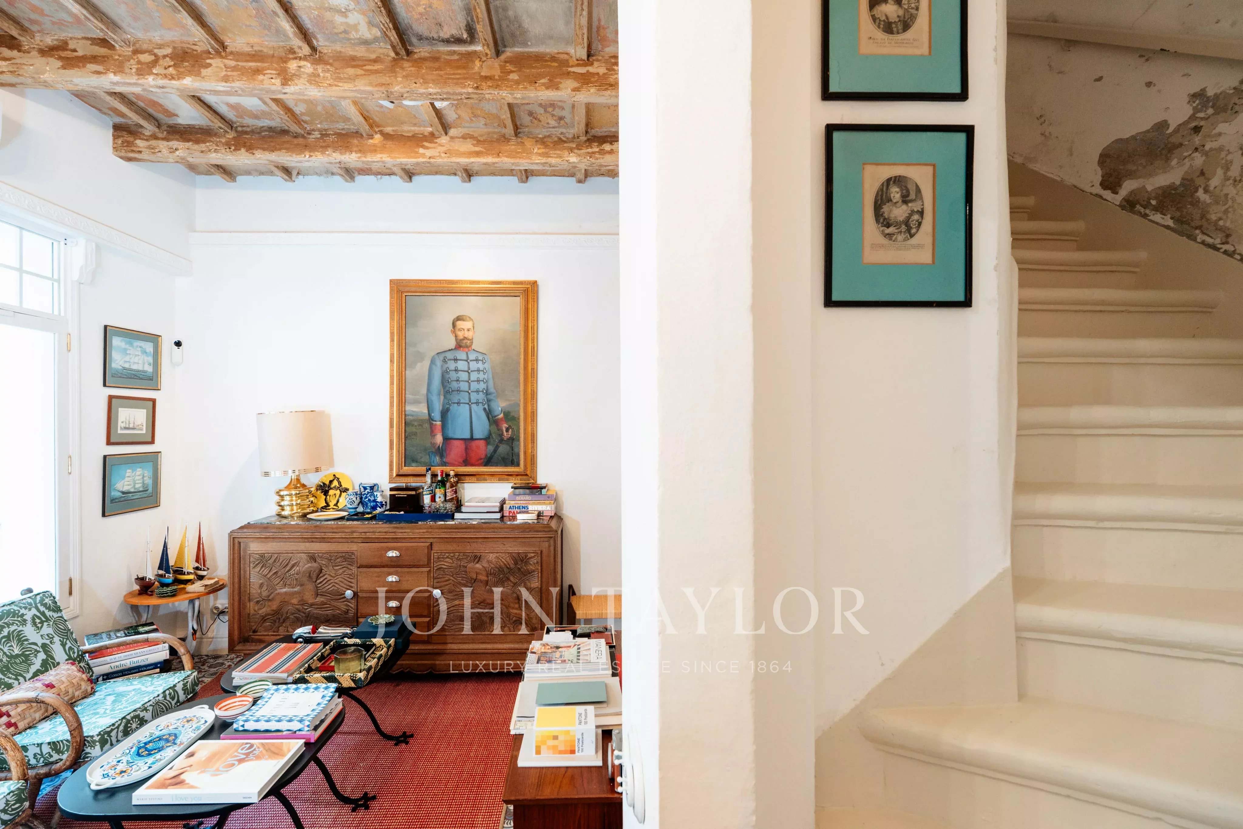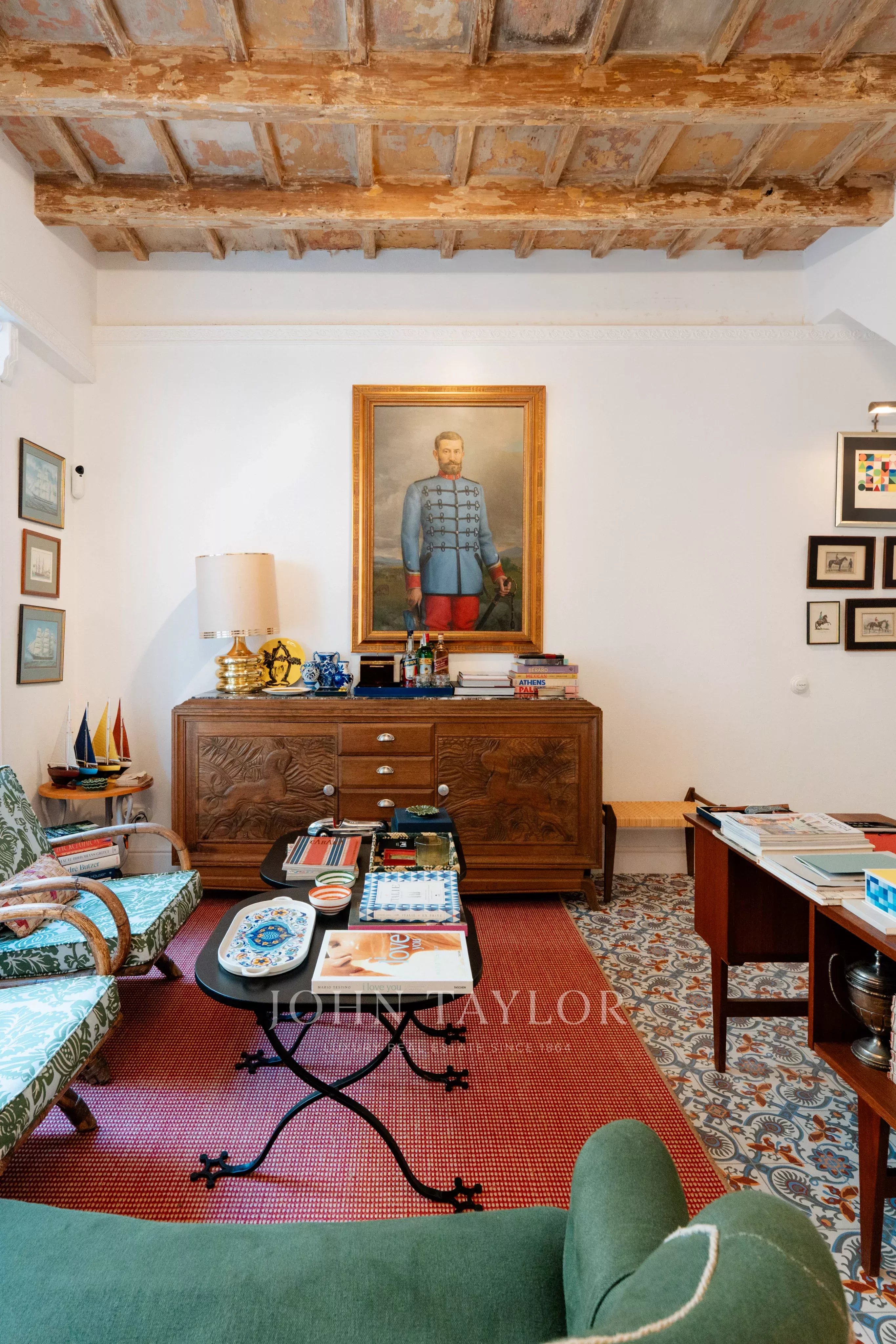 La vivienda ha sido cuidadosamente restaurada por el arquitecto e interiorista Jean Porsche, manteniendo el carácter original y combinándolo con un estilo personal refinado. Antigüedades conviven armoniosamente con mobiliario moderno y piezas de arte seleccionadas, mientras que libros, revistas y objetos personales aportan calidez y autenticidad. Cada espacio equilibra confort, funcionalidad y estética, con un cuidado excepcional por el detalle.