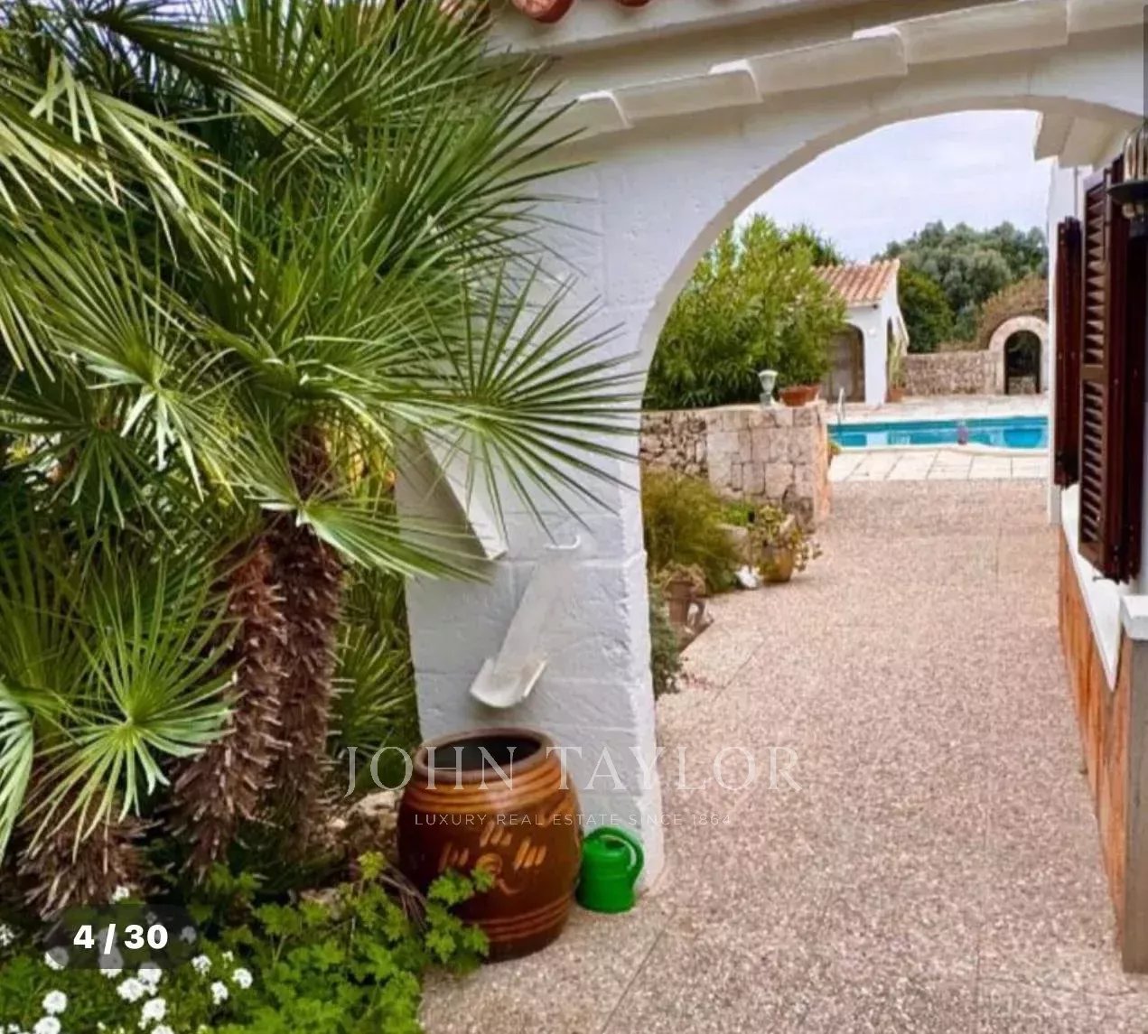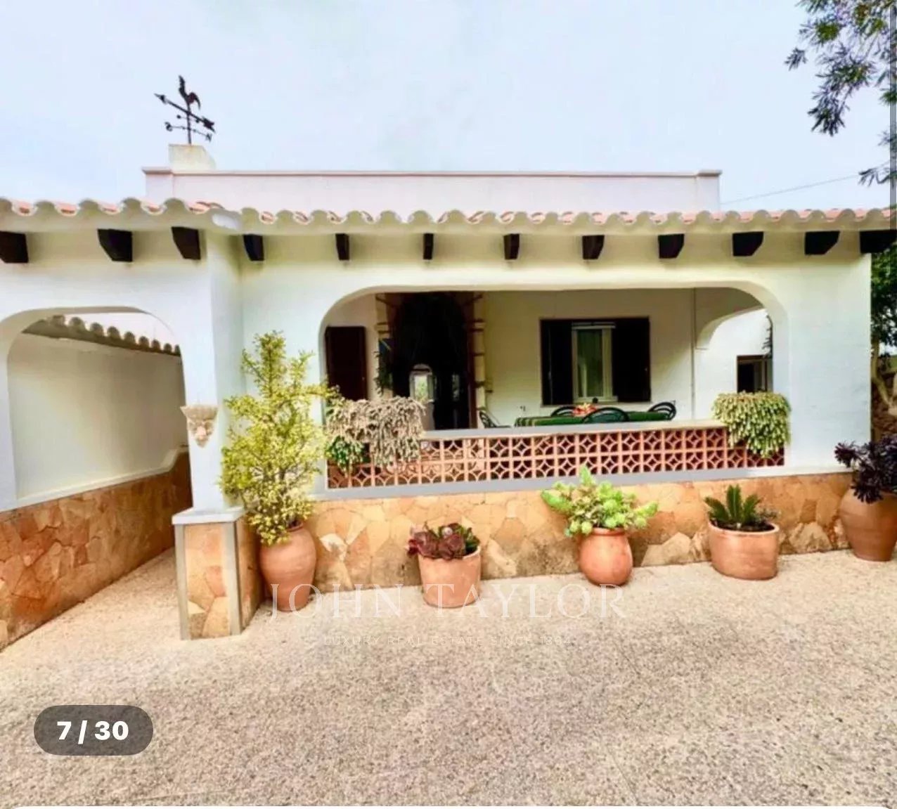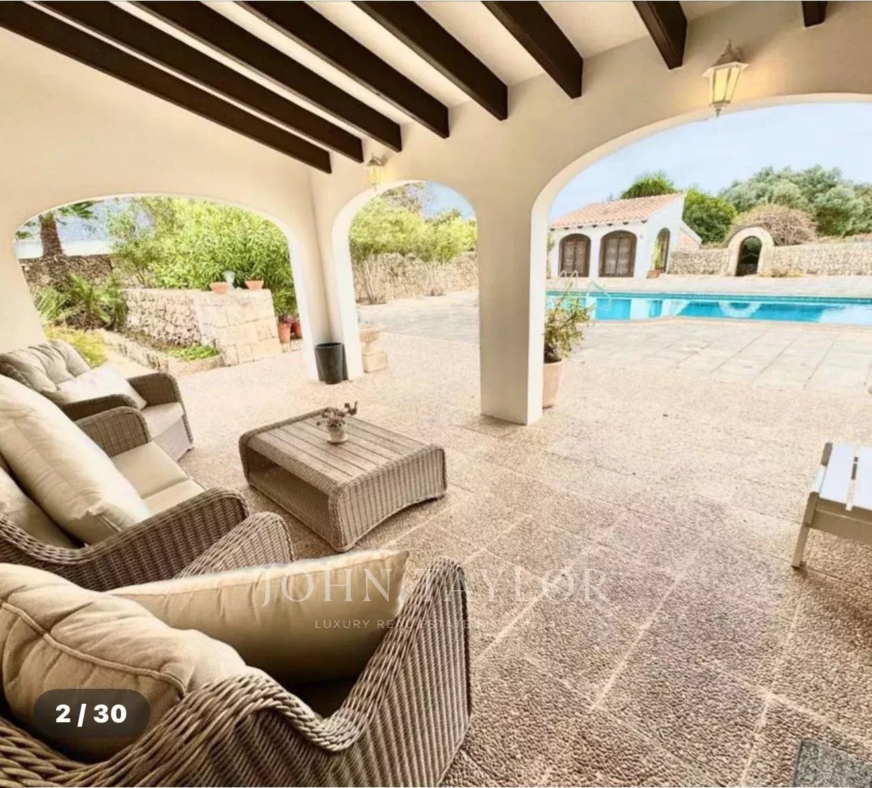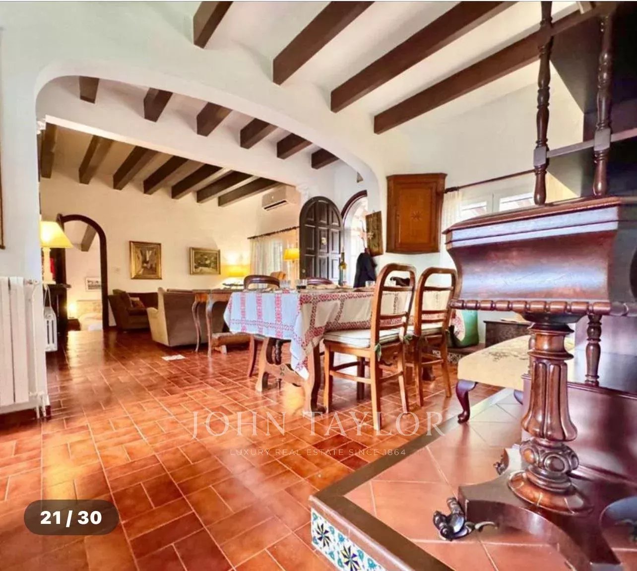 Construida sobre una amplia parcela de aproximadamente 3.370 m², la vivienda ofrece 331 m² de superficie y múltiples posibilidades para disfrutar de la vida mediterránea. Rodeada de un cuidado jardín, la casa se distribuye en una luminoso salón, cocina independiente, tres dormitorios de generosas dimensiones –uno de ellos con baño en suite– y una acogedora habitación en el sótano. Destaca su imponente comedor con acceso directo a la terraza cubierta, que conecta con el jardín y la piscina, y que podría convertirse fácilmente en un cuarto dormitorio.